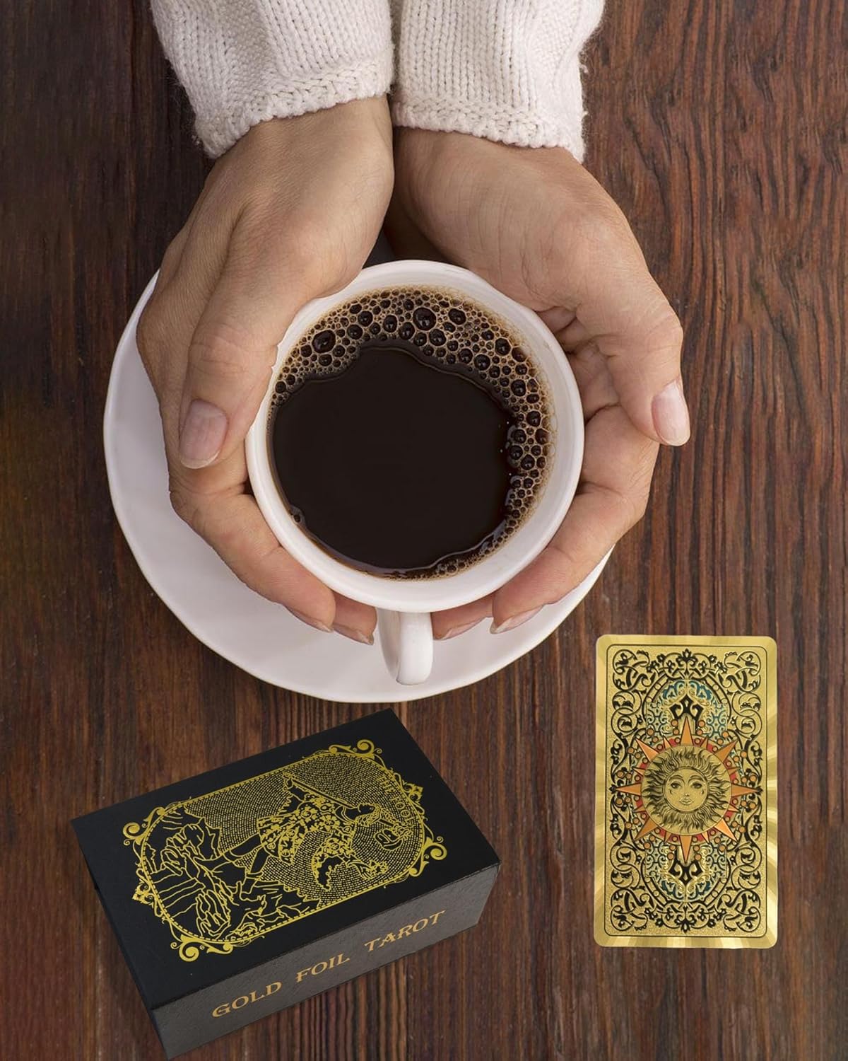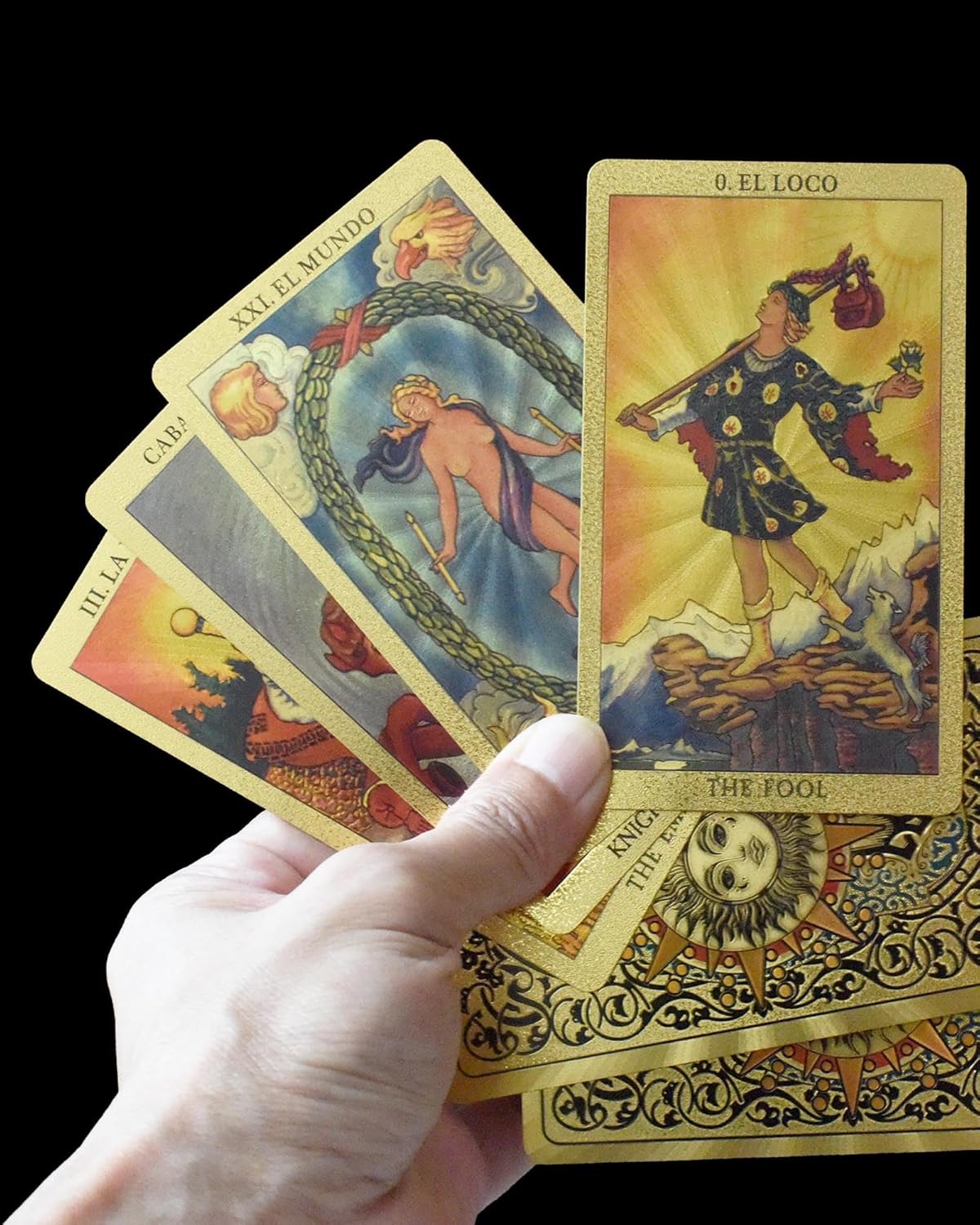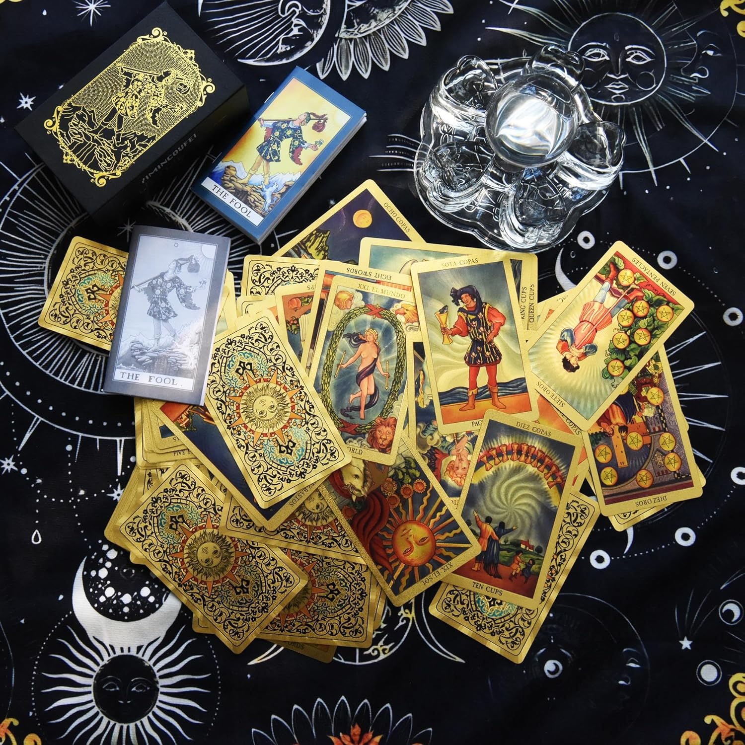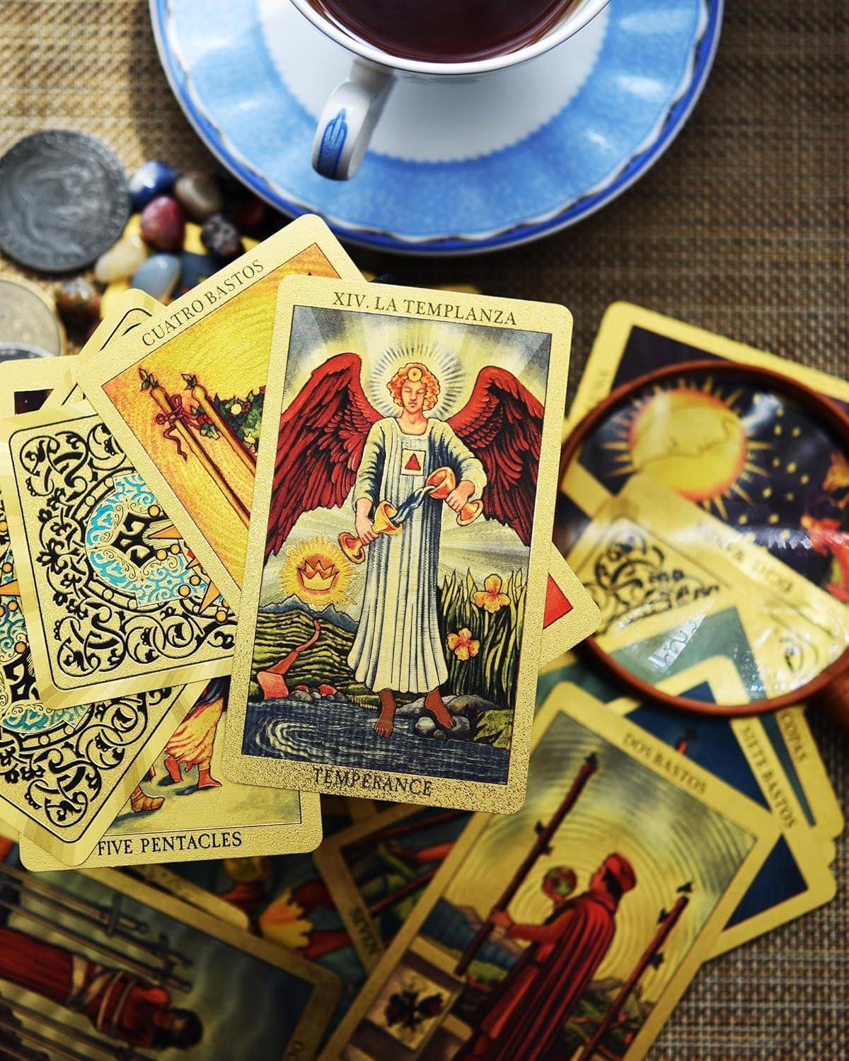 SET COMPLETO: mazzo di 78 carte dei tarocchi con testi in spagnolo e inglese, accompagnato da una guida bilingue a colori di 36 pagine Design premium: carte con elegante finitura dorata e intricati dettagli artistici, presentate in una scatola nera decorativa Materiale durevole: realizzato in PVC di alta qualità, resistente all'acqua e alle pieghe per garantire una lunga durata Guida dettagliata: manuale di istruzioni bilingue di 28 pagine che rende facile l'interpretazione di ogni carta per principianti ed esperti Formato versatile: carte con nomi in spagnolo e inglese Inglese che consente la lettura in entrambe le lingue, ideale per utenti bilingui