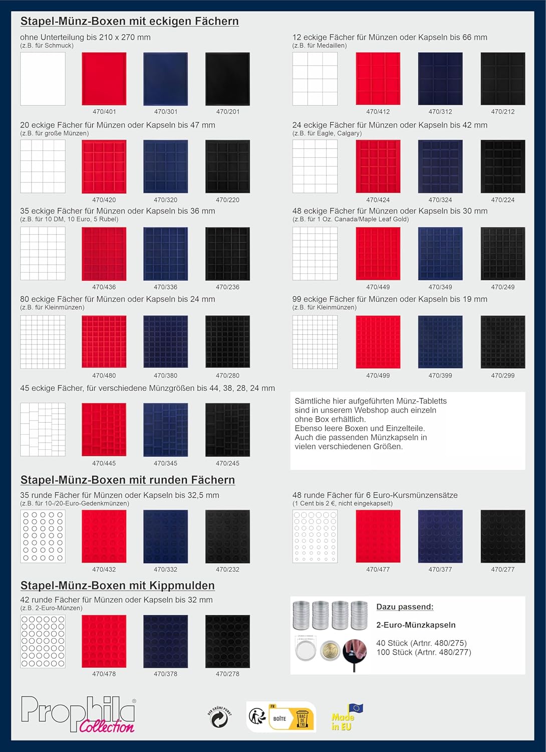 Portamonete con struttura in plastica trasparente, inserto in plastica grigia (cassetto) e inserto in velluto nero con 24 scomparti angolari. Adatto per monete fino ad un diametro di 42 millimetri. Formato: 237 x 296 x 22 mm. Completamente combinabile con Leuchtturm, Lindner ...