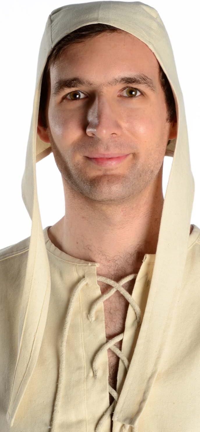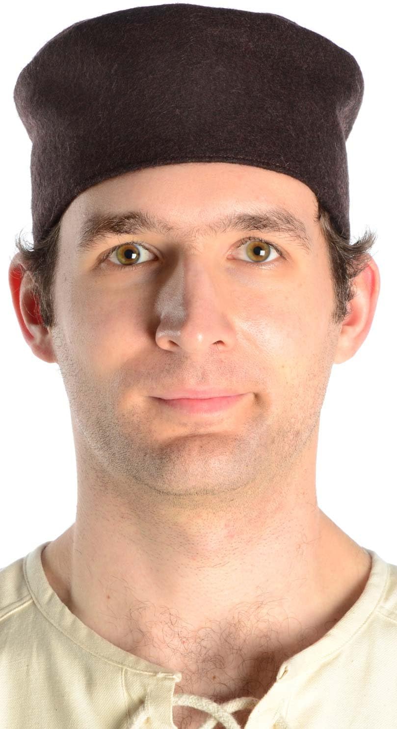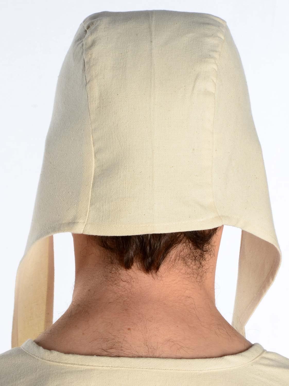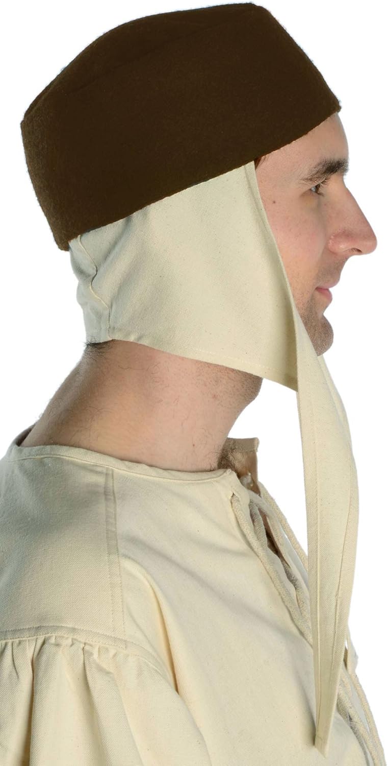 medievale in feltro in set con il tiro di cappa beige con lacci in cotone resistente – in combinazione indossato. Cappa medievale in 100% cotone in beige. Materiale: esterno in feltro di lana di pecora (65% cotone, 14% poliestere, 11% poliacrilico, 5,5% Nylon, 4,5% cotone), Interno 100% cotone. Offriamo questo tappo in 2 taglie AN M e L, circonferenza della testa M 58 cm – L 60.