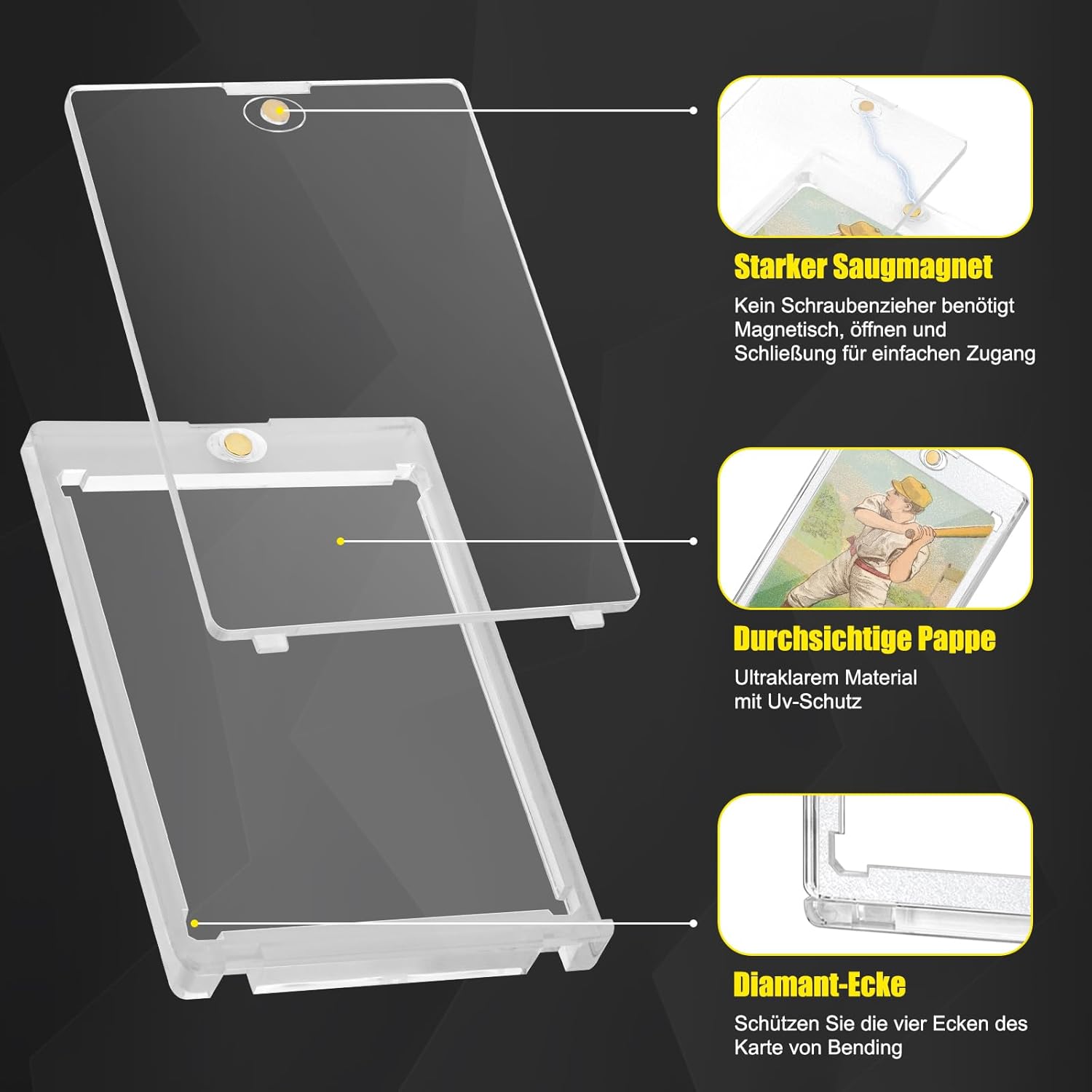 Protezione professionale con chiusura magnetica:Il portacarte magnetico Meetory (7,29 x 8,90 x 0,10 cm) combina uno spessore robusto di 130 pt con una chiusura magnetica sicura. Perfetto per carte, pezzi da collezione TCG e carte sportive: protegge efficacemente da pieghe, polvere, acqua e raggi UV. Il design innovativo consente un'apertura rapida senza manipolazioni noiose, ideale per tornei, viaggi o conservazione sicura a casa. Protezione UV e nitidezza Blu-ray per il valore da collezione:I nostri portacarte magnetici hanno un rivestimento anti-UV e una superficie ultra-trasparente tipo Blu-ray, che previene lo sbiadimento anche sotto luce intensa o in vetrine. Gli angoli rinforzati a diamante proteggono le carte dagli angoli piegati, mentre lo spessore di 130 pt blocca i danni fisici. Ideale per edizioni rare o carte nostalgiche preferite Tecnologia di sicurezza avanzata:La serie di portacarte magnetici Meetory offre una doppia protezione: la chiusura magnetica blocca umidità e impronte digitali, mentre gli angoli rinforzati a rombo prevengono pieghe anche in caso di urti. Ideale per i giocatori che proteggono i loro mazzi o per i genitori che vogliono preservare le carte dei bambini dai danni quotidiani Design elegante per l'orgoglio del collezionista:Questo portacarte magnetico non è solo una protezione, ma anche un oggetto da esposizione! La superficie trasparente tipo Blu-ray esalta i colori delle tue carte, mentre il bordo opaco aggiunge un tocco professionale. Perfetto per mostre, foto sui social media o vetrine: preserva sia il valore che l'estetica della tua collezione Versatilità e praticità:Progettato per l'uso quotidiano, questo portacarte magnetico si adatta alle esigenze di collezionisti esigenti, giocatori di tornei o appassionati che desiderano archiviare le loro carte con eleganza e sicurezza
