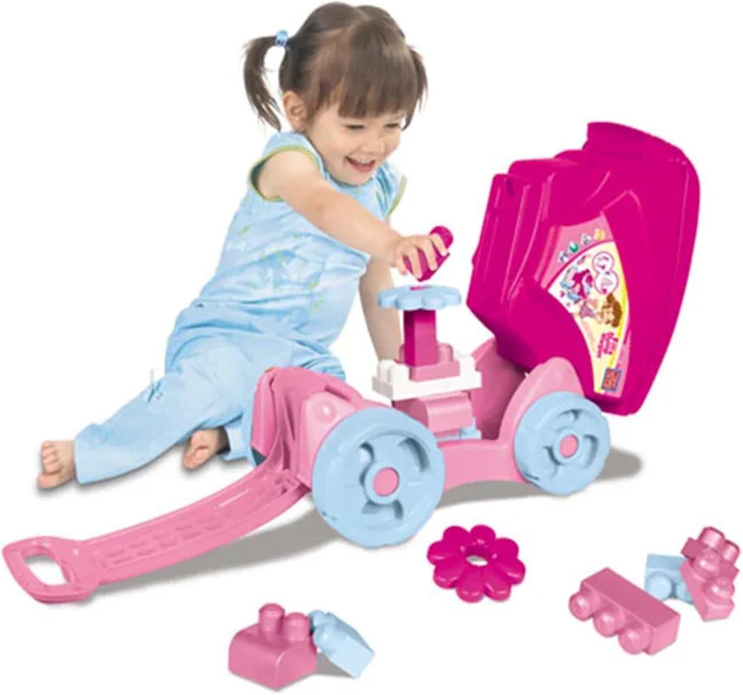 Contenitore ribaltabile per riempire e viaggiare Maniglia di traino facile da impugnare Ruote robuste e confortevoli 20 (circa) grandi blocchi per una creatività infinita Incoraggia la creatività e allena le capacità motorie fini