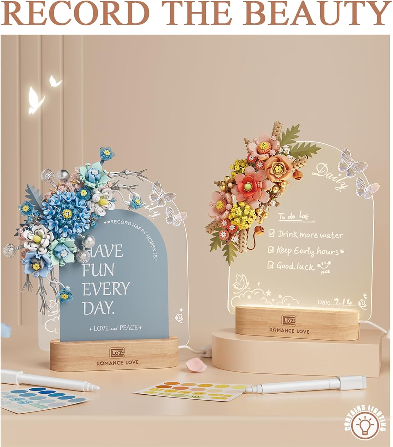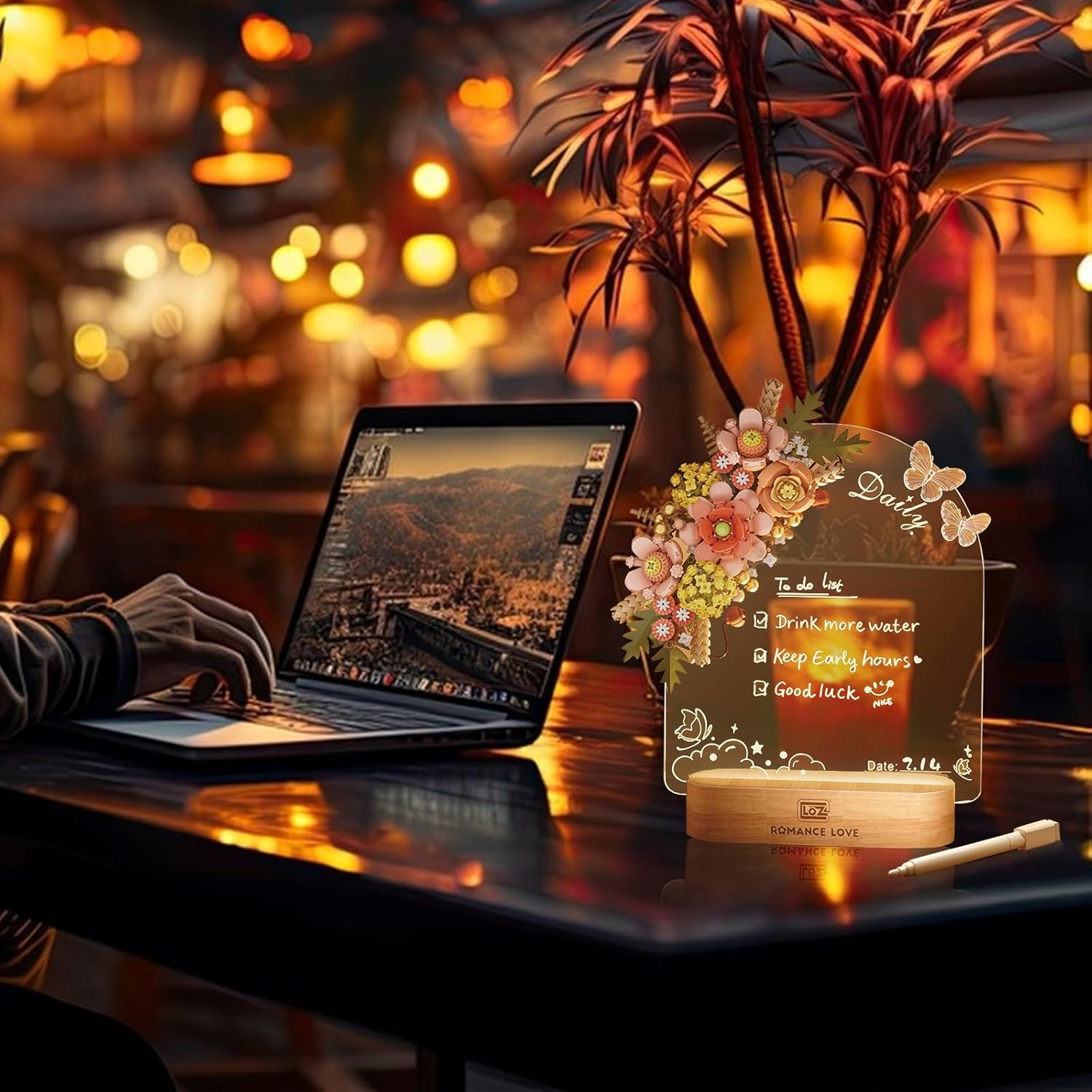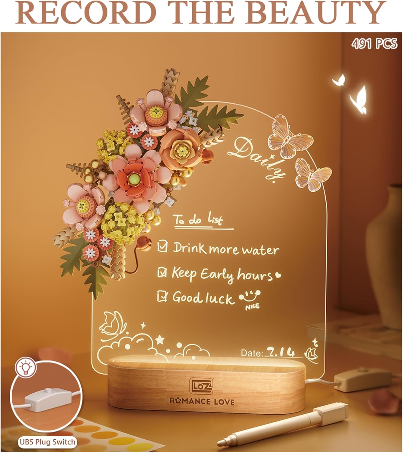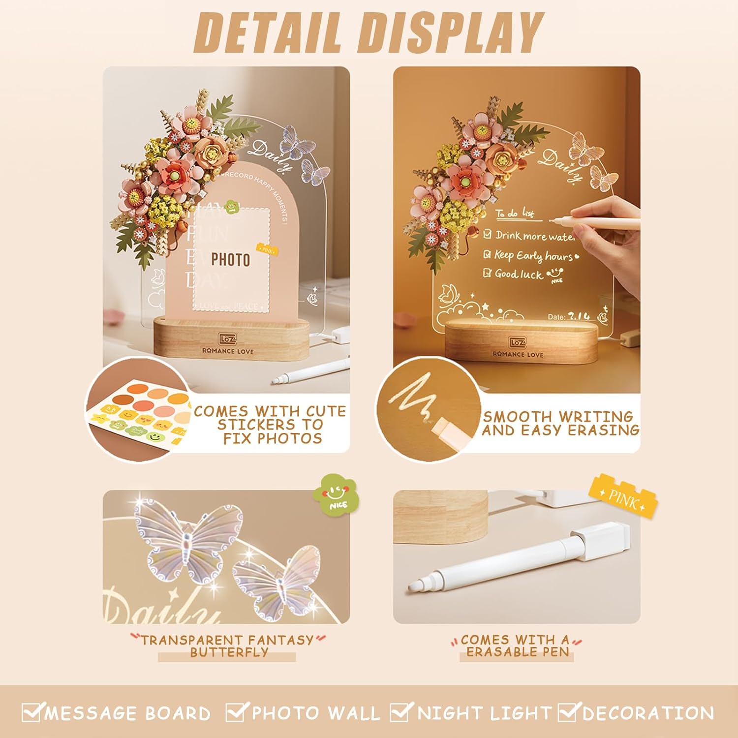 Design 3 in 1: blocco di costruzione, lavagna cancellabile a secco. Combinazione di lavagnetta acrilica e base in legno. È un buon regalo da utilizzare come bacheca accattivante, piccolo tavolo da disegno per bambini. Decorazione creativa: crea il kit di costruzione come display per il tuo ufficio, libro stesso, scrivania e spazio. Mettere il modello di bacheca di fiori carino ovunque tu voglia. Accendere la luce di notte porterà una sensazione diversa. Materiale di alta qualità: questo kit è realizzato in plastica ABS di alta qualità adatta ai bambini, facile da montare e smontare. L'ultimo design per il modello carino e unico aiuta a sviluppare l'immaginazione e le capacità motorie dei bambini. Il modello misura circa 23 x 7 x 26,5 cm. Migliora le diverse abilità: facile da montare, non richiede forbici o colla, sicuro da montare. Difficile kit puzzle 3D per lo sviluppo del cervello. Può sviluppare il pensiero logico, la pianificazione strategica, l'osservazione visiva e la percezione spaziale nei bambini o negli adulti. Allo stesso tempo, eserciterai la tua pazienza e cautela, e alla fine completerai la sfida del puzzle. Miglior regalo: ogni fan del fai da te o dell'arte e dell'artigianato adorerà questo set creativo; il modello di simulazione fai da te e decorato in modo colorato farà una vacanza emozionante, compleanno, Natale, Capodanno o regalo in qualsiasi momento per ragazzi e ragazze. È adatto anche per arti e mestieri fai da te, ottima idea regalo per premi scolastici, ecc.