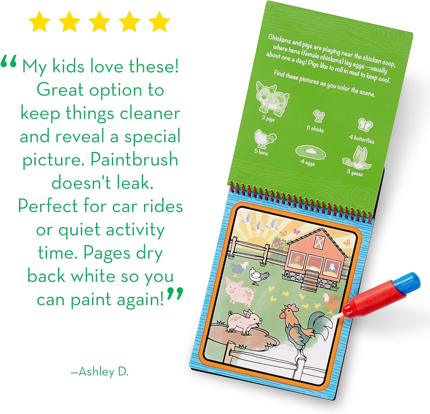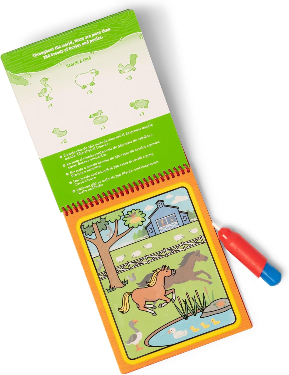 LIBRO CON PENNA MAGICA - Il libro da colorare con acqua include una penna magica per bambini ricaricabile e quattro scene a tema fattoria - Bagna il foglio con il pennarello ad acqua e la scena prenderà vita, lascialo asciugare e la scena tornerà bianca GIOCHI EDUCATIVI 3 ANNI - Il magic book bambini aiuta a sviluppare le abilità motorie, la coordinazione e l'espressione creativa - Intrattieni i tuoi bimbi lontano dagli schermi con i fogli magici e le attività di ricerca nel libro pennarello magico BAMBINI CREATIVI - Il set da colorare per bambini è ottimo per bambini creativi a cui piace colorare e dipingere - Completa la loro esperienza di gioco con un altro album magico, o un libro stickers Melissa & Doug GIOCATTOLI BAMBINO 3 ANNI - Melissa e Doug realizzano giocattoli di qualità da 30 anni, tra cui libri ad acqua da colorare bambini, mini album da colorare per bambini, pennarelli magici acqua e altri giochi da colorare per bambini