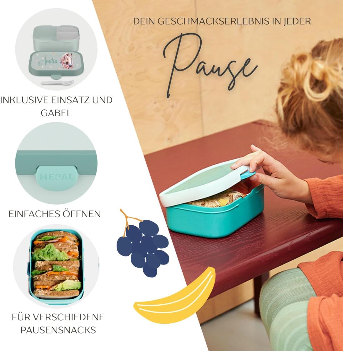 Contenitore per il pranzo personalizzato: Mepal contenitore per il pranzo con stampa colorata e nome. Clicca sul pulsante giallo "Personalizza ora" e personalizza un vero pezzo unico. Design intelligente: contenitore per il pranzo per bambini con scomparti e inserto Bento con forchetta. Perfetto per porzionare diversi snack come yogurt, frutta, salse o caramelle. Chiusura a clip per bambini e facile da aprire. Pratico nella vita di tutti i giorni: perfetto per la scuola, l'asilo o per gite e viaggi. Il contenitore per il pranzo è a prova di perdite e può quindi essere trasportato in modo ideale nello zaino della scuola. Stampa certificata: la personalizzazione e il motivo colorato sono bambini e rispettosi dell'ambiente. Il corpo del contenitore è lavabile in lavastoviglie. Il regalo perfetto: sorprendi ragazze e ragazzi con un regalo inconfondibile per l'inizio della scuola, il compleanno e qualsiasi altra occasione. Un'idea regalo unica e personalizzata.