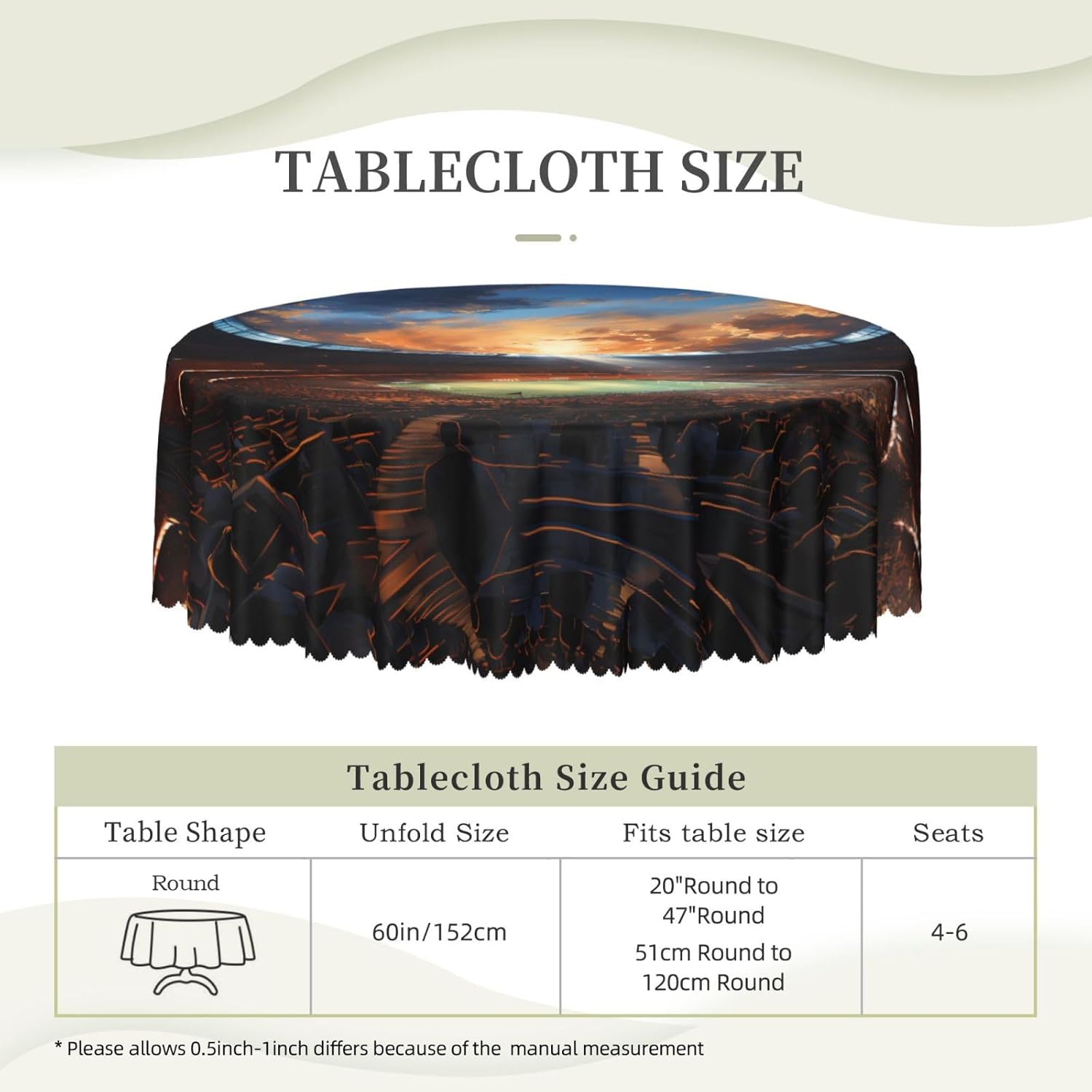 【Meravigliosa tovaglia rotonda da 60 pollici della partita di calcio】 Questa tovaglia ha un fascino unico e prestazioni eccellenti, rendendola la prima scelta per molte famiglie e luoghi. Utilizza la stampa transfer, con motivi chiari e delicati, aggiunge un tocco artistico al tavolo da pranzo. 【Tessuto di alta qualità】 Realizzato al 100% in poliestere, è idrorepellente e morbido al tatto. È resistente alle pieghe e può essere lavato e riutilizzato, il che può proteggere il tavolo da pranzo da graffi e macchie, facendolo sembrare nuovo. Ampia gamma di scenari applicativi: varie occasioni di pranzo e riunioni di tavole rotonde interne ed esterne. Che si tratti di una riunione di famiglia o di un luogo commerciale, può mostrare un fascino unico.,Misura applicabile: la nostra tovaglia ha un diametro di 60 pollici (152 cm). A causa dei diversi metodi di misurazione, la dimensione può variare di 2-4 cm. Scegli l'acquisto in base alla tua tabella,Facile da riporre e mantenere: gli accessori includono solo una tovaglia, semplice e facile da riporre. Lavare a mano o in lavatrice a temperatura ambiente. Fare attenzione a non candeggiare o esporre al sole e stirare a bassa temperatura per mantenerlo in buone condizioni