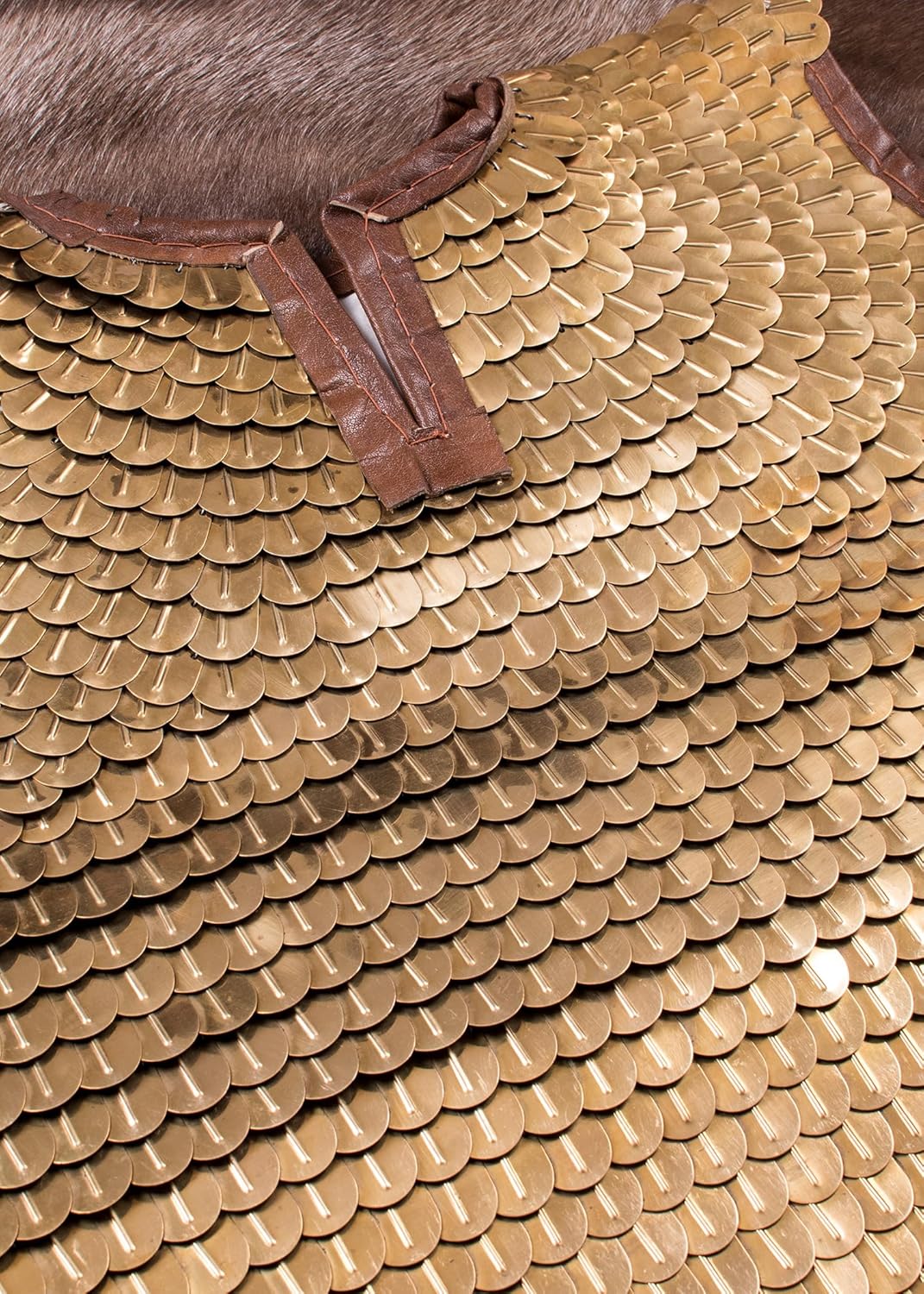 Offriamo una ricostruzione di alta qualità di un'armatura in scala romana, la cosiddetta Lorica Squamata. Questa tipica armatura della cavalleria imperiale romana è composta da tante piccole placche di ottone che vengono cucite su una veste di robusta tela e cuoio, simili a scaglie di pesce, e intrecciate con filo di ferro sui lati lunghi. La nostra armatura a scaglie è la versione corta, utilizzata dal 100 al 250 d.C. circa. La Lorica Squamata è allacciata per adattarsi al colletto laterale e al collo utilizzando cinturini in pelle. Materiale: piastre in ottone, ca. 35 mm x 25 mm x 0,3 mm, cucito con pelle conciata al vegetale - circonferenza torace: ca. 115-125 cm - lunghezza totale: ca. 60 cm - peso: ca. 6 chilogrammi
