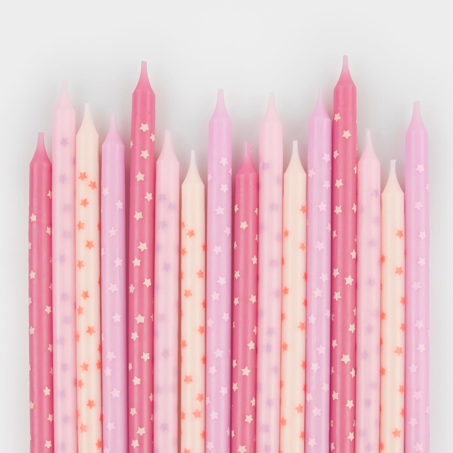CERA ROSA. Candele di cera in 4 tonalità di rosa. Motivo a stelle. Il motivo a stella stampato sembra sensazionale. CANDELE ALTE. Queste candele sono alte 14,6 cm, ideali per creare un effetto dichiarazione. Confezione grande. La confezione da 16 pezzi è perfetta per una festa speciale o per diverse piccole celebrazioni. Per riporre l'armadio essenziale. Tieni una confezione nella tua credenza pronta per ravvivare qualsiasi torta o cupcake in pochi secondi.