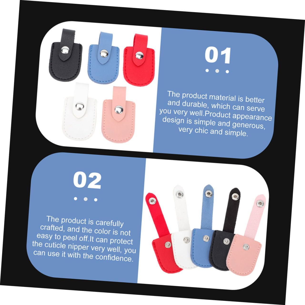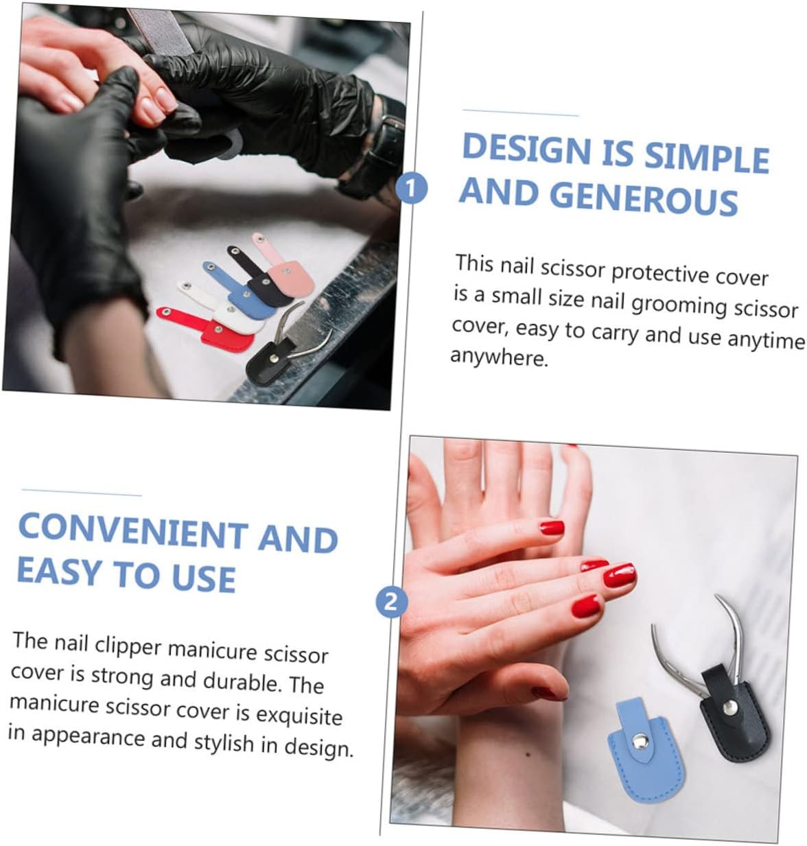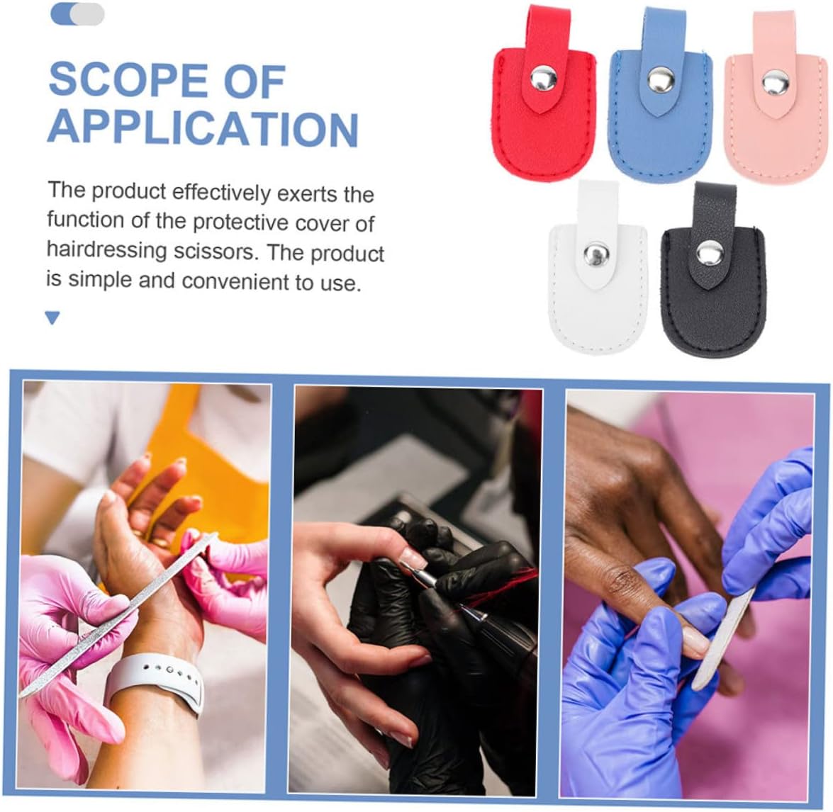Protezione per strumenti per manicure e pedicure: il prodotto è semplice e comodo da usare, il che ti offrirà più comodità. Copri forbici: questo protettore per tagliaunghie è realizzato in materiale pu, che è durevole e può fornirti un servizio a lungo termine. Copri tagliaunghie: può proteggere molto bene il tagliaunghie, preoccuparti più di loro, puoi usarlo con sicurezza. Protezioni per pinze per manicure: il design dell'aspetto del portautensili per nail art è semplice e , molto chic e semplice. taglia cuticole: realizzata in materiale con il quale può essere utilizzata ripetutamente.