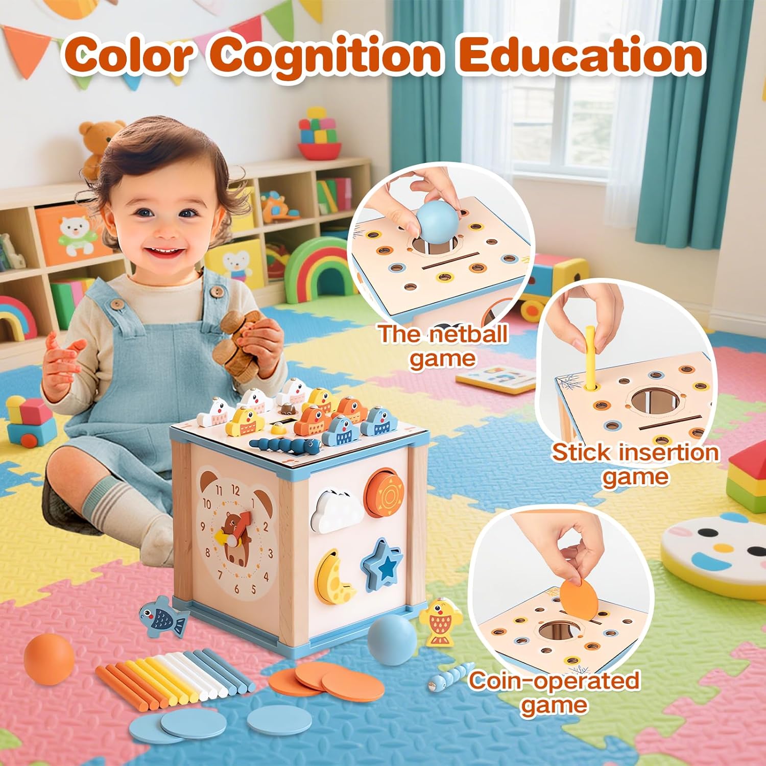 Cubo di apprendimento Montessori 9 in 1 per lo sviluppo sostenibile: questo versatile cubo di abilità motorie combina 9 attività di apprendimento in una, tra cui selezionatore di forme, cornice di conteggio, modulo di apprendimento del tempo, giochi plug-in e gioco di pesca. Ideale come giocattolo per le abilità motorie a partire da 1 anno per promuovere le capacità motorie, la coordinazione occhio-mano e il pensiero logico. Il design educativo supporta lo sviluppo cognitivo dei bambini dai 24 mesi in su ed è perfetto come primo giocattolo educativo per ragazzi e ragazze. Cubo di attività in legno grande e stabile per un gioco sicuro: il nostro grande cubo per le abilità motorie è realizzato in legno massiccio di alta qualità con struttura rinforzata e offre una stazione di gioco stabile. Gli angoli accuratamente arrotondati e le vernici atossiche a base acqua garantiscono la massima sicurezza. Essendo un giocattolo motorio di lunga durata, resiste anche ai comportamenti di gioco più vivaci e accompagnerà il vostro bambino per gli anni a venire. Promuovi i primi traguardi dell'apprendimento in modo giocoso: con questo cubo delle abilità motorie a partire da 1 anno i bambini scoprono i colori, le forme, i numeri e il tempo attraverso la sperimentazione pratica. Il cubo di attività promuove specificamente le capacità motorie complesse attraverso l'afferrare, girare, tirare e spingere: proprio la cosa giusta per sfidare e ispirare i bambini piccoli in modo adeguato all'età. Perfetto come regalo per il primo compleanno o per i bambini in età di asilo. Ideale per la scoperta indipendente e il gioco concentrato: il grande cubo per la motricità offre attività su più lati e invita a giocare in modo indipendente. Da soli o con gli amici: i vari giochi come il labirinto di perline, il gioco della pesca e il puzzle scorrevole attirano l'attenzione e allenano la resistenza e la concentrazione. Un giocattolo per le capacità motorie di valore educativo che risveglia la creatività e la curiosità. Versatile e poco ingombrante: nel design 6 in 1, questo cubo per la motricità sostituisce diversi giocattoli individuali e crea spazio nella stanza di ogni bambino. Il design compatto ma ampio offre la massima area di gioco con il minimo spazio. Come giocattolo completo per la motricità a partire da 1 anno, è progettato in modo che i bambini possano divertirsi a lungo, dai primi tentativi di afferrare fino al gioco più complesso nell'età della scuola materna.