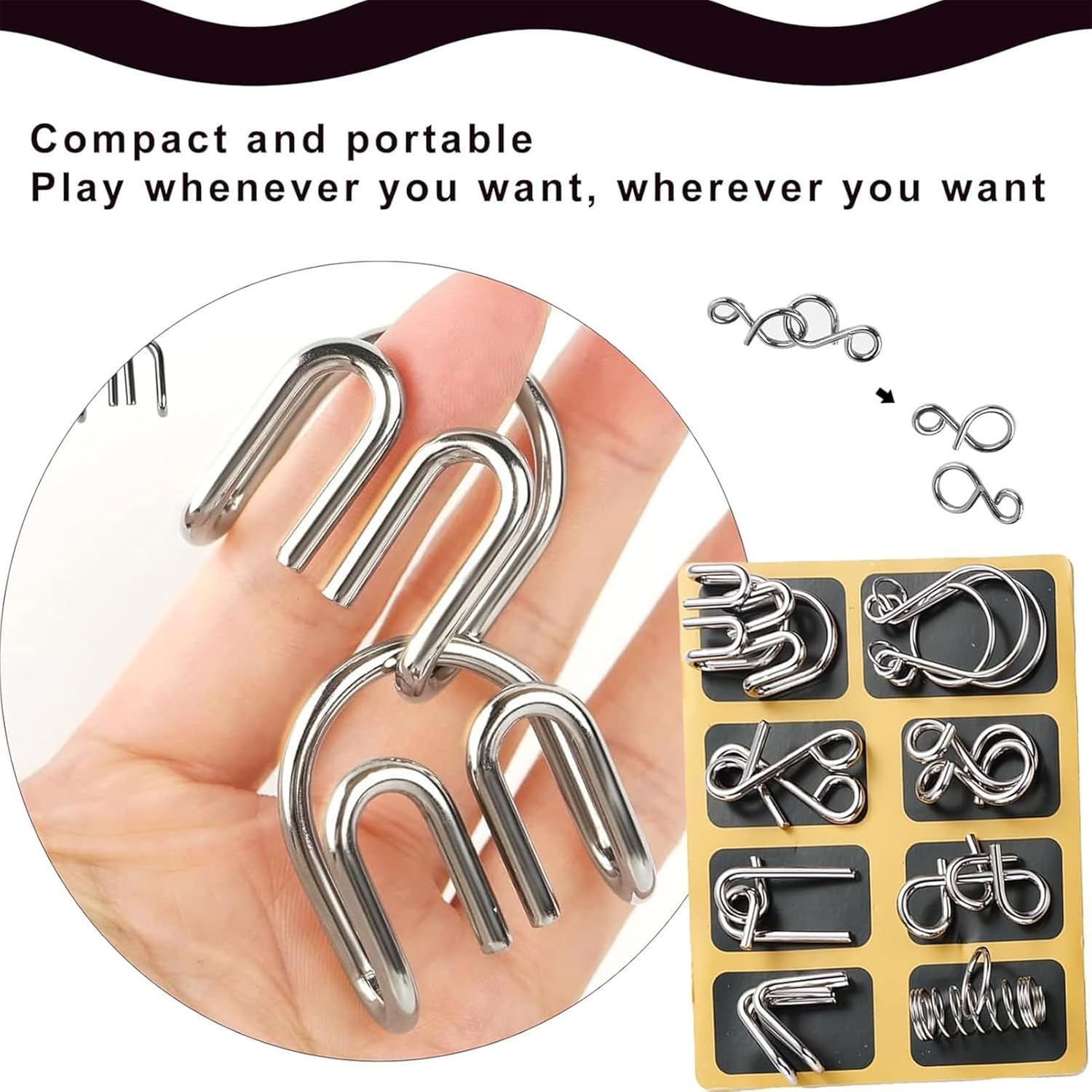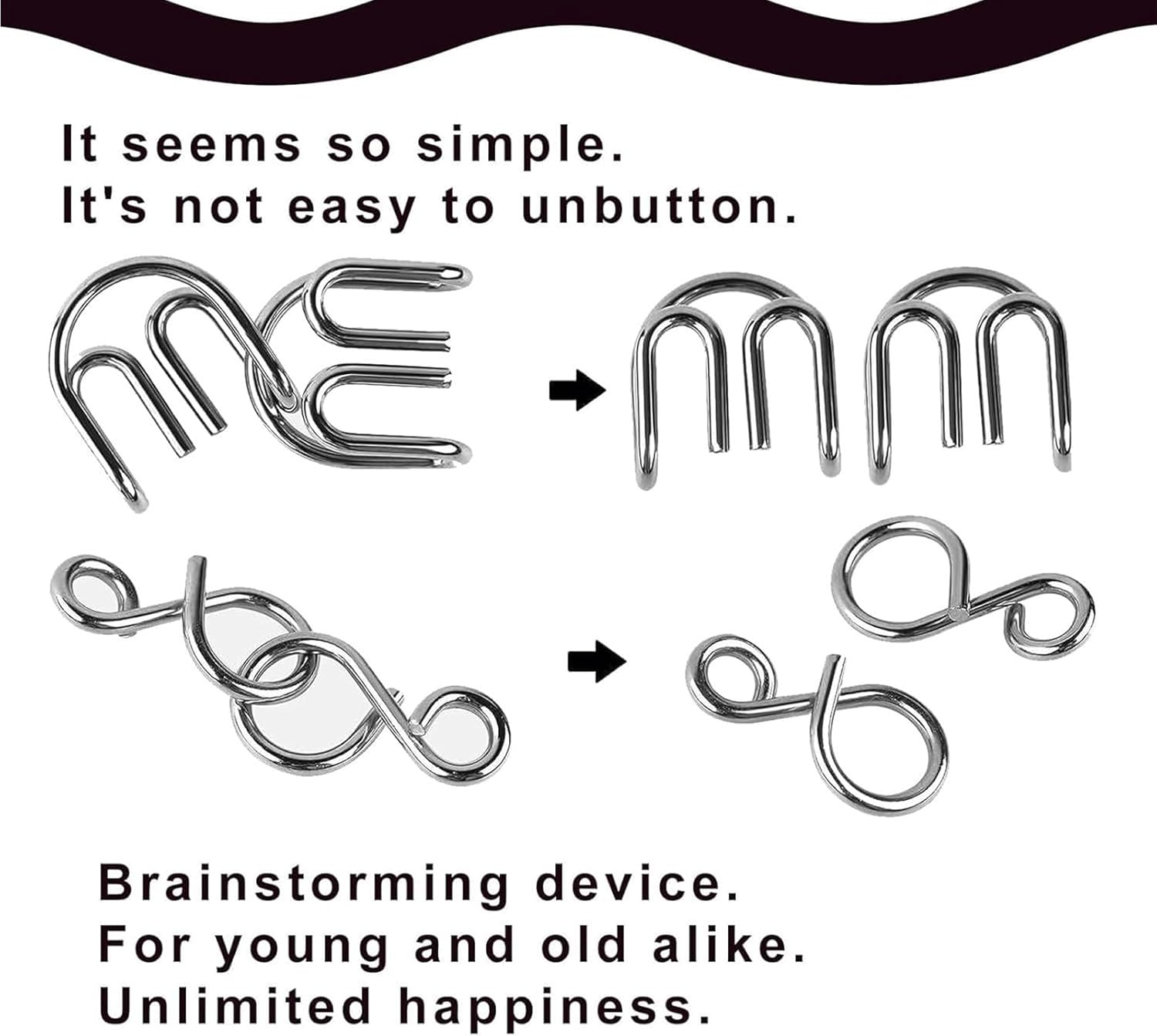 All-Age Friendly Puzzle: Featuring polished smooth and burr-free edges, the metal wire puzzle provides a safe user experience for all ages, constructed from high density high carbon steel to ensure strength and resistant to wear, enhancing relaxation during travel or quiet evenings at home Attention and Resilience Builder: These metal brain teasers promote subtle intellectual development by engaging users in disassembling and reassembling tasks, improving spatial awareness and cultivating patience during problem-solving trainings at home or work Adaptable Design for All Ages: Metal puzzles for kids provide a calming experience with their compact size, fitting comfortably in hands of all sizes, offering an engaging way to relax and unwind, suitable for use as a desktop toy by adults seeking mental clarity Exquisite Present: Metal brain teaser puzzles serve as engaging presents for kids, boys, and girls, allowing you to express love and care during birthdays, festivals, Christmas, or Year celebrations while fostering problem-solving skills through interactive play Rewarding Mental Challenges: This metal wire puzzle set features 24 designs, enabling players to advance from easy to difficult grades, enhancing their sense of achievement and encouraging exploration in a fun way, suitable for family bonding or single play trainings