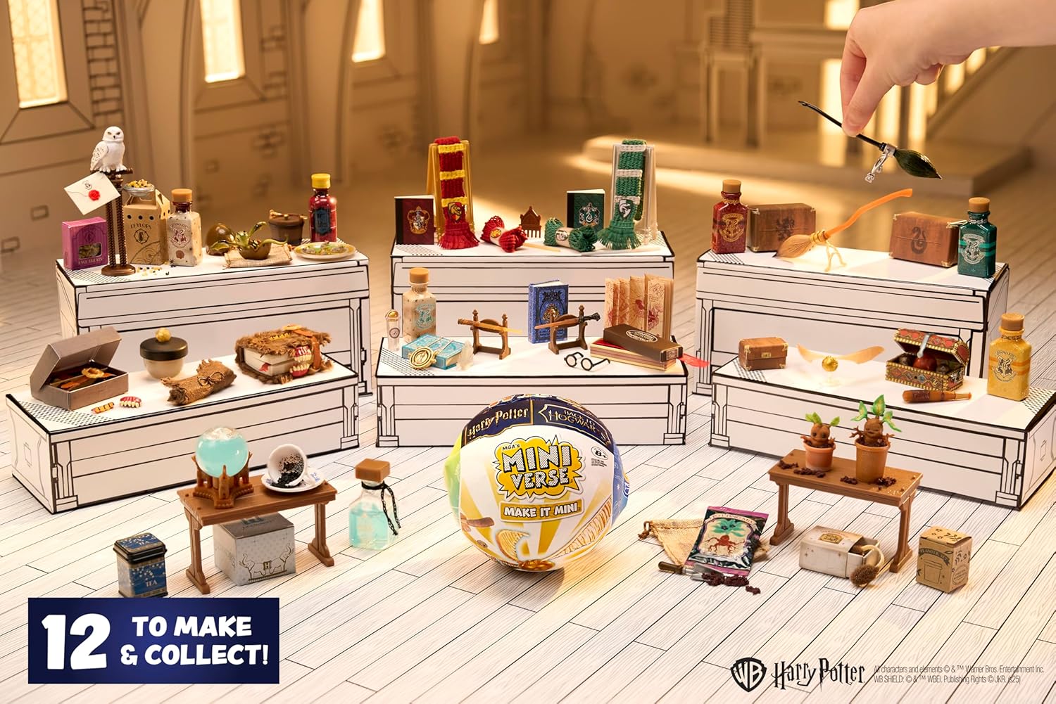 TORNA A HOGWARTS MAKE IT MINI: Realizza i tuoi oggetti preferiti dei film di Harry Potter con il Miniverse Make It Mini Back to Hogwarts di MGA! Tutte le nuove repliche fai-da-te a tema Harry Potter da realizzare, ambientare, esporre e collezionare SCOPRI: All'interno di ogni pallina, ci sono mini oggetti e accessori realistici per creare i tuoi oggetti preferiti della serie di film di Harry Potter! Dal set per il Quidditch al Nimbus 2000 alla sciarpa di Grifondoro REALIZZA: Confronta il contenuto della confezione con la guida del collezionista inclusa per capire quale miniatura hai ottenuto. Segui la scheda istruzioni sul retro delle guide per collezionisti per realizzare le tue miniature SISTEMA: Una volta terminata la creazione della mini replica, mettila sotto il sole o sotto una luce UV finché la resina non si è indurita. Dopo che si è solidificata, avrai un mini oggetto da collezione pronto per essere esposto MOSTRA: La palla in cui si trovano le miniature si trasforma in un piccolo espositore per le tue miniature ACCESSORI UNICI: La replica finita non è l'unico elemento che viene fornito con la palla, ma anche accessori e forniture uniche. Dagli occhiali di Harry a un mini quaderno di Serpeverde, fino al terriccio per le baby mandragole COLLEZIONALI TUTTI: Ogni confezione è una SORPRESA, quindi non saprai quale miniatura Make it Mini hai trovato finché non la aprirai! Ce ne sono 12 da collezionare nella Serie DISCLAIMER: TUTTI gli ingredienti NON sono commestibili e comprendono giochi di resina. Non adatto a bambini di età inferiore agli 8 anni. È richiesta la supervisione di un adulto