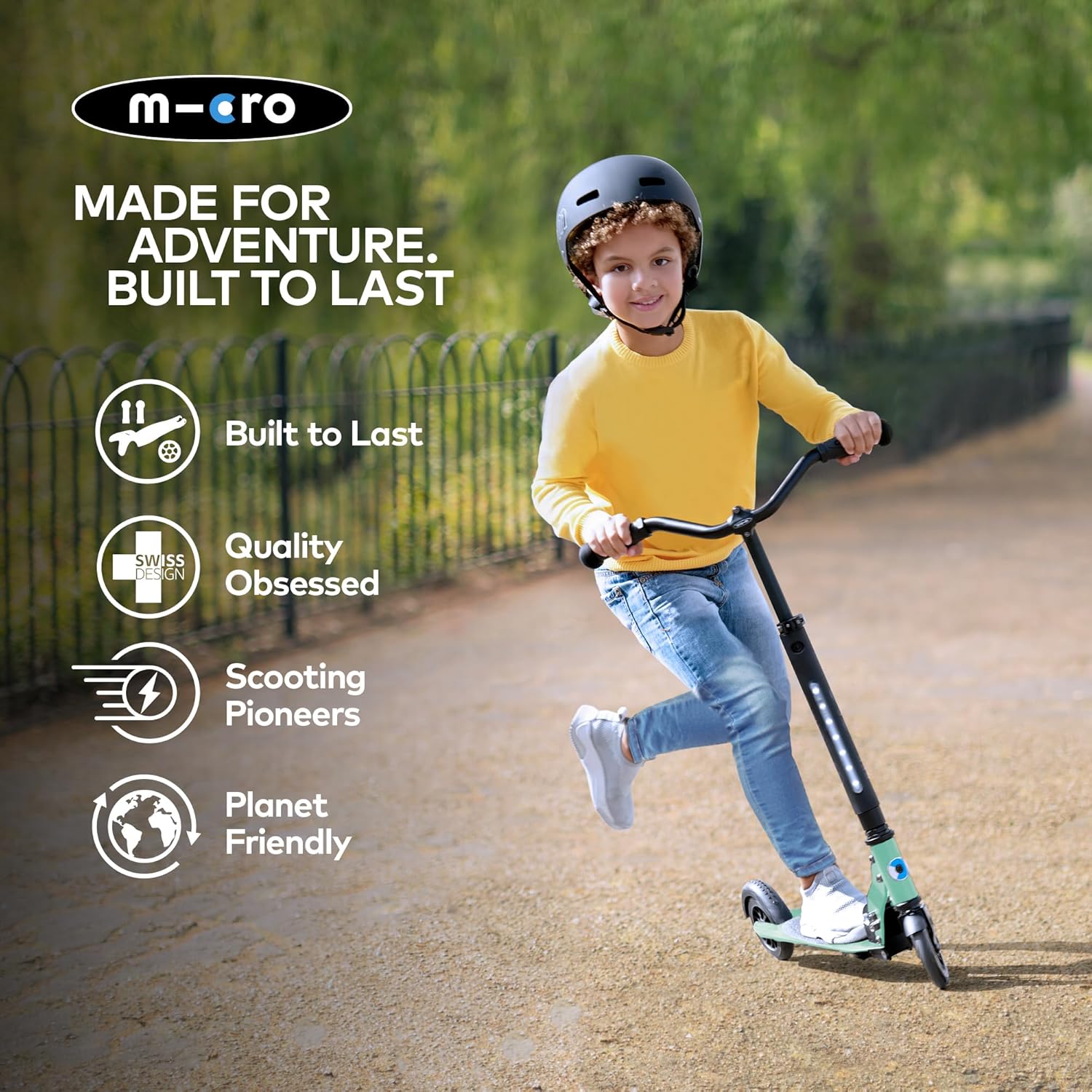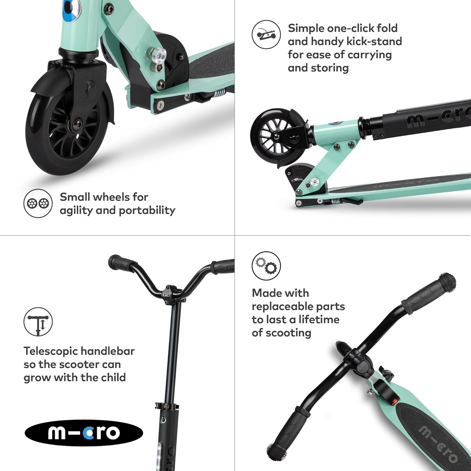 Monopattino perfetto: guida come una bicicletta e guida come un sogno. Il nostro agile Sprite mette sorrisi sui volti quando i bambini entrano nel mondo del monopattino a due ruote. Età: progettato per ciclisti di età compresa tra 5 e 12 anni e meno di 152 cm di altezza. Realizzato con parti sostituibili per durare una vita di scooter. Progettato per durare, progettato per durare. Pieghevole: un sistema pieghevole con un clic facilita il trasporto e lo stoccaggio. Portalo. Conservalo. Mettilo sul retro della macchina. Un clic fa tutto. Deluxe: tutti i vantaggi di un Micro Sprite ma viene fornito con un ampio manubrio e una luce frontale integrata con 2 impostazioni flash per la massima visibilità e sicurezza. Manubrio intelligente: la perfetta introduzione a entrambe le ruote. La direzione reattiva a 360 gradi dello Sprite è come una bicicletta. Inoltre, con un'altezza del manubrio regolabile, garantisce anni di utilizzo.