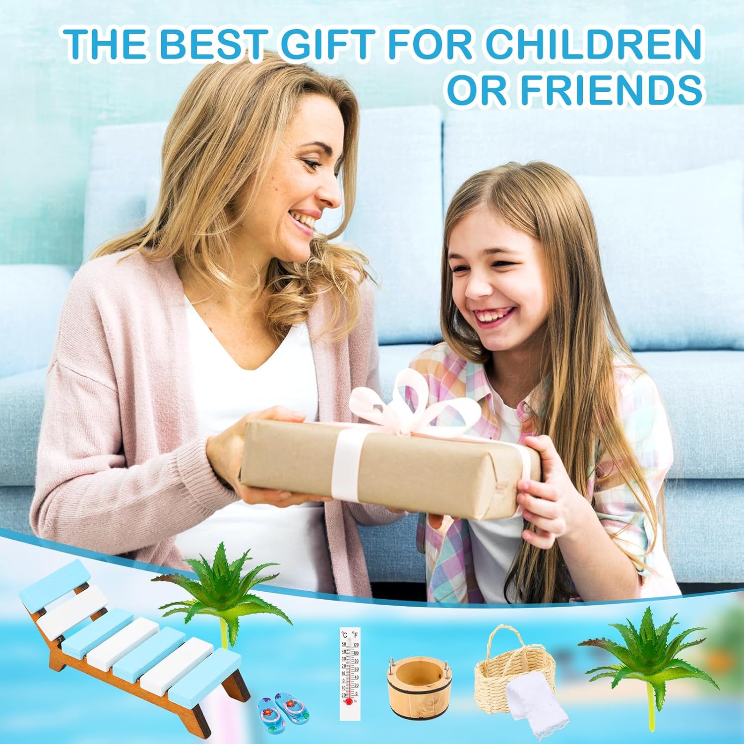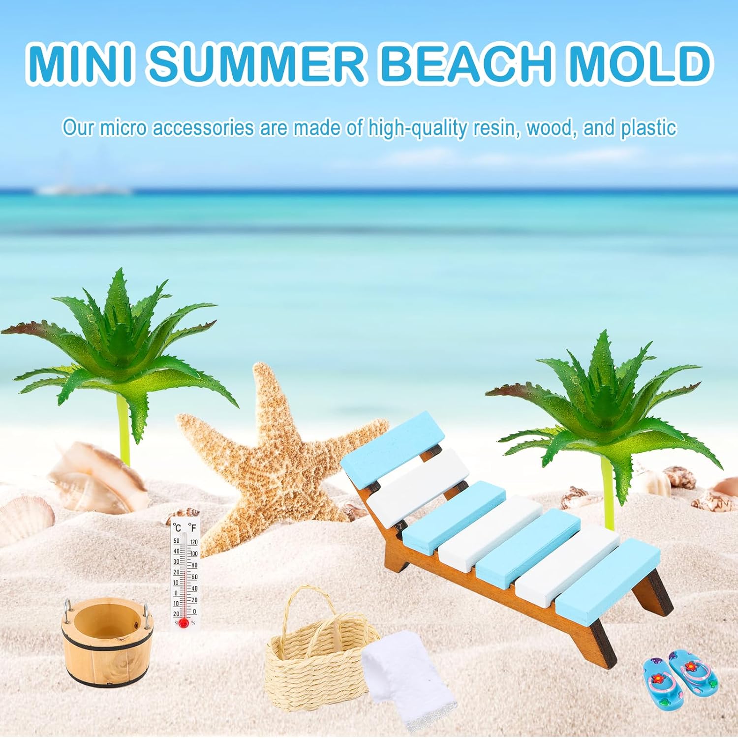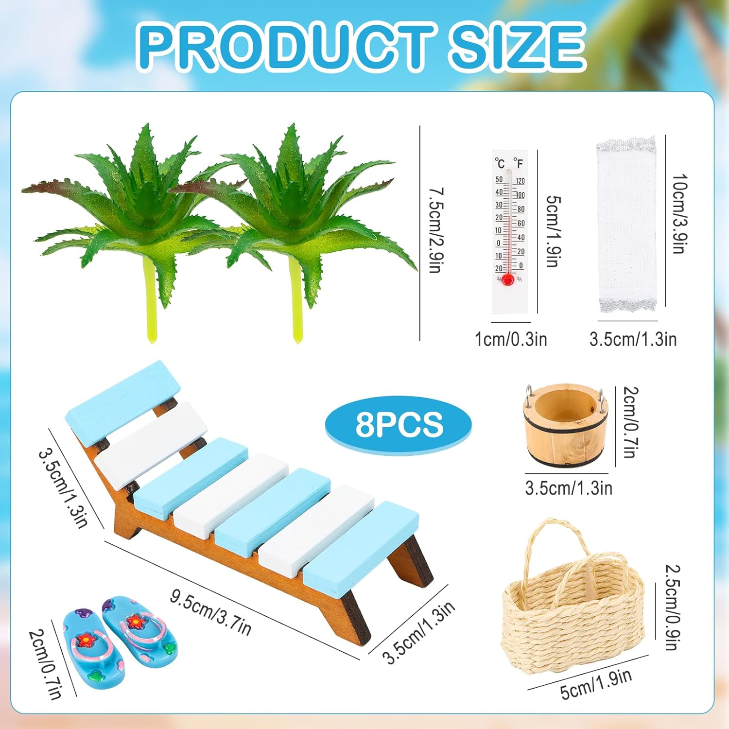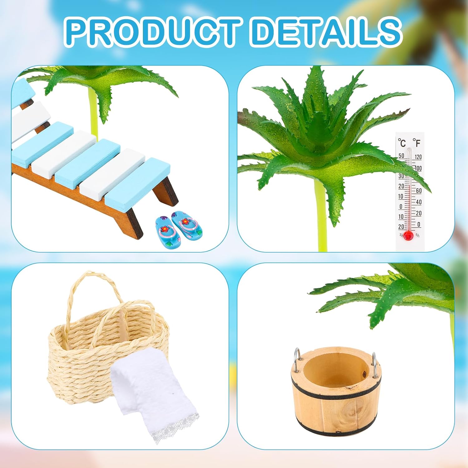 Kit micro-paesaggio da spiaggia: riceverai 8 diverse mini decorazioni da spiaggia, tra cui alberi di cocco, sedie in miniatura, secchi, termometri, borse da spiaggia, scarpe da spiaggia, coperte sufficienti per creare un affascinante tema di decorazione in miniatura. Materiali affidabili: le nostre mini sedie a sdraio decorative sono realizzate artigianalmente con legno, plastica e resina di prima qualità, impermeabili e affidabili, a prova di ruggine, non sbiadiscono né si rompono, possono essere utilizzate più e più volte per decorazioni di torte per feste in piscina. Design affascinante: questo set di decorazioni da spiaggia in miniatura con disegni da spiaggia e colori vivaci aggiunge un tocco di classe a progetti e giardini da favola; Decorazione da spiaggia in miniatura per un look delicato e carino. Decorazioni estive: le nostre decorazioni da spiaggia in miniatura sono perfette per le decorazioni di torte a tema spiaggia, mentre decorare una torta di compleanno per bambini può portare un divertimento senza fine; Questi componenti hanno un aspetto squisito e ricchi di componenti da spiaggia in miniatura. Ampia gamma di applicazioni: la nostra mini decorazione da spiaggia può essere utilizzata per decorazioni di torte da spiaggia, giardini in miniatura, spiagge, case delle bambole, acquari, decorazioni vegetali, toppers per torte, accessori per feste a tema e altro ancora.