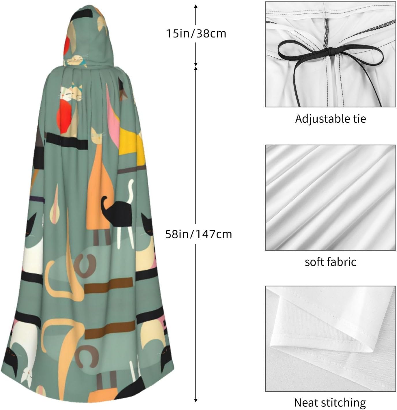 Entra nel mondo della fantasia e dell'avventura con il nostro elegante mantello da donna. Realizzato in fibra di poliestere di alta qualità, questo mantello offre una vestibilità leggera e confortevole, permettendoti di abbracciare i tuoi personaggi preferiti o personaggi per feste in costume, Halloween, fumetti e molto altro ancora. Dotato di un cappuccio oversize e una chiusura con cravatta, questo mantello non solo aggiunge un elemento di mistero, ma completa anche una vasta gamma di scelte di outfit La costruzione garantisce una lunga durata. Uso duraturo senza alcun fastidio o prurito. Che tu stia partecipando a una festa a tema, una danza o un evento cosplay, questo versatile mantello è sicuro di fare una dichiarazione. È perfetto per feste di Halloween, convegni di fumetti, spettacoli teatrali, feste in maschera e altre occasioni festive. Lascia che la tua creatività risplenda e immergiti nel mondo della fantasia. Pulire questo mantello è un gioco da ragazzi, Lavabile in lavatrice. Facile da pulire. Il suo design ti consente di godertelo per gli anni a venire, rendendolo una scelta affidabile ed elegante per tutte le tue esigenze di abbigliamento. Sperimenta l'incanto e il fascino del nostro elegante mantello da donna e diventa al centro dell'attenzione in ogni evento. Migliora il tuo gioco di costumi e crea ricordi indimenticabili con questo accessorio indispensabile. Abbraccia la tua immaginazione e intraprendi un viaggio straordinario oggi!