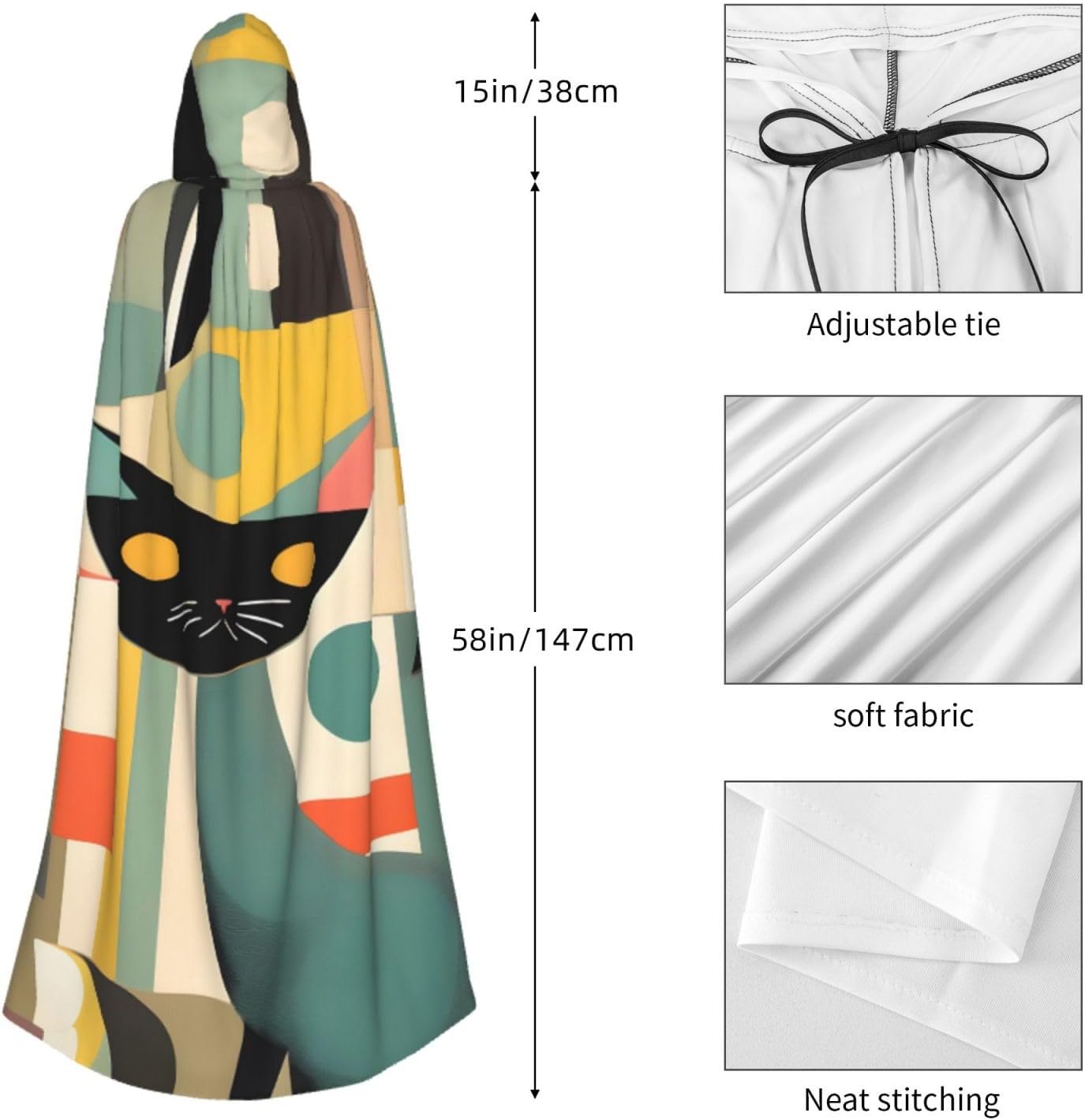 Il nostro mantello con stampa di gatti di arte moderna della metà del secolo viene fornito con un cappuccio comodo e drammatico, insieme a una cravatta per un facile utilizzo, privo di cerniere che potrebbero rovinare l'estetica. Questo mantello con cappuccio con stampa di gatti di arte moderna della metà del secolo promette un comfort eccezionale grazie al suo tessuto anti-prurito e offre una copertura completa adatta a tutte le età. Non importa dove ti trovi, distinguiti tra la folla con questo pezzo eccezionale. Versatile e facile da mantenere, questo mantello è per una serie di eventi, che si tratti di Halloween, balli in maschera, feste in costume o fumetti. Basta metterlo in lavatrice o lavarlo a mano e sei pronto ad andare. Vestiti nello spirito di Halloween e cosplay con il nostro mantello con cappuccio con stampa di gatti di arte moderna della metà del secolo, offrendo la combinazione di comodità, comfort e stile.