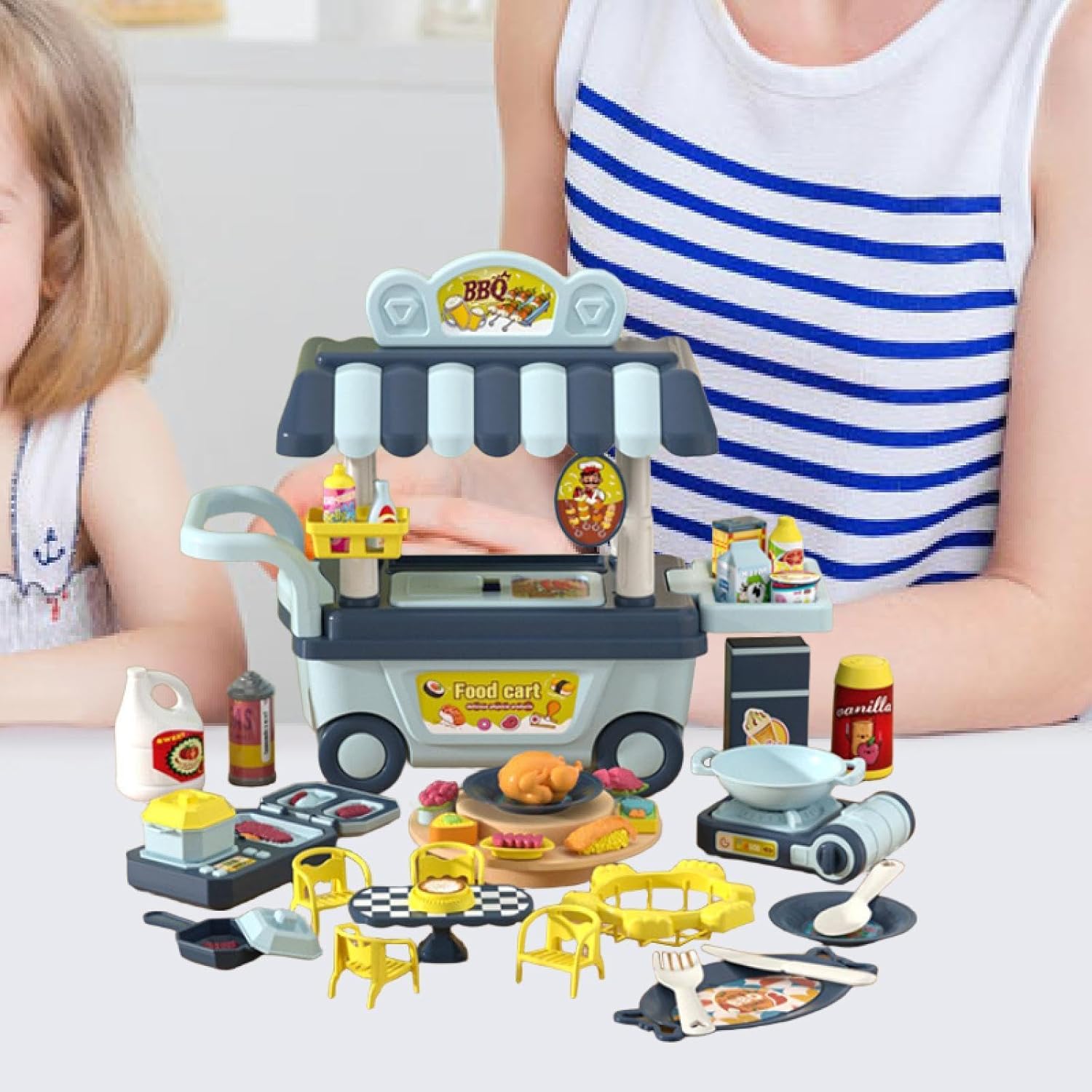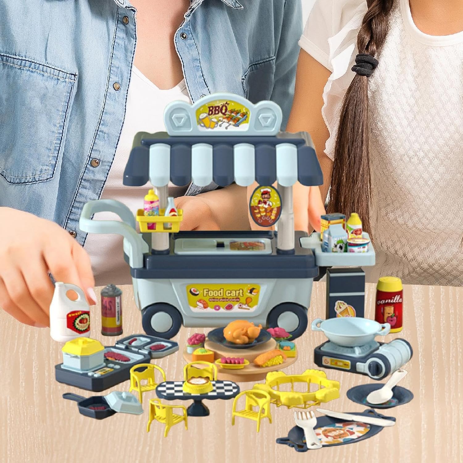 【Divertimento in cucina fai da te】: questo set di giocattoli con carrello da barbecue simulato supporta il gioco della grigliata fai da te. I bambini possono mescolare e abbinare diversi modelli di cibo in base alle loro preferenze e creatività, consentendo loro di esercitare appieno la loro immaginazione e le loro capacità creative. 【Gioco di ruolo】: In scenari di gioco di finzione, i bambini possono assumere ruoli come chef, cameriere/a o cliente. Attraverso l'interazione con i coetanei, ampliano le trame e le ambientazioni di gioco, aiutando a sviluppare abilità sociali e capacità di linguistica, promuovendo al contempo il pensiero logico e la capacità di problem solving, oltre a migliorare la motricità fine e la coordinazione occhio-mano. 【Design realistico】: questo mini set di giocattoli per barbecue per bambini è realizzato con accessori che assomigliano molto a un vero barbecue all'aperto, rendendo i bambini coinvolti nel gioco del barbecue e portando molto divertimento 【Vari accessori】: il set di gioco include una varietà di modelli alimentari realistici come verdura, frutta, carne e pane, oltre a utensili da cucina come piatti, ciotole, cucchiai, forchette e accessori per la tavola come tavolo e sedie. I bambini possono partecipare all'intero processo, dalla preparazione degli ingredienti alla cottura e al servizio dei pasti. 【Effetti sonori e luminosi】: Dotato di effetti sonori e luminosi, questo set da gioco per barbecue per bambini rende l'esperienza del barbecue più realistica, attirando l'attenzione dei bambini e aggiungendo divertimento alle loro attività di gioco di ruolo (alimentatore AA richiesto, ma non incluso)