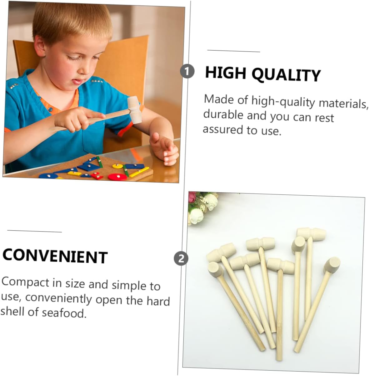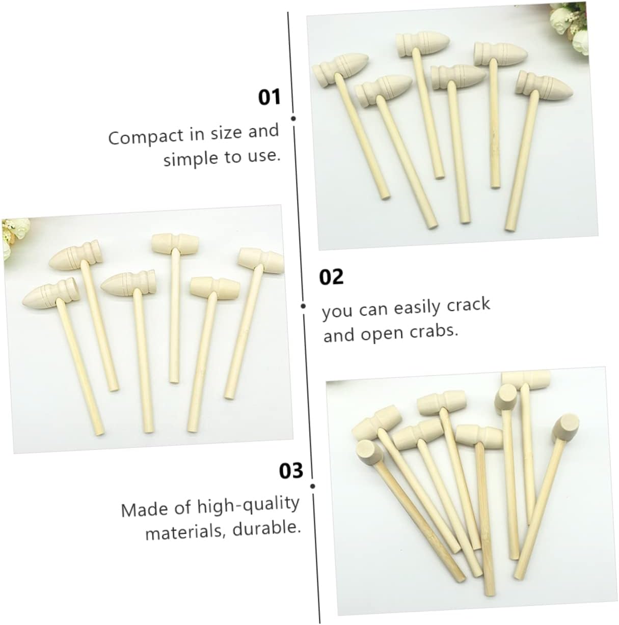 Martello per frutti di mare: con questi martelli per aragoste in legno puoi facilmente rompere e aprire aragoste e crostacei senza danneggiare il delicato interno. Il nostro martello per granchi è facile da pulire e ti offre molta comodità. Martelli per granchi Martelli per aragoste in legno: i martelli per frutti di mare e granchi in legno non sono destinati solo a rompere i gusci di aragoste e altri frutti di mare, ma possono anche essere utilizzati nella lavorazione della pelle, nella creazione di gioielli, come martelli per bambini, martelli giocattolo. essere utilizzato. Giocattoli per bambini Giocattolo martello: compatto nelle dimensioni e facile da usare, apre comodamente il guscio duro dei frutti di mare e ti aiuta a gustare facilmente cibi deliziosi, martello di legno Mini martello per granchio: questi robusti piccoli martelli sono progettati per rompere i frutti di mare nei gusci come aragoste, crostacei, ostriche e. Sono perfetti per rompere i gusci senza danneggiare quelli deliziosi. Goditi i tuoi frutti di mare!, Martello per torte giocattolo per bambini: i martelli per frutti di mare sono facili da impugnare e utilizzare e il colore del legno sembra più naturale, rendendoli adatti all'uso in ristoranti e case. giocattoli per bambini