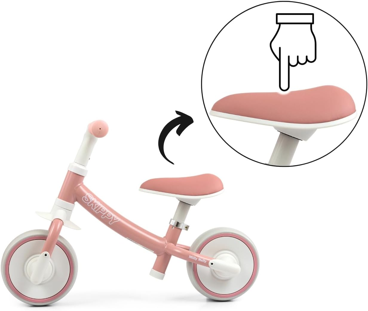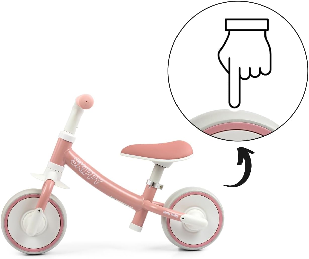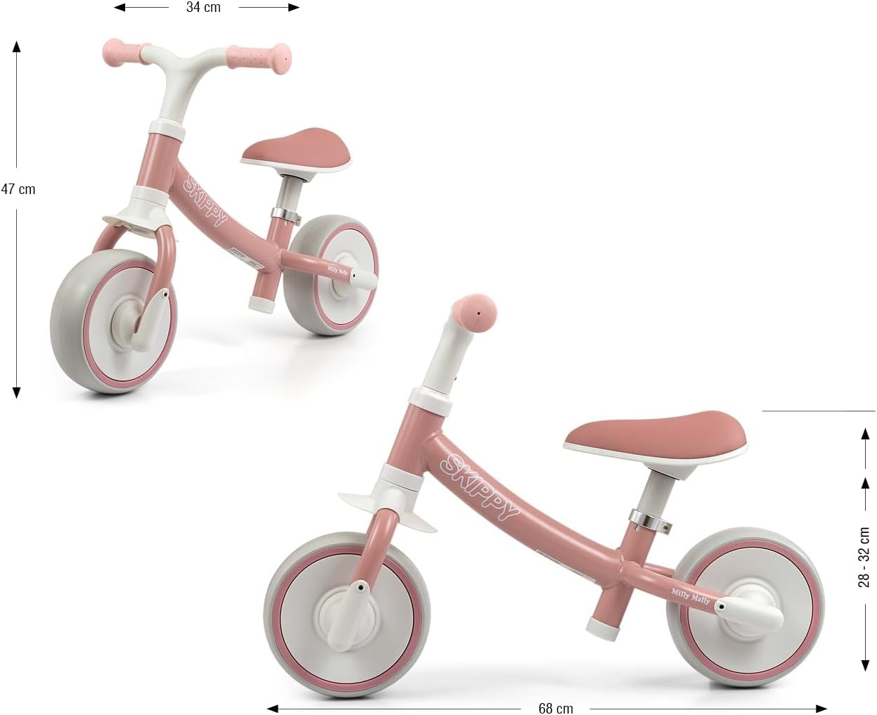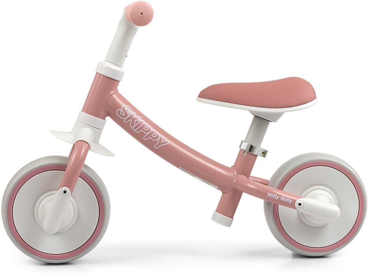Il design moderno in combinazione con design e colori originali rendono la bicicletta un assoluto highlight sul mercato. Perché dovresti imparare ad andare in bicicletta con MILLY MALLY SKIPPY? Design ergonomico della bicicletta: garantisce un comfort di guida insuperabile e una postura corretta. - Leggero Realizzato con la più recente tecnologia EVA. Le ruote larghe non forate assorbono bene gli urti per un maggiore comfort di guida. Combinazione di colori: abbiamo messo insieme una combinazione di 2 colori pastello, che piacciono ai bambini con il ciclo. - Ruote comode, morbide e profilate - complete I vantaggi delle Balance Bike Imparare a camminare sviluppa in modo eccellente la capacità di equilibrio, mantiene la motricità, la forza e la muscolatura delle gambe e allena la coordinazione dei movimenti. È anche l'inizio perfetto prima di guidare una bicicletta tradizionale. Perchè SKIPPY? Robusti e realizzati con la più recente tecnologia in schiuma EVA, le ruote silenziose e larghe che non necessitano di essere gonfiate li rendono esenti da manutenzione. La sella ergonomica con morbida imbottitura offre al tuo bambino una piacevole pedalata. Le impugnature in morbida gomma antiscivolo garantiscono una presa sicura e una guida confortevole e il limitatore del volante protegge dal ribaltamento. Design ergonomico per resistenza e praticità La bicicletta è progettata per un uso a lungo termine da parte dei più piccoli ed è comoda da trasportare grazie al suo peso ridotto. Importante! Quando scegliamo una bici senza pedali per il tuo bambino, dovremmo prestare attenzione alla posizione dei piedi del bambino. Per utilizzare liberamente la bicicletta senza pedali, il bambino deve sedersi con tutto il piede a terra e una gamba leggermente piegata all'altezza del ginocchio. La distanza minima richiesta da terra deve essere inferiore alla lunghezza dei piedi del bambino. Le biciclette del marchio Milly Mally sono soprattutto sicurezza e protezione.