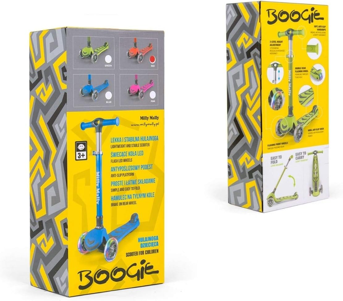 The presented three-wheel scooter for children will appeal to every little scooter lover. It enables completely intuitive driving thanks to body balance control. Ideal solution for active kids who are in constant motion. A striking, stylish design. Lightweight and solid construction (aluminium, reinforced plastic). Perfectly balanced and stable so it is safe to use. Stability and safety provided by a three-wheeled scooter formula. The handle is made of soft and pleasant material which prevents hands from slipping. 3-stage adjustment of the handle height with additional clamp. Additionally, the possibility of folding the handle (without tools and in a few seconds with one button) makes the scooter very convenient to transport and carry. Rubber wheels for a quiet ride, made of high quality rubber material for a quiet ride and proper grip. Anti-slip podium. Equipped with a brake – rear mudguard. Bearing: ABEC-7. Front glowing wheels: PU 120 * 30 mm. Innovative, luminous double rear wheel: PU 80 * 24.5 mm. Colourful and glossy LED wheel lights illuminate the ride and make the fun from riding even greater. Maximum load up to 50 kg. Age range 3+.