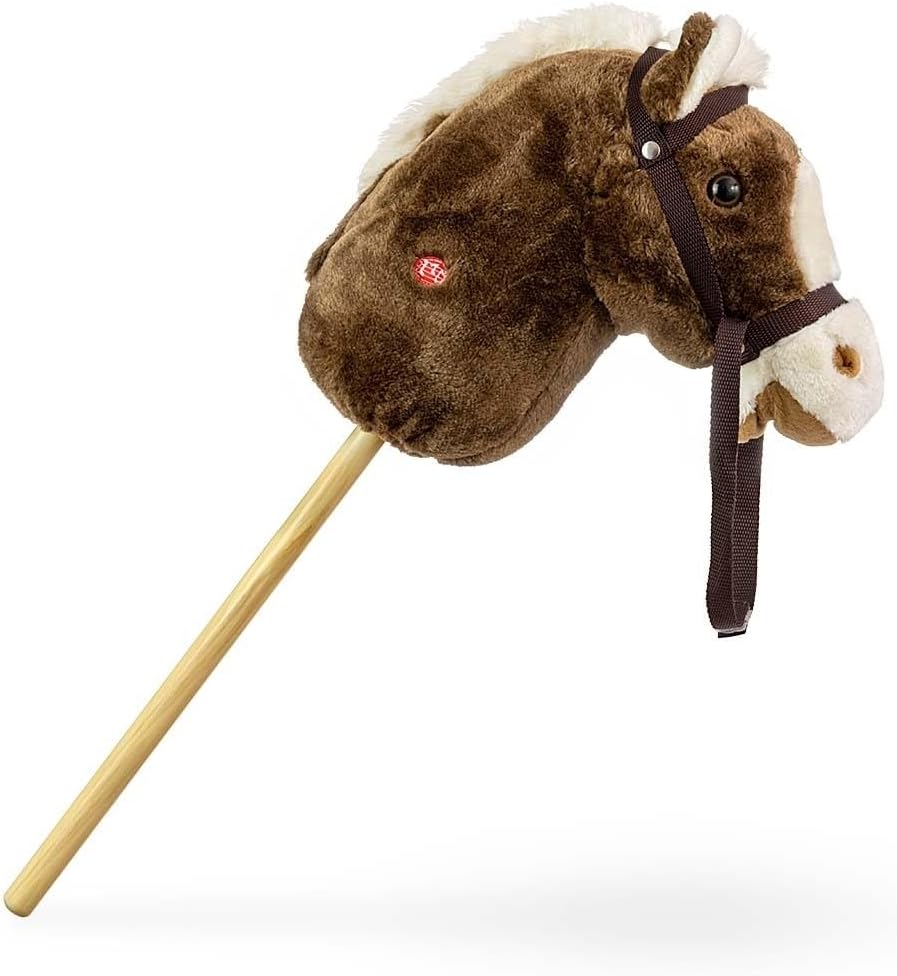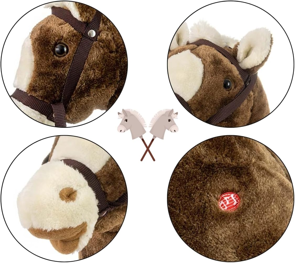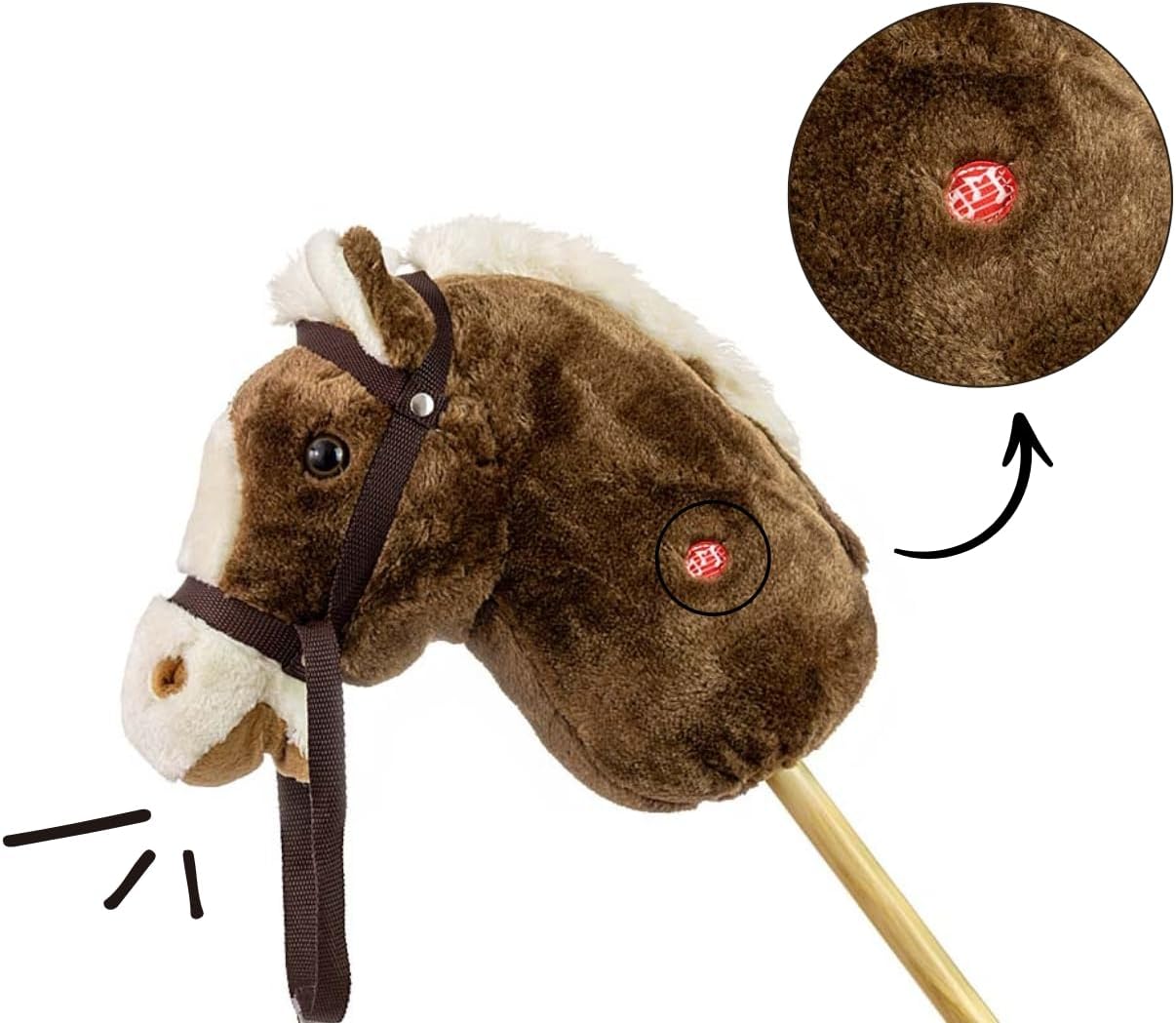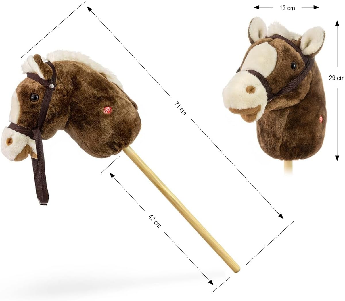 Testa di cavallo giocattolo su manico in legno Sicurezza durante il gioco: robusto manico in legno e materiale morbido sulla testa del cavallo 6 rumori sonori: galoppo e fumo La testa del cavallo si muove quando vengono premuti i suoni Età del bambino: 18 m+ Carico massimo: 30 kg Materiale: parte superiore della testa - poliestere, imbottitura della testa - poliestere e manico in legno