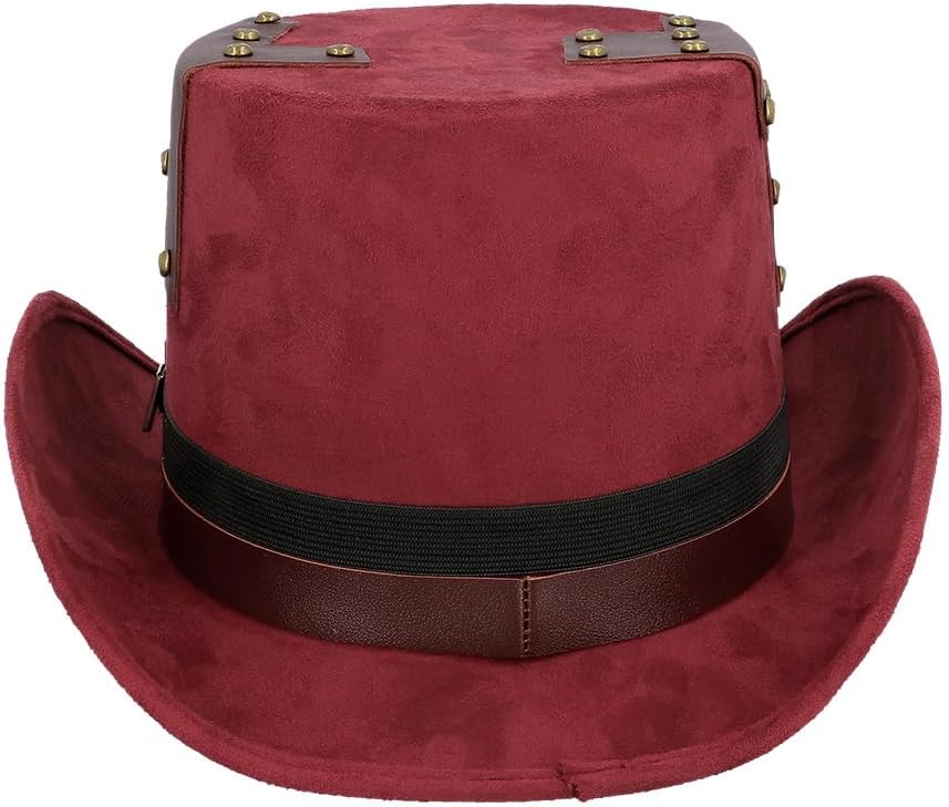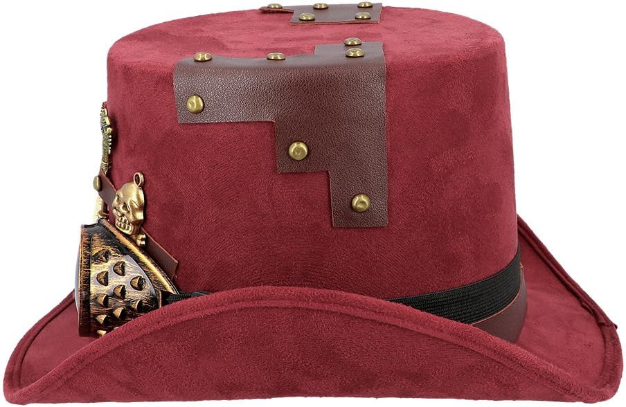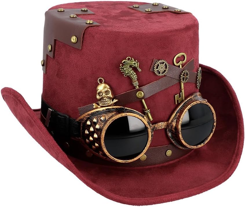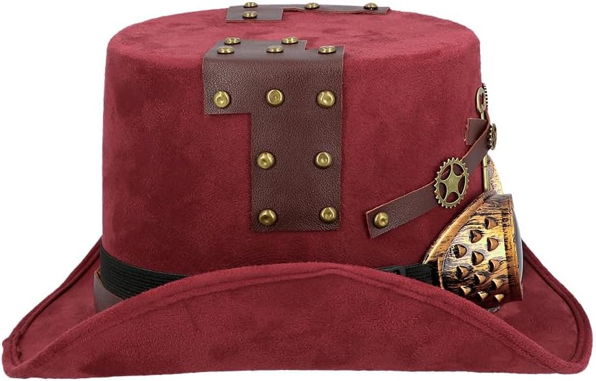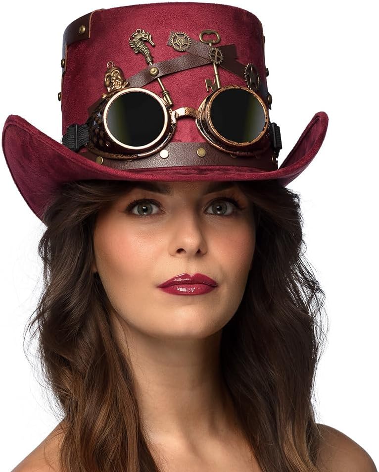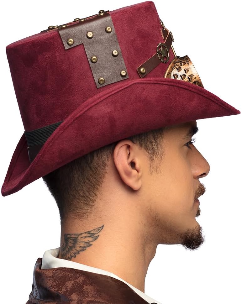 Descrizione prodotto Cappello Steampunk bordeaux effetto pelle scamosciata con occhiali da saldatura rimovibili in oro anticato. I graziosi elementi decorativi come chiavi, ingranaggi, teschio, cinturini in pelle e rivetti conferiscono al cappello cilindro un aspetto lussuoso e di alta qualità. Un elastico all'interno garantisce una vestibilità molto confortevole. Colore: Borgogna Dimensioni: 56-60. Materiale: 100% poliestere. Avviso di sicurezza Attenzione! Non adatto a bambini di età inferiore a 3 anni, contiene pezzi piccoli che potrebbero essere ingeriti. Pericolo di soffocamento. Sorveglianza per adulti