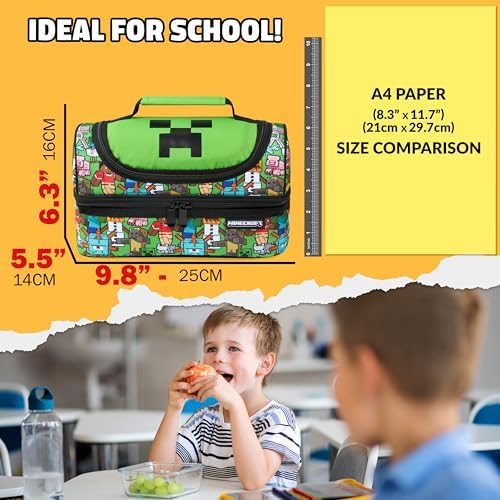 Minecraft Borsa Termica Pranzo - Scegli tra una varietà di design per questa borsa per il pranzo. Disponibile in versioni con compartimenti multipli o con bottiglia d'acqua inclusa, è ideale per la scuola o le gite fuori porta. Borsa Termica per il Pranzo - Grazie alla sua fodera isolante su tutti i lati, questa borsa porta pranzo mantiene il pasto fresco e gustoso durante tutta la giornata, ideale per mantenere il tuo piccolo fan di Minecraft ben nutrito! Ideale per la Scuola e le Gite - Questa borsetta porta pranzo, ufficiale Minecraft, presenta un design da gioco accattivante. Ideale per la scuola, un incontro con gli amici o una gita in famiglia, è una scelta pratica e divertente. Regali Minecraft per Bambini - Questa porta merenda termico isolati è ideale per compleanni o il ritorno a scuola. Un'ottima scelta per ogni bambino appassionato del gioco! Caratteristiche - Consulta le immagini per scoprire ulteriori dettagli sulle borse per il pranzo disponibili, inclusi dimensioni e caratteristiche specifiche di ogni modello.
