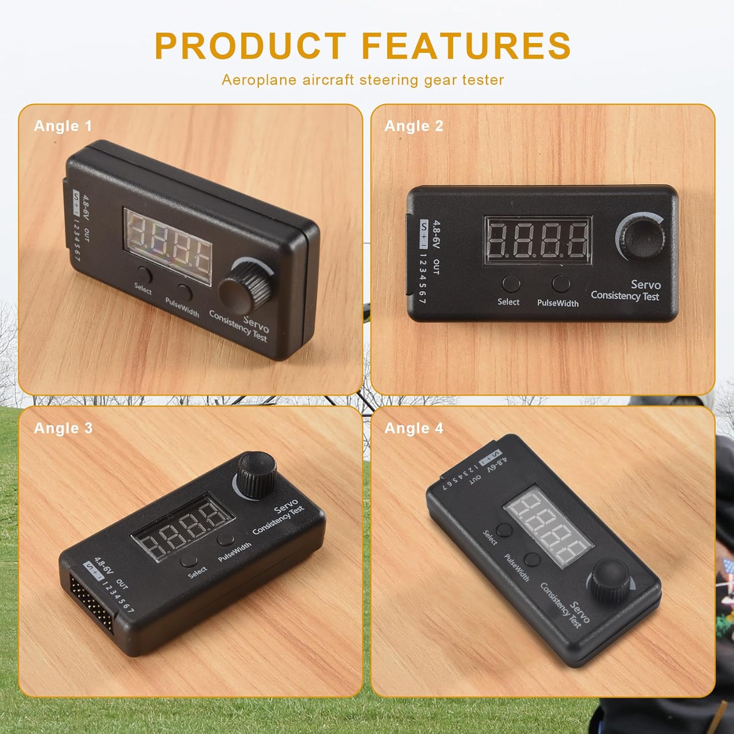 Test insieme: può essere sincronizzato con 4 servi di controllo 'uscita. Test accurato: utilizzato per confrontare il controllo delle prestazioni dello sterzo del segnale di uscita del servo dello sterzo può essere accurato a 2us (1 millisecondo = 1000 microsecondi), è possibile testare il in di rispondere a lievi modifiche. Segnale PPM: con la funzione di test del segnale PPM sul display, il segnale PPM in ingresso mentre l'ingresso l'uscita di sincronizzazione del segnale PPM sul servoalimentato entra automaticamente in modalità manuale (Manuale) di servo segnale analogico 20us 50H, frequenza 50Hz. Regolabile: potenziometri rotativi per ridurre o aumentare la larghezza 'impulso di uscita. 3 modalità: modalità manuale S-1 (manuale) / modalità S-2-bit (neutro) / modalità automatica S-3 (automatica)