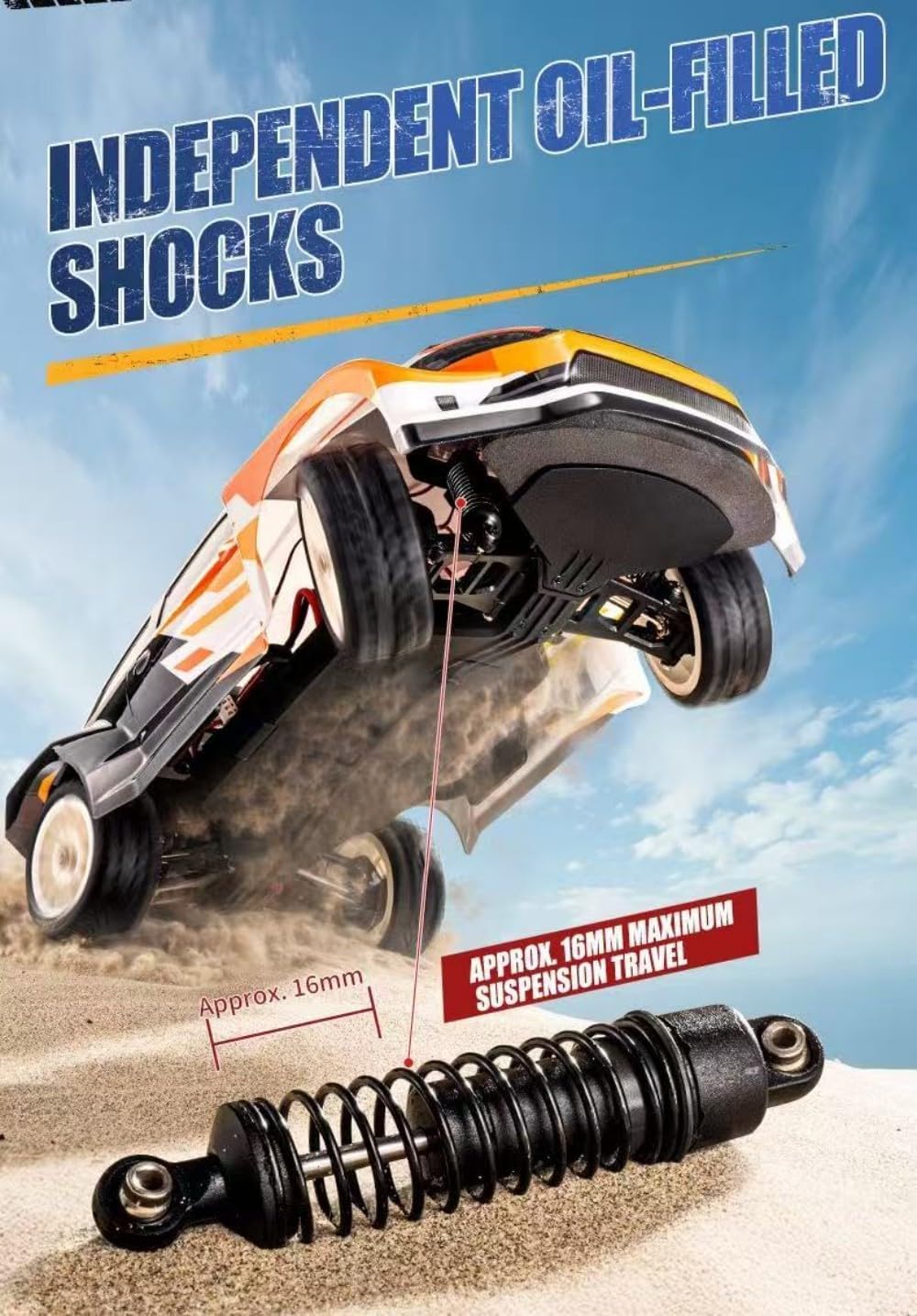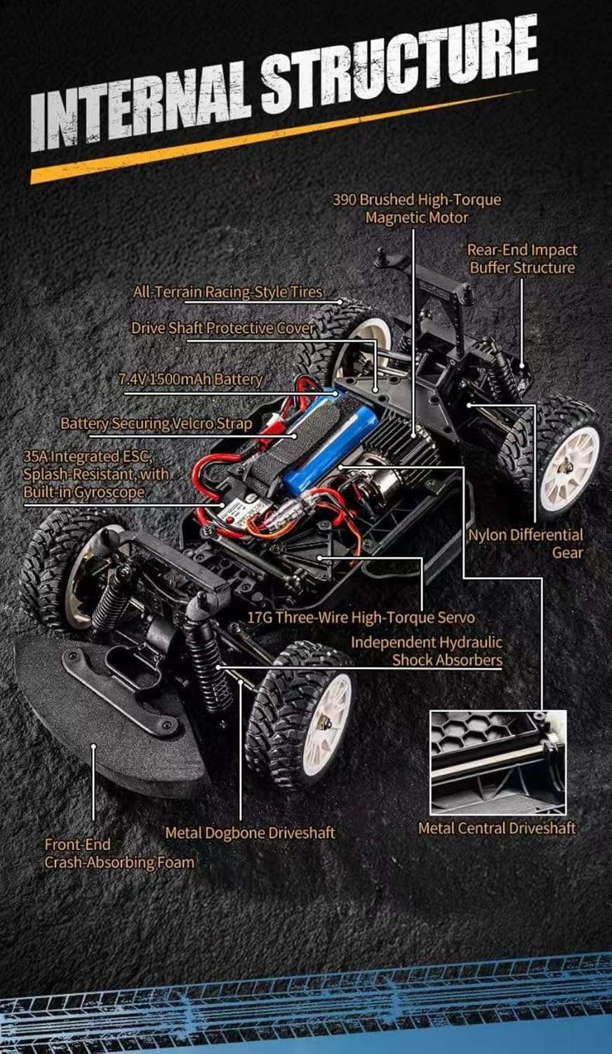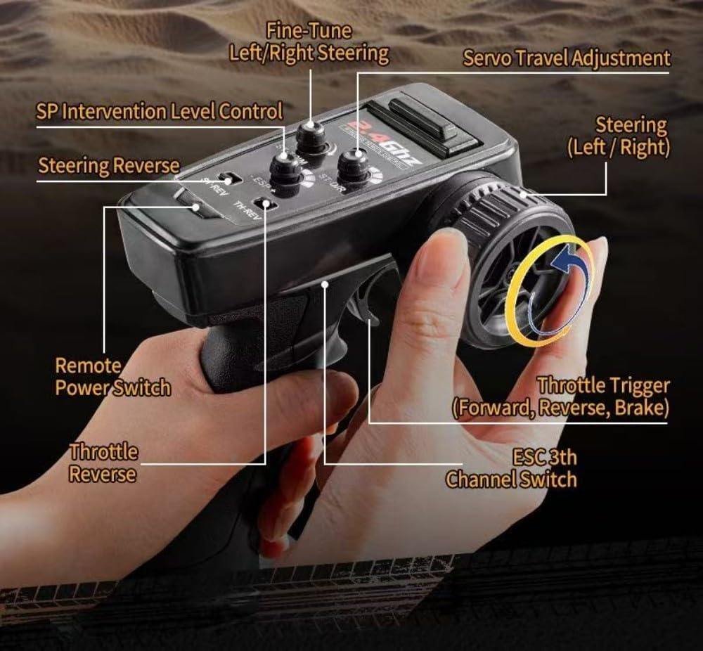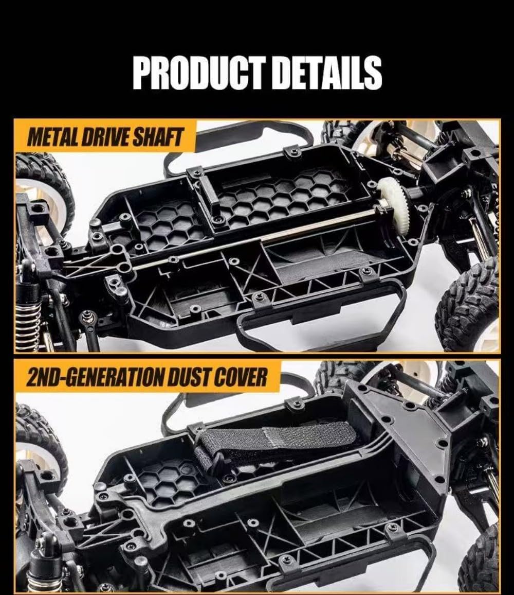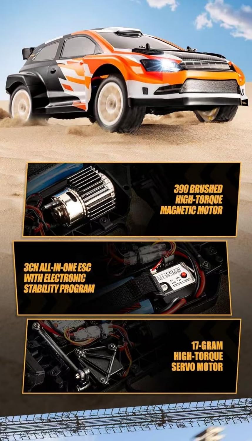 Alta velocità di 32 km/h con stabilità del giroscopio: il giroscopio integrato garantisce una deriva reattiva e stabile alle massime velocità, perfetto per curve a S, inversioni a U e diapositive a forma di 8. 【Ammortizzatori migliorati】 Trasmissione rinforzata con dogbone in metallo e ammortizzatori ad olio di precisione per un maggiore controllo e durata fuoristrada. Conquista erba, ghiaia e pavimentazione con pneumatici in gomma stile racing, passo 195 mm e larghezza della pista larga 215 mm. Sistema di controllo 4WD completamente proporzionale: scala 1:12 realistica con telecomando a 2,4 GHz che offre regolazioni di sterzo, acceleratore e servo regolazioni fino a 150 m. Luci LED anteriori e posteriori + copertura antipolvere: sistema di illuminazione elegante e funzionale per una guida in condizioni di scarsa illuminazione; la copertura antipolvere protegge l'elettronica interna dai detriti. Il motore ad alta coppia con sistema di raffreddamento offre una potenza costante, 12-15 minuti di autonomia. Set regalo pronto per la gara: perfetto per hobbisti e appassionati di RC, è anche un ottimo regalo per adulti. Ideale per compleanni, Natale o semplicemente perché vuoi condividere il divertimento della deriva.