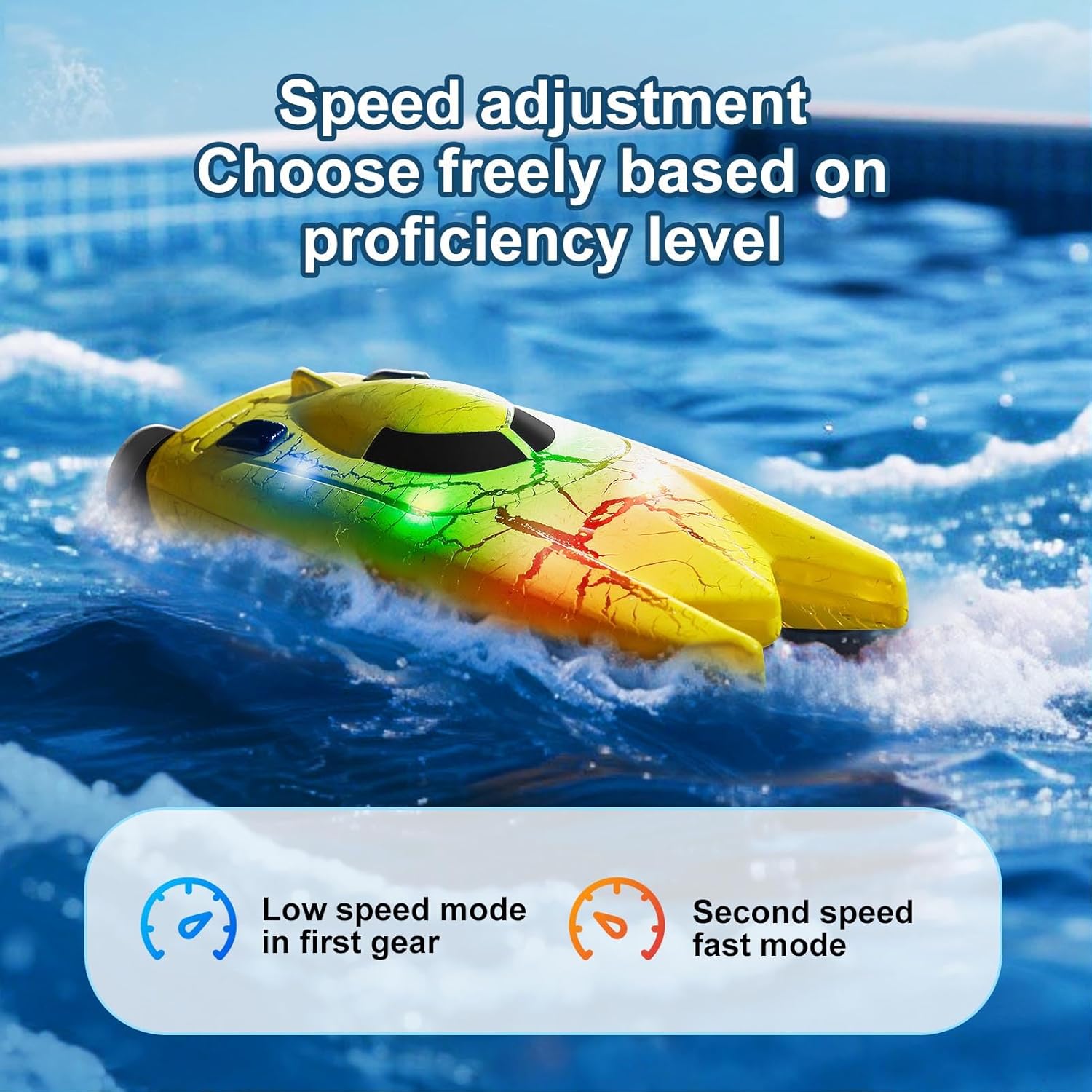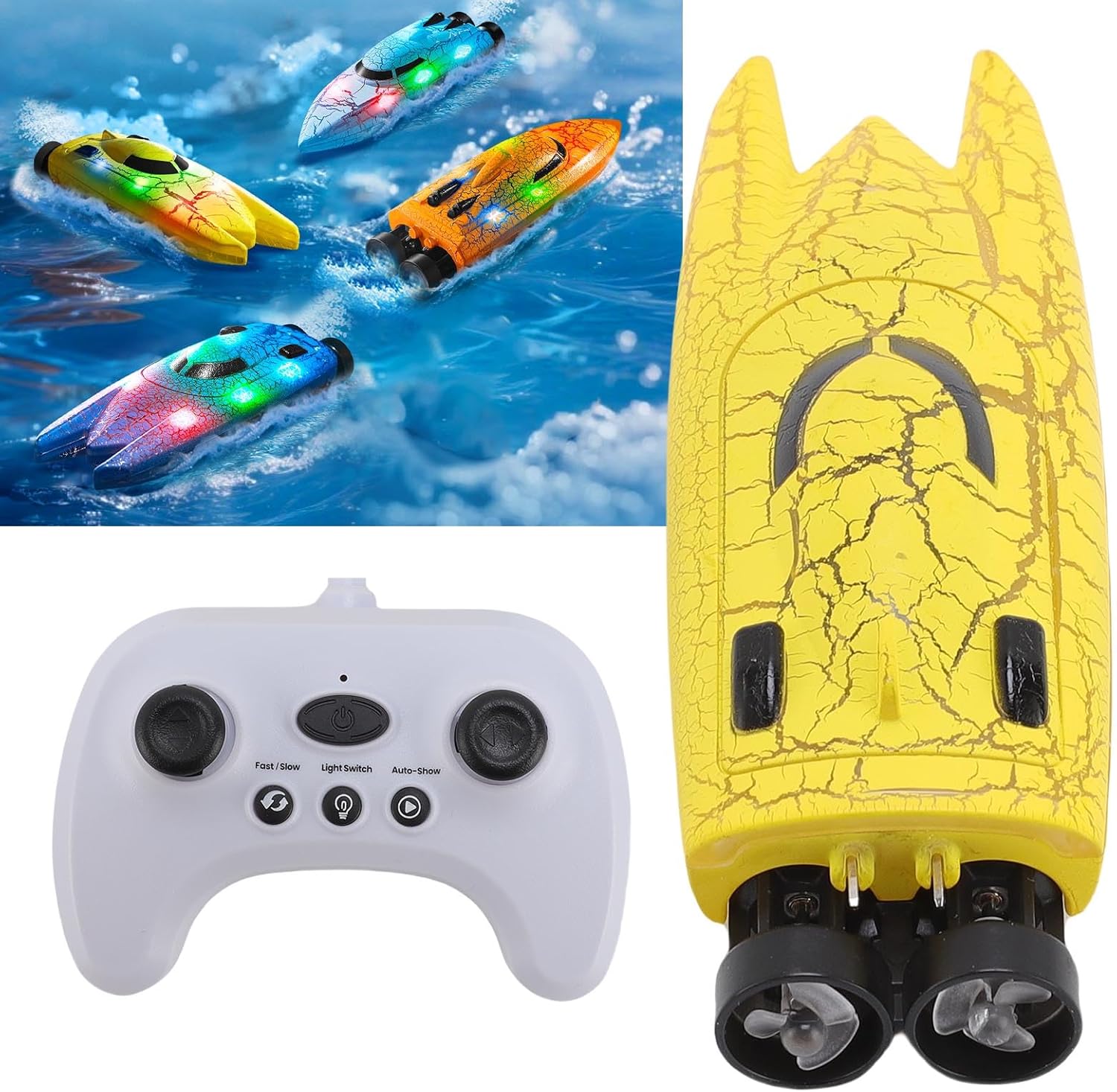 Ruota a 360 ° e Auto Show: la barca a telecomando attiva la rotazione a 360 ° e lo spettacolo automatico con una pressione del pulsante "Auto Show" del telecomando. Questa barca RC da 2,4 g con show automobilistico naviga automaticamente durante la generazione di splendidi schizzi, creando un'esperienza esaltante sull'acqua. Progettazione aerodinamica: la barca RC da 2,4 g con Show Auto utilizza un segnale remoto da 2,4 g per un controllo affidabile, affrontando la frustrazione di segnali deboli che causano disconnessione. Questa barca a telecomando garantisce un'eccellente connessione senza preoccupazioni di disconnessione. Multifunzionale: include impostazioni regolabili a 2 velocità, funzionamento a 4 vie (inversa in avanti, svolta a sinistra, a destra), luci regolabili, design a prova di acqua sigillata, dimostrazione automatica, rotazione a 360 gradi e sia il telecomando che lo scafo sono la prova dell'acqua. Remoto 2,4 g di remoto: la barca RC a prova di acqua compatta ha un design del motore del ventilatore a doppia condotta che si alimenta automaticamente quando fuori dall'acqua. Questa barca a telecomando migliora la sicurezza e impedisce gli incidenti durante il gioco, dando ai genitori la tranquillità quando i bambini la usano. Spegnimento automatico: la barca a telecomando include impostazioni regolabili a 2 velocità, funzionamento a 4 vie (in avanti, inversa, svolta a sinistra/destra) e luci regolabili. Questa barca RC a prova di acqua compatta consente agli utenti di giocare a livello di abilità: i beginner usano una bassa velocità per un controllo costante.