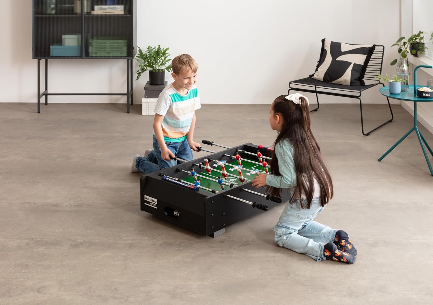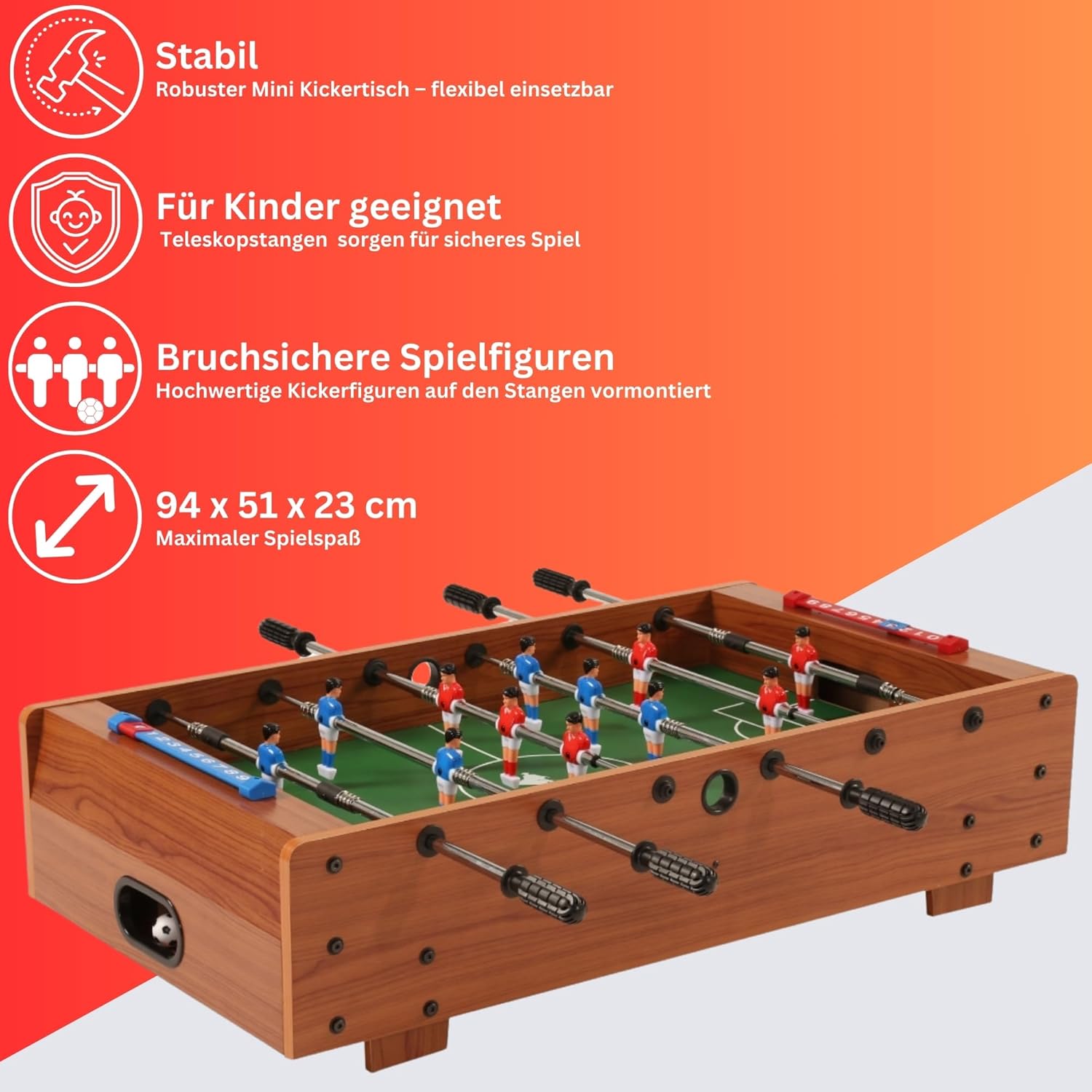 Minicalciobalilla stabile e robusto – mobile e flessibile nell'uso. Per strutture per bambini e giovani, uffici o sale per feste. Versione di sicurezza grazie alle aste telescopiche sicure per i bambini. Sulle aste sono già premontate le miniature infrangibili. Espulsione della palla e contagocce su ciascun lato. Il campo da gioco verde in MDF è rivestito in melamina e quindi molto facile da pulire. Include palline da biliardino (32 mm), facili da montare. Dimensioni (L × P × A): 94 × 51 × 23 cm
