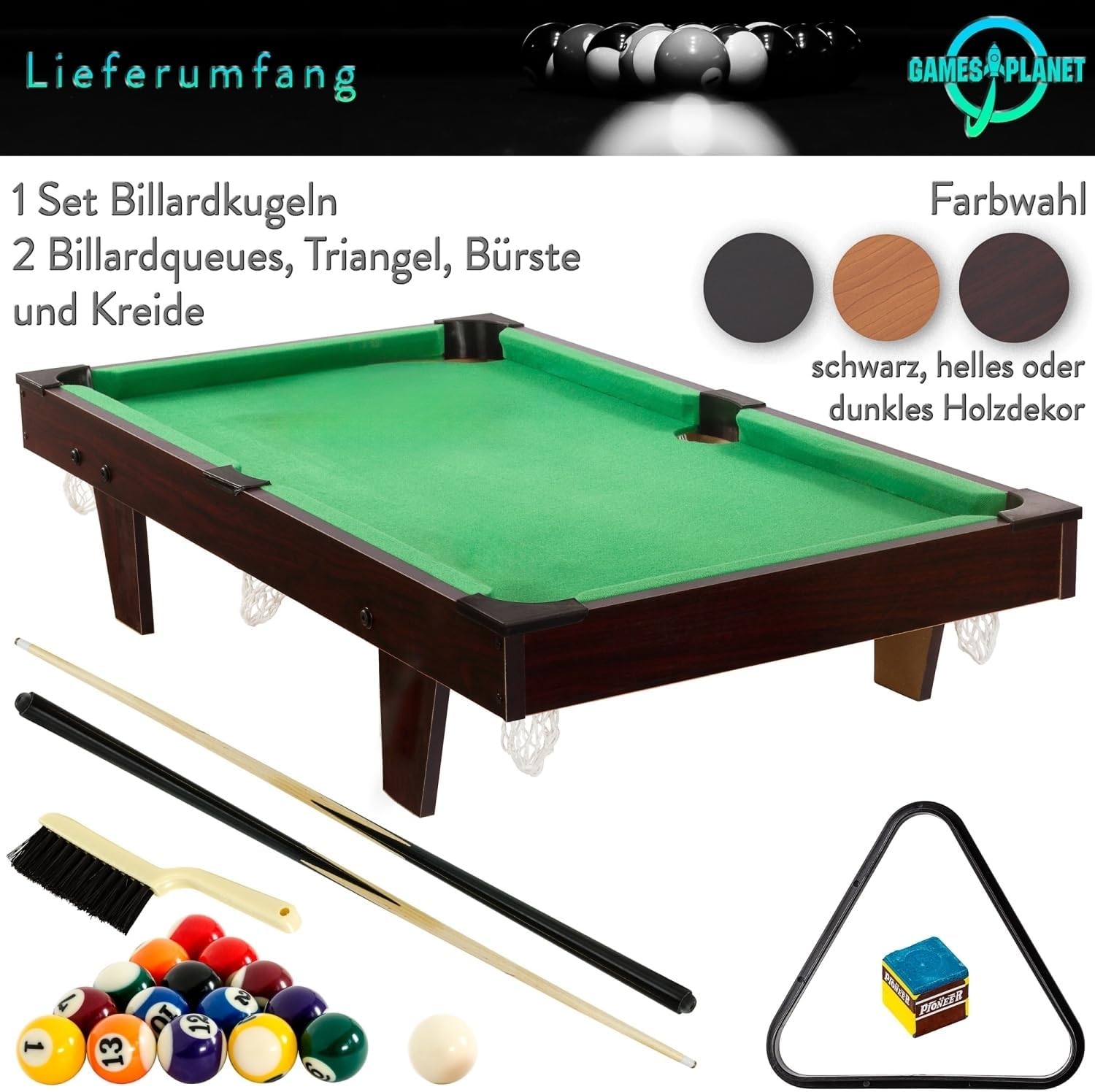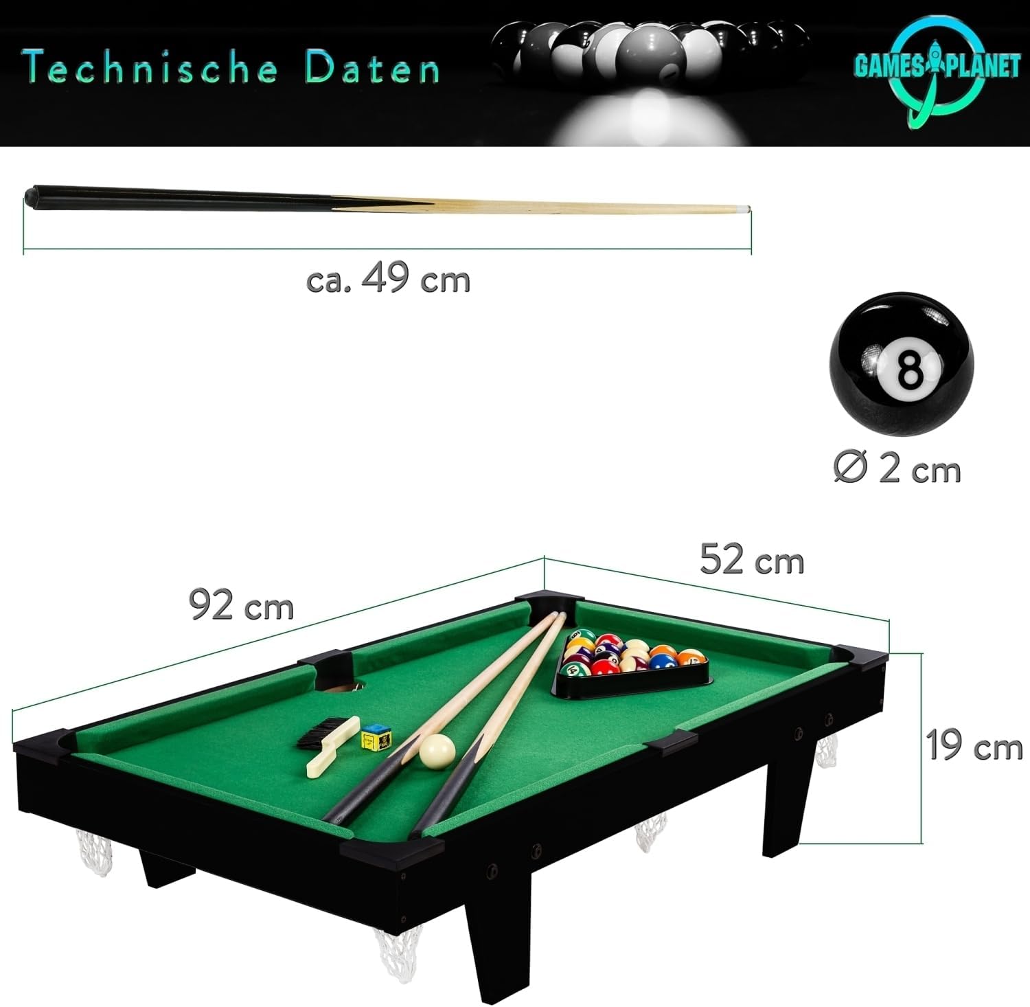 Dimensioni del tavolo da biliardo: ca. 92 cm (L) x 52 cm (L) x 19 cm (A), peso: ca. 8 kg, materiale del corpo: MDF Scelta del colore del corpo: nero / decoro legno chiaro / decoro legno scuro, colore del tessuto: verde Testato per sostanze nocive 6 tasche porta palline Incl. 2 stecche da biliardo, set di palline, gesso, triangolo, pennello