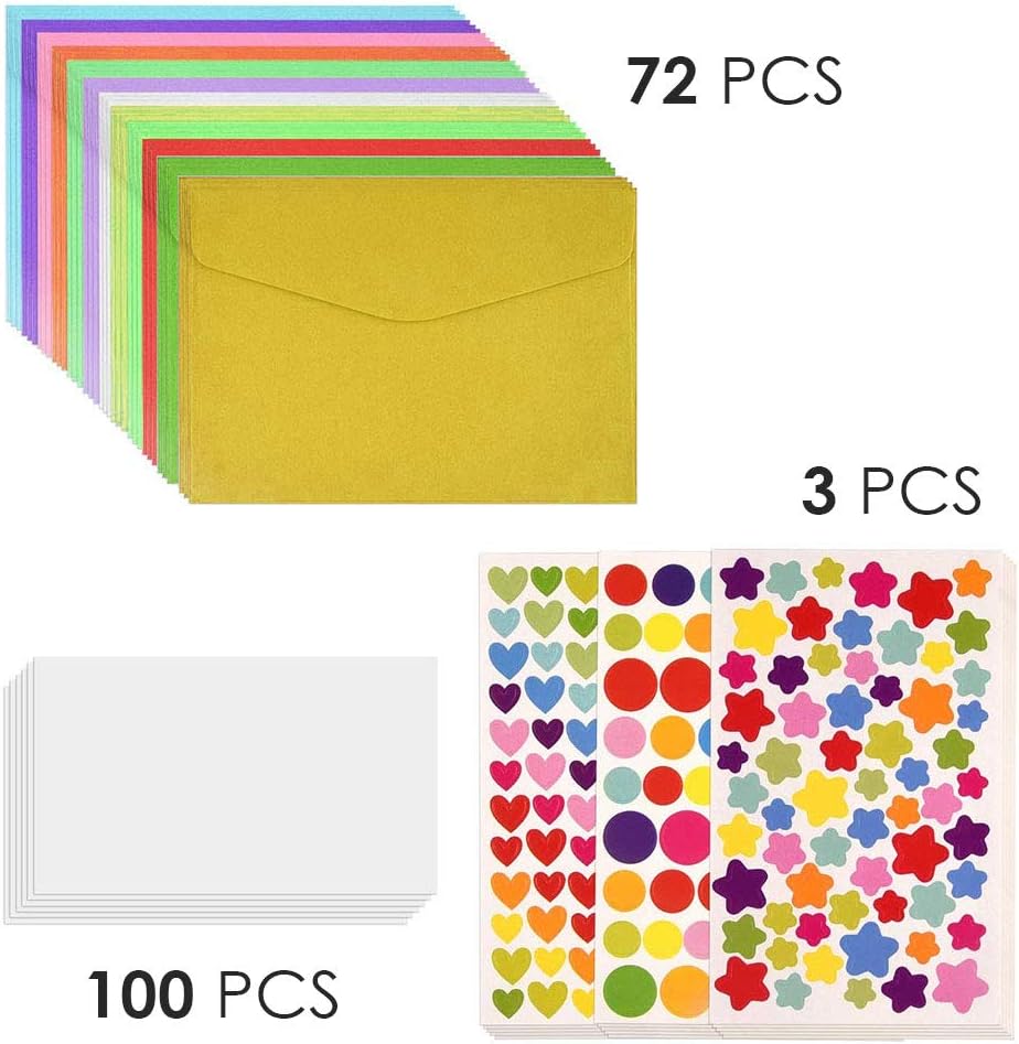 Set di buste --- Il pacchetto include mini buste da 72 pezzi, 100 carte bianche vuote e adesivi da 3 fogli. Totalmente 175 pezzi. Colori e quantità sufficienti per soddisfare le diverse esigenze. 12 Colori assortiti --- Compresi viola, bianco, viola chiaro, verde chiaro, pelle bovina, rosa, arancione, rosso, giallo chiaro, azzurro, verde, giallo. Vivace e vario per soddisfare le tue esigenze artigianali. Scrivi il tuo desiderio --- Puoi scrivere il miglior desiderio sulle buste. Personalizza le tue buste con parole speciali per esprimere i tuoi sentimenti in vari stili. Può essere utilizzato per unampia varietà di occasioni. Personalizza il tuo stile --- Le buste non vengono stampate, puoi personalizzarle con il tuo messaggio o disegno, le buste di carta possono essere dipinte, timbrate, inchiostrate, stampate e abbellite. Ampio utilizzo --- Dimensioni adatte per mini carte regalo, etichette regalo, auguri di compleanno, lettere e indovinelli, buone come forniture per le vacanze, Natale, Capodanno, San Valentino e così via.