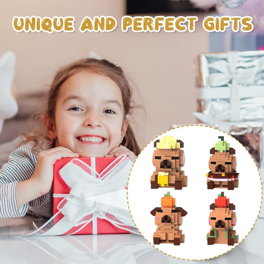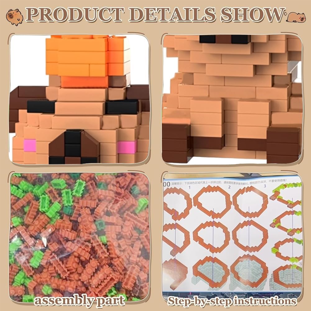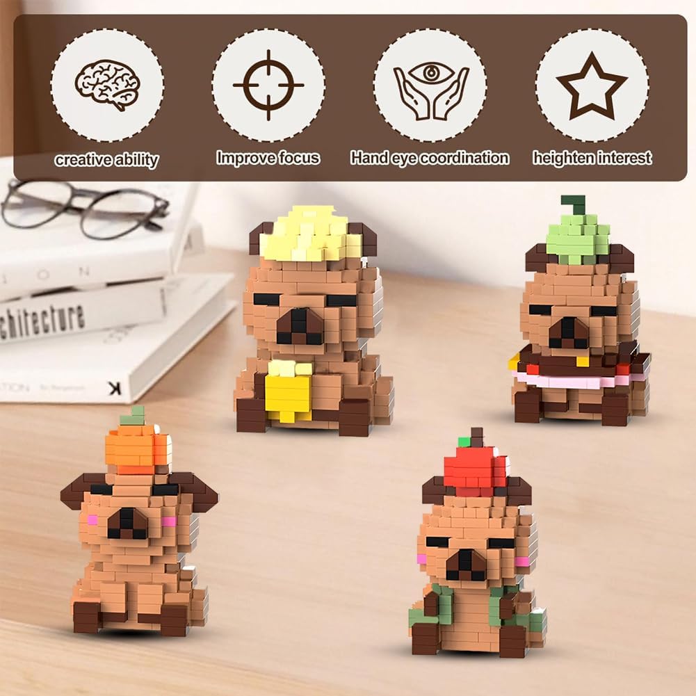 【Contenuto del set】questo set di giocattoli da costruzione Capybara contiene quattro personaggi unici, istruzioni dettagliate e pezzi di ricambio. È adatto per la costruzione congiunta per individui o famiglie e offre ai bambini dai 14 anni di età e agli adulti un sacco di divertimento durante il montaggio. È ideale per promuovere la capacità di concentrazione. 【Materiali di alta qualità】i giocattoli da costruzione Capybara hanno una superficie liscia senza sbavature, si incastrano facilmente, hanno colori brillanti e durevoli ed è stabile, quindi non si sfalda anche dopo lunghi periodi di costruzione. 【Facile da montare】il set di mini mattoncini da costruzione unisce facilità d'uso e divertimento durante l'assemblaggio. Il kit Capybara contiene istruzioni illustrate. Il montaggio allena la coordinazione occhio-mano e l'immaginazione spaziale. I bambini possono assemblare autonomamente le forme di base. 【Forme carine】il set di quattro mini mattoncini Capybara ha le proprie caratteristiche distintive e riproducono le simpatiche espressioni facciali e le caratteristiche. Dopo il montaggio, possono essere utilizzati come decorazione da tavolo. Le forme uniche hanno valore da collezione e valore espositivo e sono un must per i fan di Capybara. 【Regalo a sorpresa】il set di mini mattoncini da costruzione è una grande sorpresa sia come regalo di compleanno per bambini che come pezzo da collezione per gli amanti dei mattoncini da costruzione. Questo set di mattoncini non è solo un giocattolo, ma anche un regalo creativo che dà un senso di realizzazione.