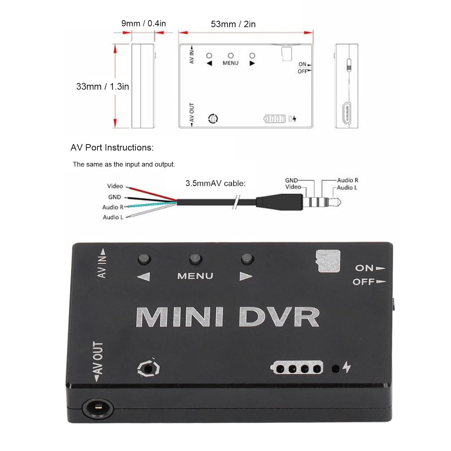 Alta qualità: il guscio è realizzato in materiale in lega di alluminio, con piccolo volume, peso leggero, basso consumo energetico e corrente di lavoro di 200 Ma. Tempo di lavoro lungo: supporto da 32 GB di piccole schede di memoria (livello 10 consigliato). Costruito in 3,7 V Batteria polimerica a ioni di litio da 400 mAh, ora di lavoro da 1,5 a 2 ore. Funzione multipla: menu multi -lingua, è possibile selezionare 11 lingue di menu. Interfaccia di ricarica USB universale, indicazione di alimentazione della batteria ad alta precisione 4. Ingresso e output: ingresso del segnale CVBS (decodificatore video integrato), riproduzione di riproduzione e uscita del segnale AV (codificatore video integrato). Il formato di input video è NTSC e PAL, che possono essere cambiati. Prestazioni stabili: produzione professionale, artigianato e alta precisione aiutano a fornire prestazioni stabili per soddisfare le tue varie esigenze.