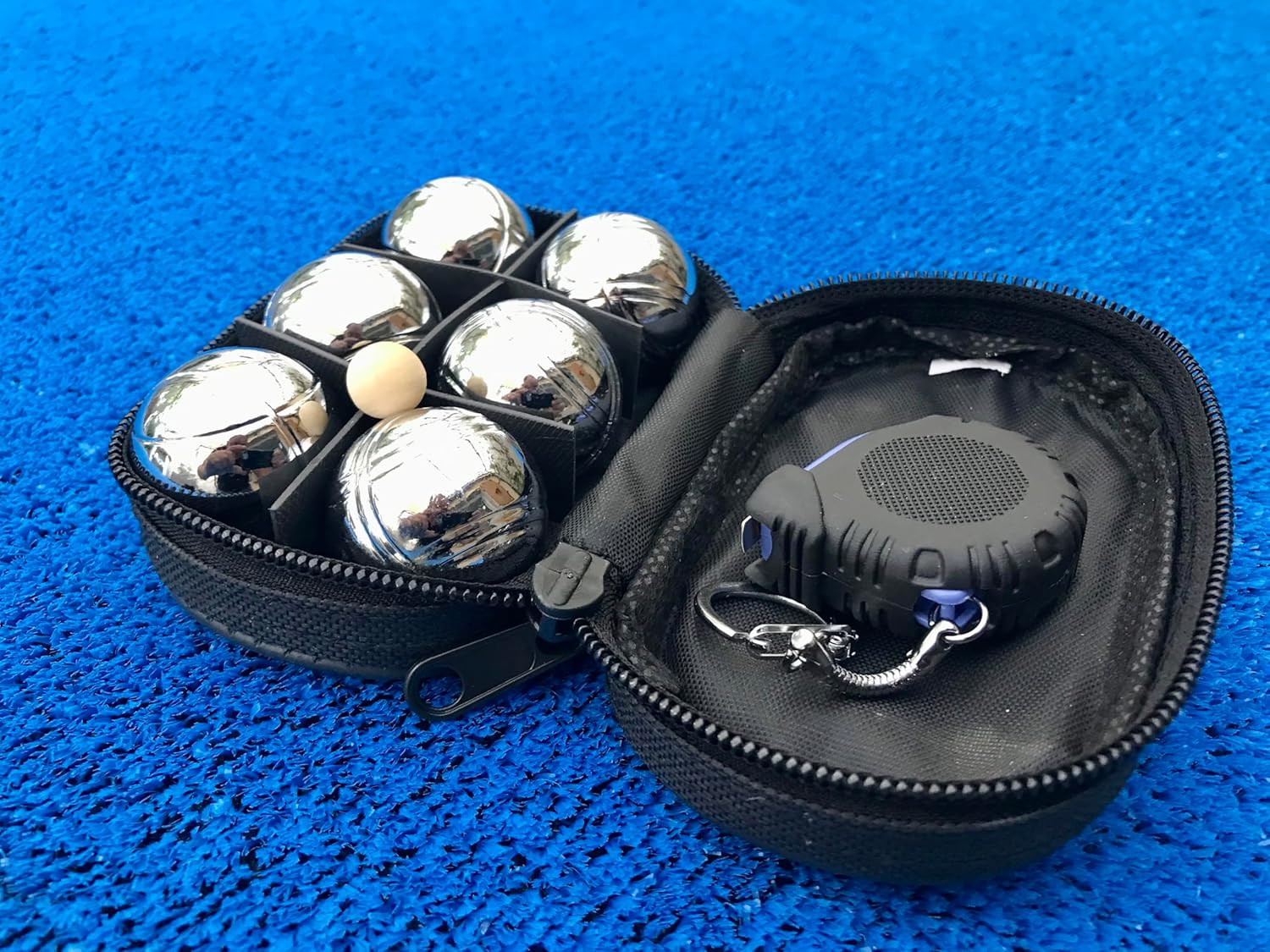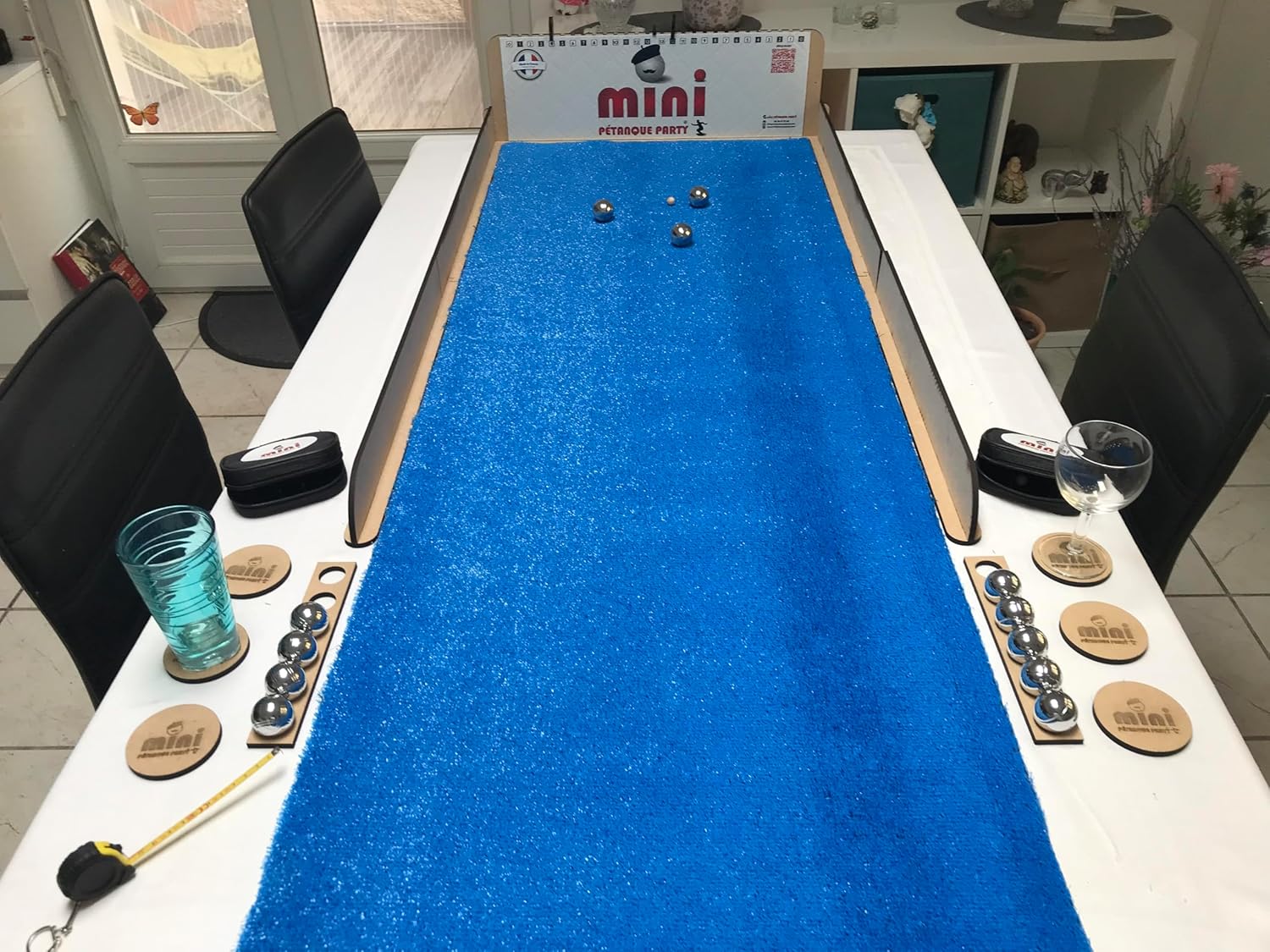 | Composants inclus | 1 MINI Cercle (diamètre : 20 cm) + 1 MINI mètre (38 x 38 mm), 1 revêtement lino anti-bruit & protecteur table intégré (L 170 x l 60 cm), 1 tapis synthétique bleu 7 mm (L 170 x l 60 cm), 2 sacoches de 6 MINI boules métalliques (33 mm - 60 g) + 2 MINI cochonnets en bois de hêtre (1 cm - 10 g), NOUVEAU & OFFERT : 2 Reposes 6 MINI Boules + 6 Sous Verres en bois MDF |