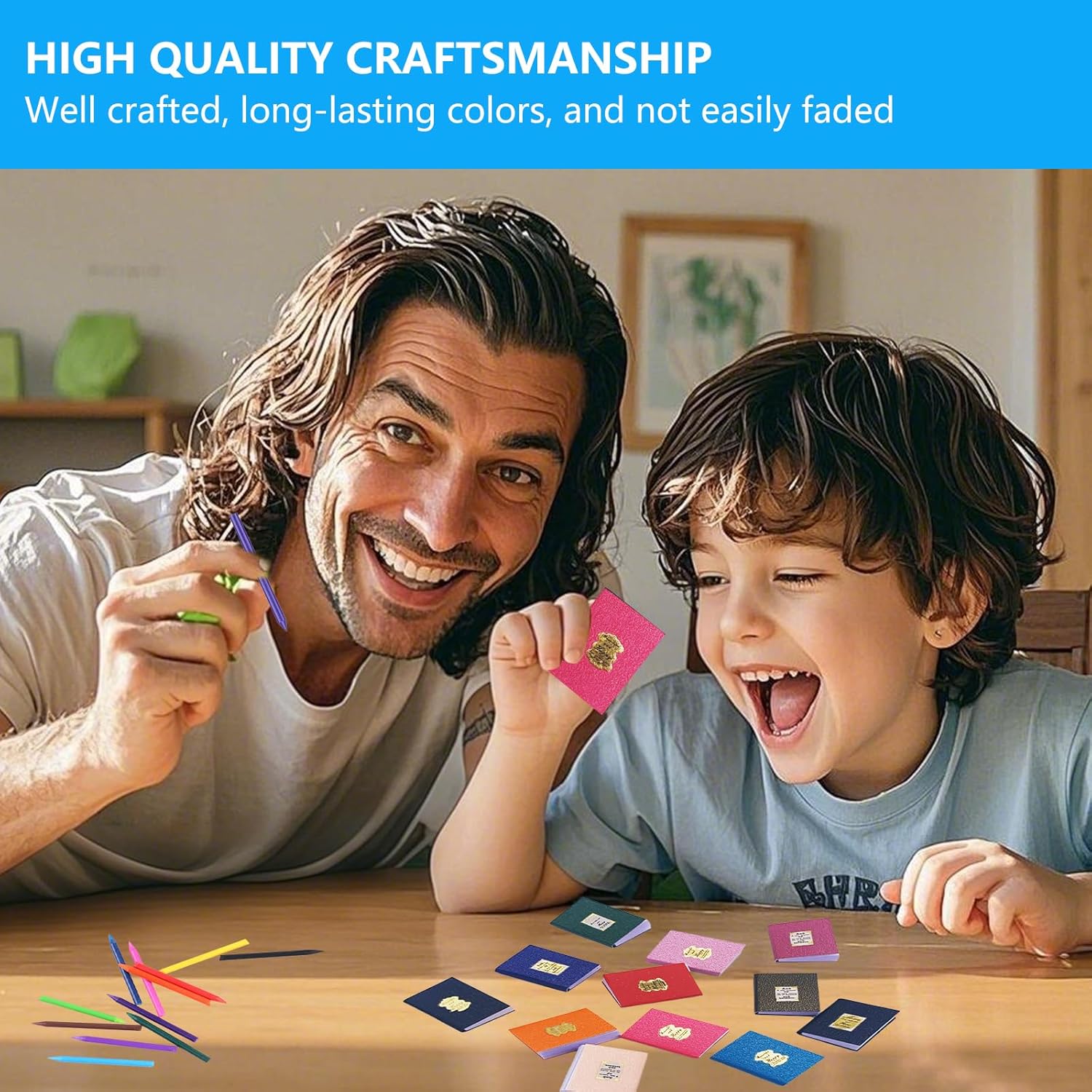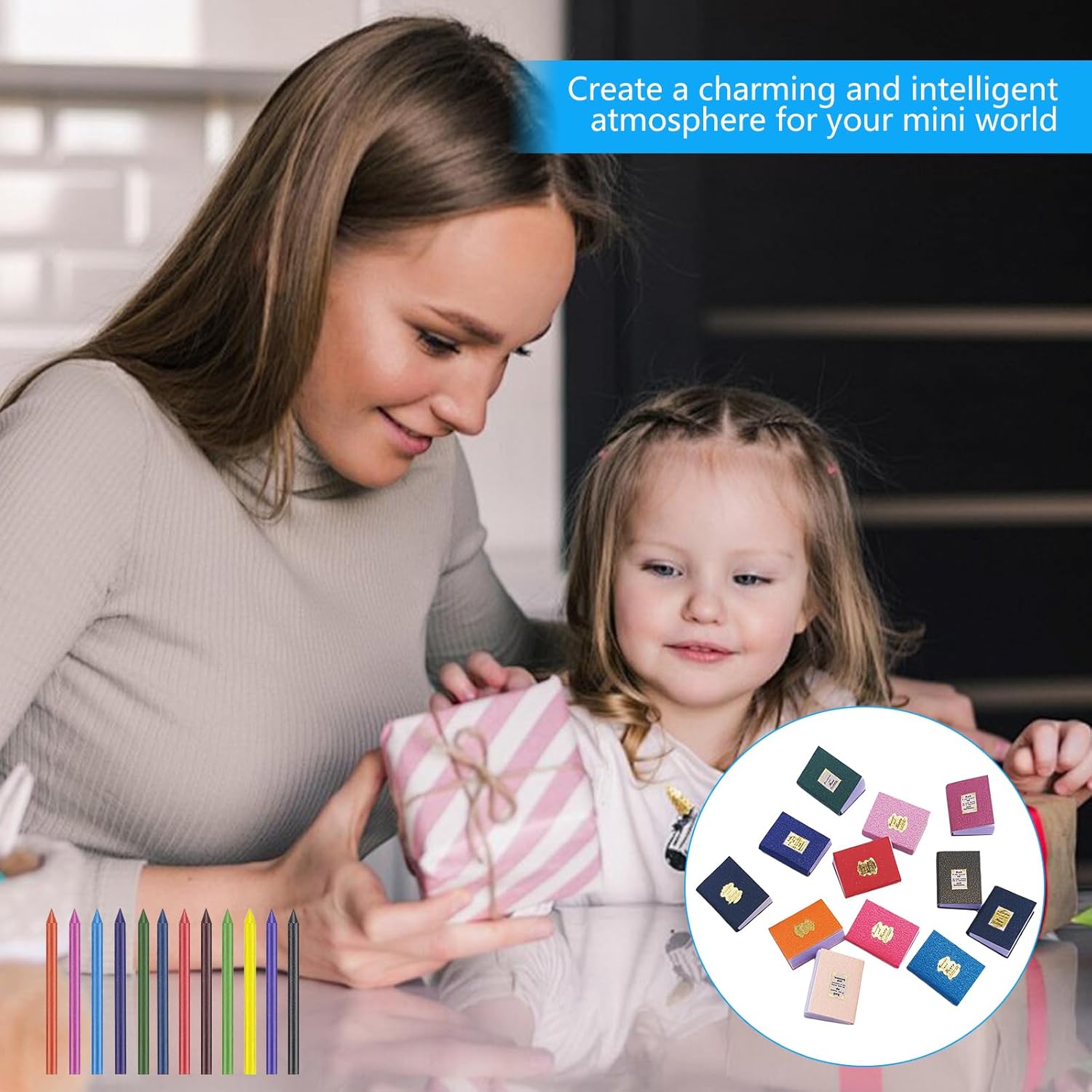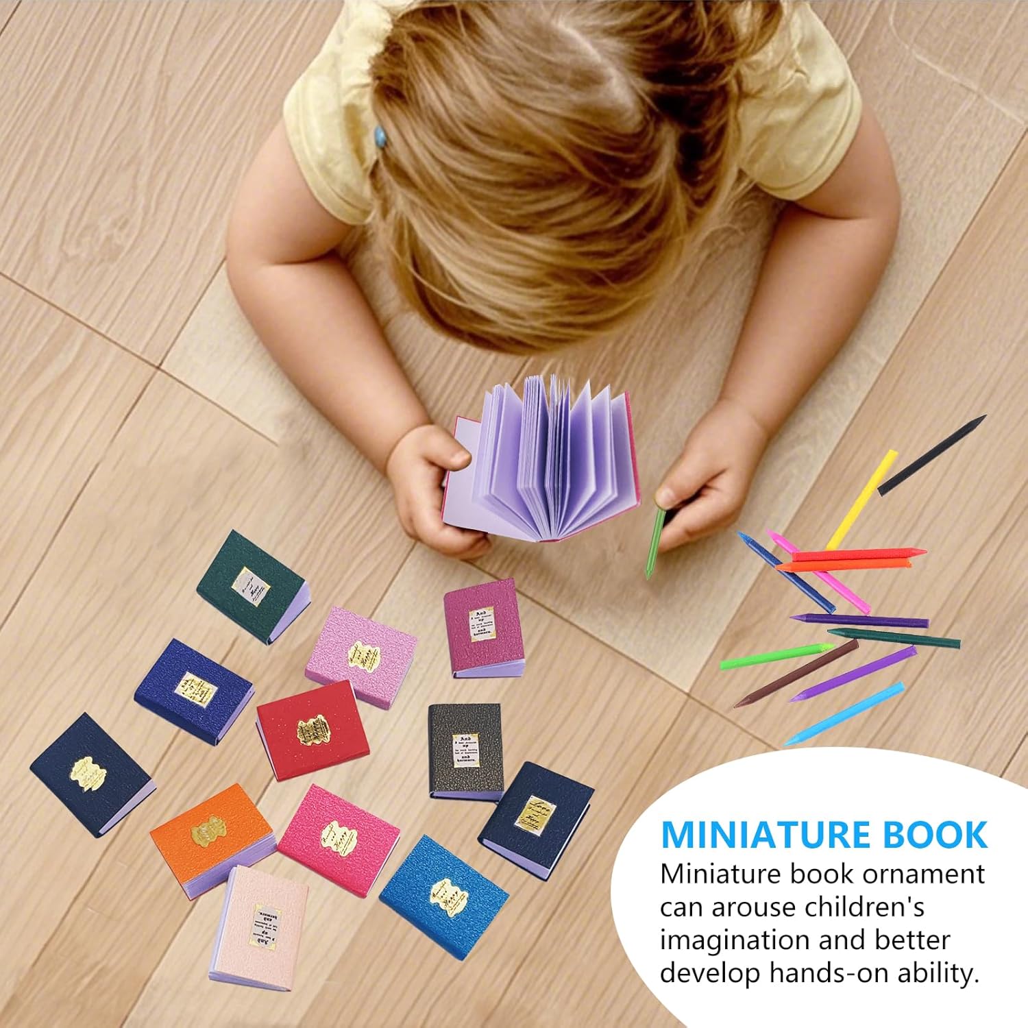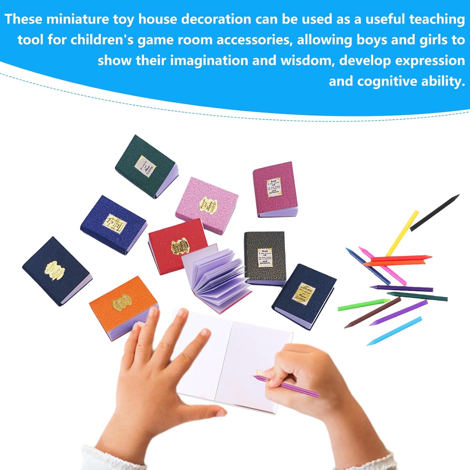 Miniature per casa delle bambole --- Offriamo un set di 48 mini libri in scala 1:12 con 12 colori diversi, 1 pinzetta per taccuino e 12 mini pastelli. Un assortimento sufficiente per giocare con amici o familiari, e perfetto per decorare la tua casa delle bambole. Materiali affidabili e sicuri --- I mini libri e le lavagne per la casa delle bambole sono realizzati con carta di alta qualità, senza odori e sicuri. I mini pastelli sono fatti di cera, garantendo durabilità e vivacità per dare vita alla tua casa delle bambole. Design in miniatura dettagliato --- Questo set in scala 1:12 è progettato con dettagli realistici che non occupano troppo spazio. È ideale per creare scene di apprendimento nella casa delle bambole, ambientazioni di aula scolastica o giochi di ruolo, offrendo un'esperienza di gioco autentica. Perfetto per lo sviluppo creativo dei bambini --- Questi mini accessori per casa delle bambole stimolano le abilità motorie e la creatività dei bambini. I diversi colori dei pastelli aiutano a sviluppare il riconoscimento dei colori, e i mini pastelli possono anche essere usati per scrivere e disegnare su carta, favorendo l'interazione genitore-figlio. Versatile e decorativo --- I nostri accessori per casa delle bambole non solo decorano scrivanie, camere da letto e soggiorni, ma sono ideali anche per giardini in miniatura e vetrine di negozi. Un'aggiunta perfetta per qualsiasi ambiente in miniatura, portando un tocco di realismo e creatività.