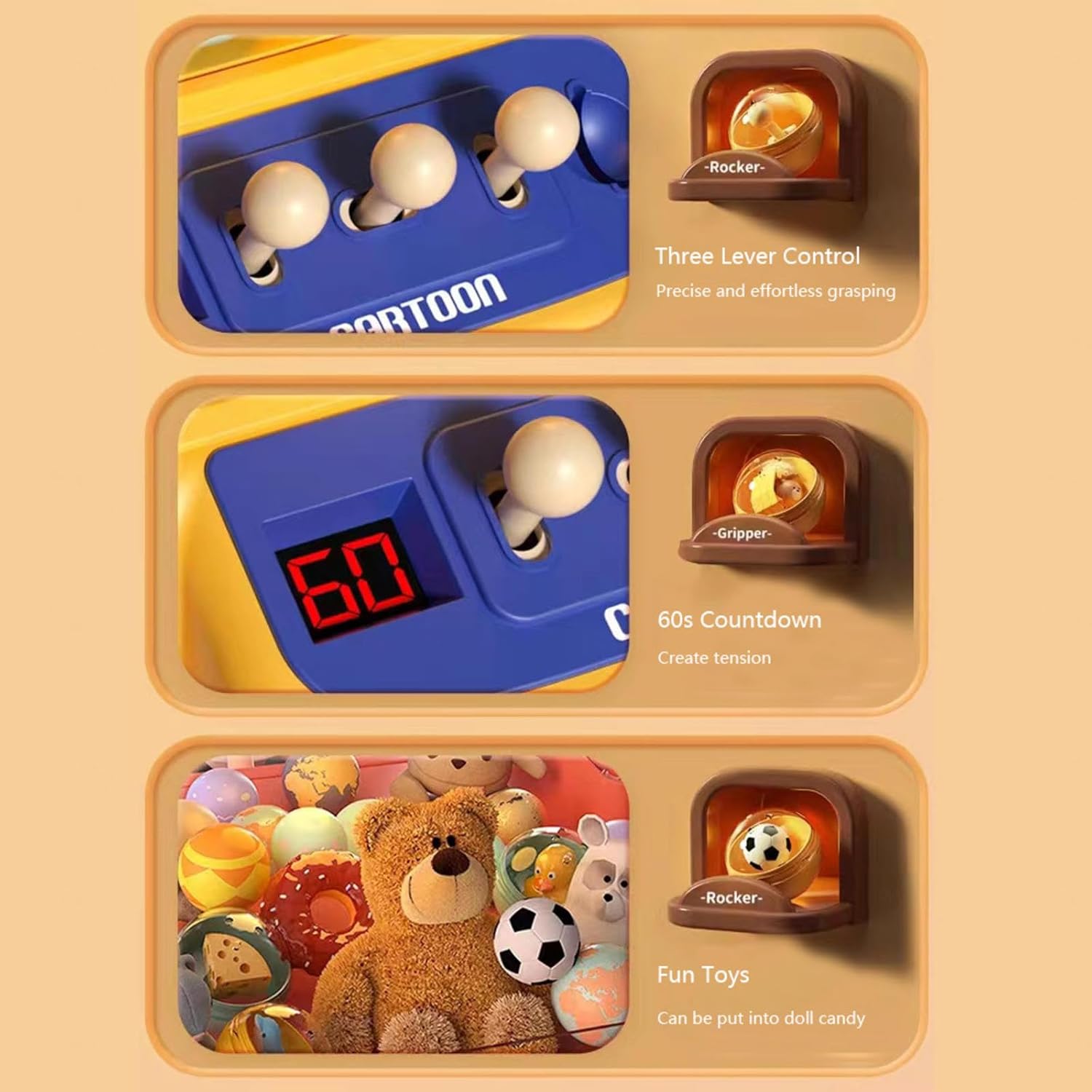 ORE DI DIVERTIMENTO:Trasforma Questa Macchina per Artigli per Bambini in Una Competizione per Famiglie! Sfidatevi L'un L'altro.Perderete Sicuramente La Cognizione Del Tempo Con Il Nostro Candy Grabber. MUSICA E LUCE:The Claw Machine Toys Ha Una Varietà Di Musica E Luci Colorate. Per Fare Una Competizione Divertente, Abbiamo Progettato La Modalità Sfida Di 60 Secondi. I Bambini Possono Competere Con Genitori O Amici. ALTRI MODI DI GIOCARE:La Nostra Giocattolo Artiglio per Bambini Ha 3 Joystick.Oltre Ai 25 Giocattoli Di Peluche,2 Panda Doll,20 Gashapon,20 Monete Da Gioco Inclusi Nel Set,Puoi Anche Aggiungerne Alcuni I Giocattoli Preferiti Di Altri Bambini per Aggiungere Divertimento. MODALITÀ DOPPIA ALIMENTAZIONE:Le Dimensioni Di Questa Mini Claw Machine Sono Appena Sufficienti per Mettere Le Caramelle Preferite Di Alcuni Bambini, Piccoli Giocattoli.4 Batterie AA Sono Necessarie E Non Incluse. Il Cavo USB (Incluso) PUò Essere Utilizzato Anche. REGALO PERFETTO:La Nostra Mini Candy Grabber per Bambini è Un Fantastico Distributore Di Premi. È Un Regalo Perfetto per Feste, Compleanni, Festa Dei Bambini, Pasqua, Natale, Halloween, Ringraziamento E Capodanno.