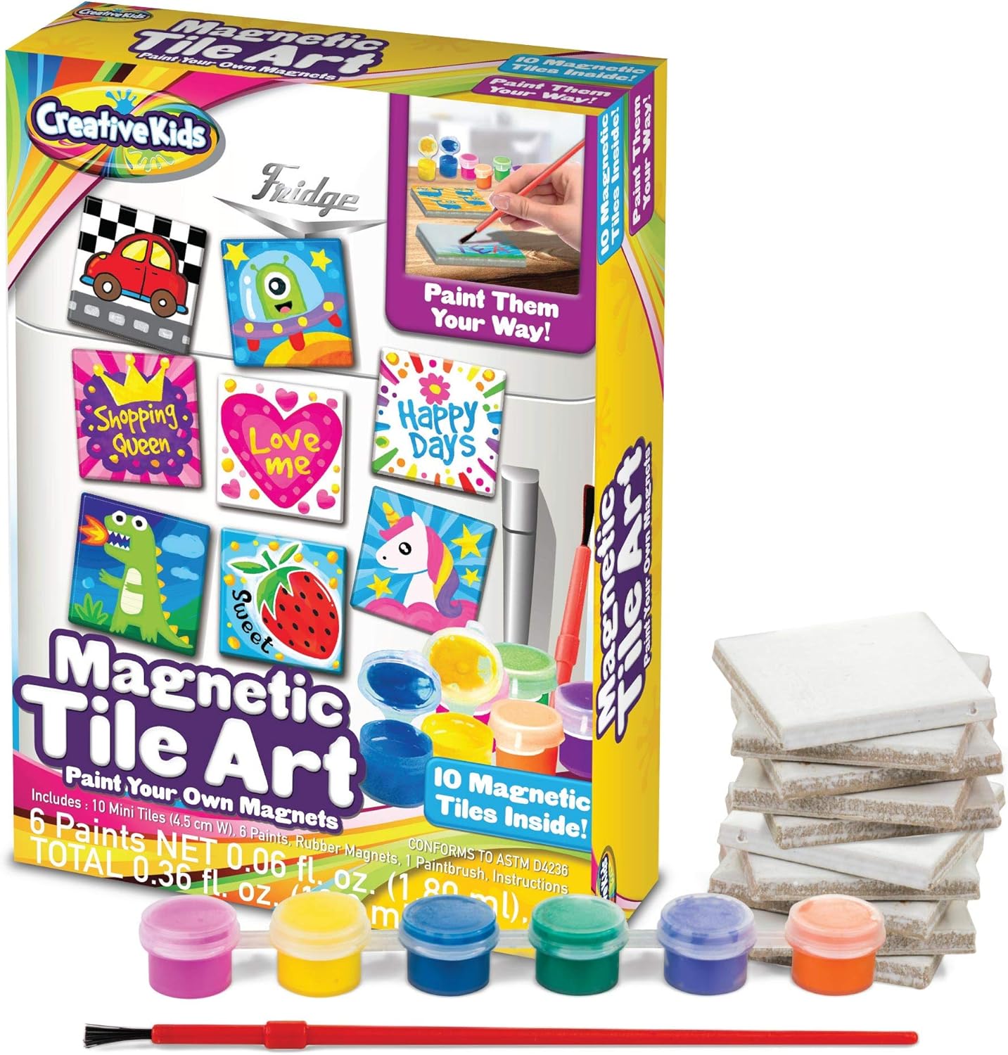 | Included Components | 1 x Tile Art kit from Creative Kids 10 x blank magnet tiles for kids’ beautification 6 x primary and secondary paint colors 1 x paint brush Tips for making fabulous ornaments |