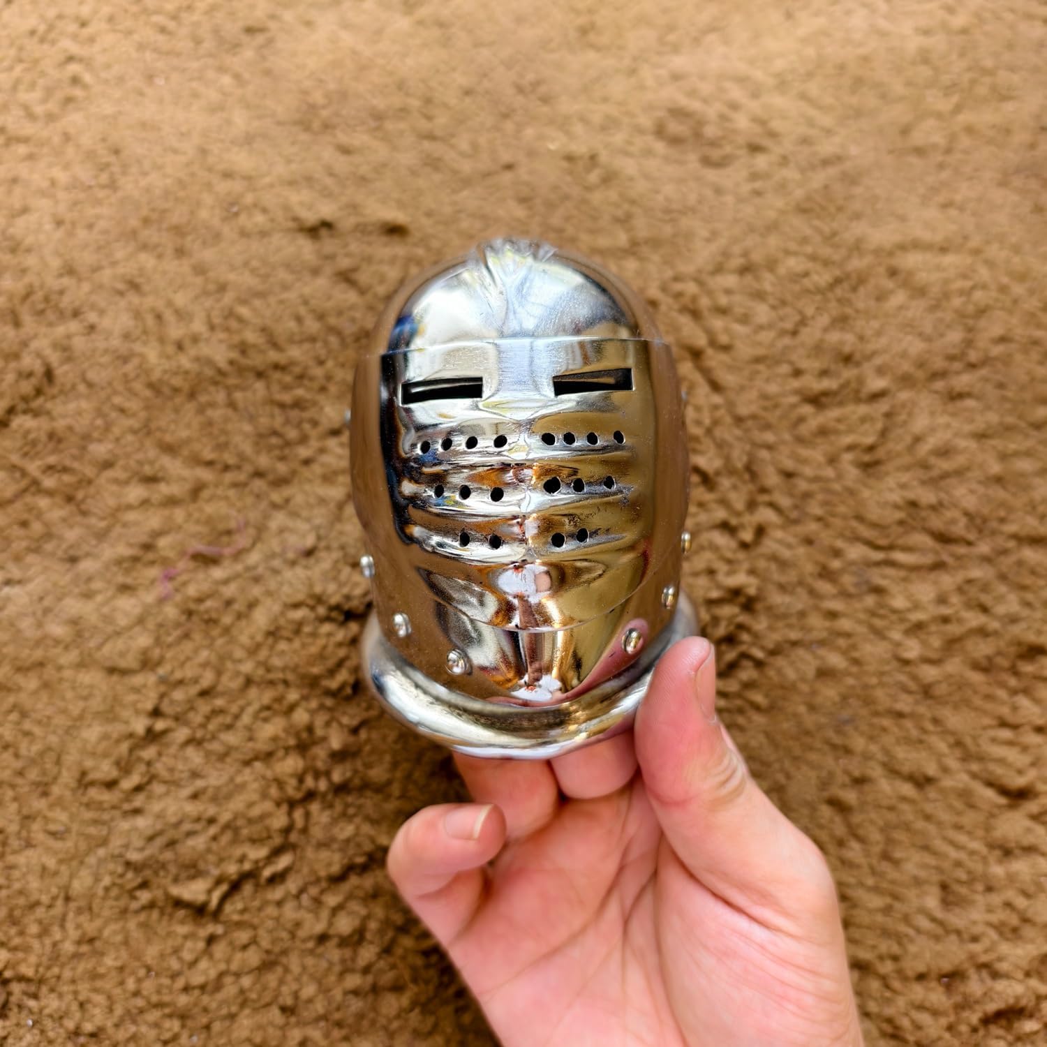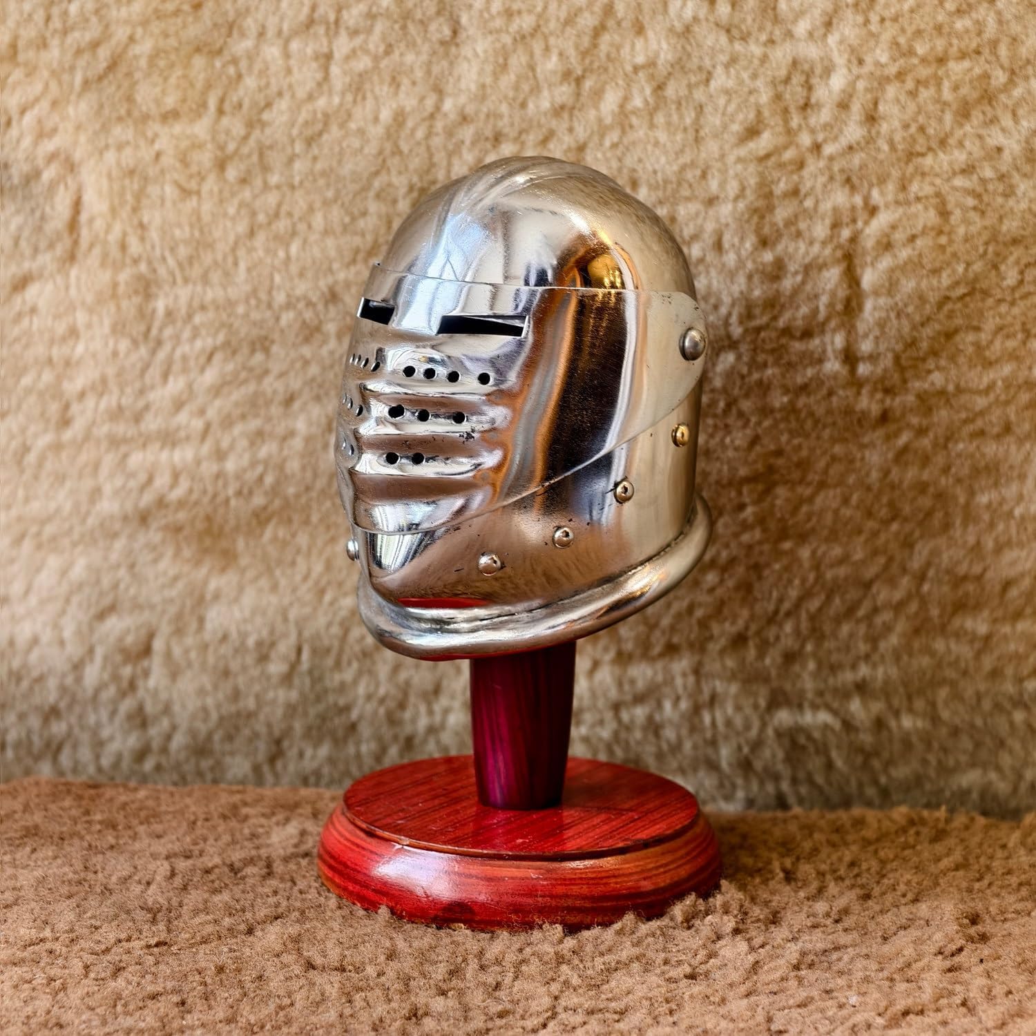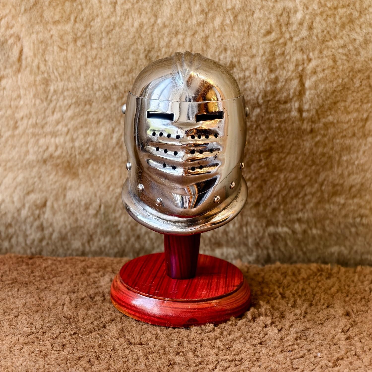 Fate un salto indietro nel tempo con questa splendida replica in miniatura 'elmo del cavaliere Massimiliano, un omaggio splendidamente dettagliato all'armatura medievale europea. Questa miniatura, realizzata con cura meticolosa, cattura la caratteristica e formidabile presenza scanalata degli elmi originali di Massimiliano, rendendola un pezzo accattivante for qualsiasi appassionato di storia o collezionista. Realizzato in metallo di alta qualità con una finitura lucida, il casco vanta caratteristiche realistiche, tra cui le fessure for la visiera e i fori di ventilazione, che dimostrano un'eccezionale maestria nella sua forma ridotta. Viene fornito con un solido supporto in legno elegantemente rifinito, progettato for sostenere e esporre perfettamente il casco, esaltandone l'impatto visivo.