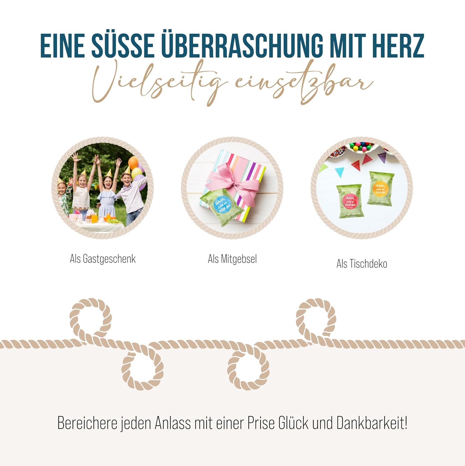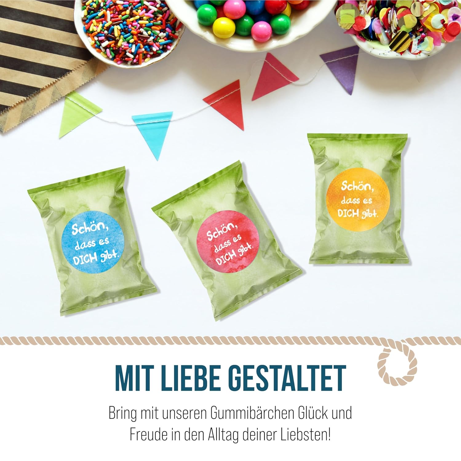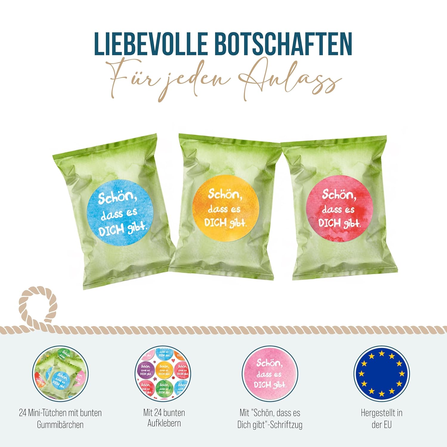 ATTENZIONE: I piccoli sacchetti di orsetti gommosi sono ideali per rendere felici amici, ospiti, colleghi o bambini con un dolce messaggio - perfetti come piccolo regalo con un cuore CON UN MESSAGGIO CALDO: Ciascuno dei 24 sacchetti viene fornito con un adesivo colorato con la scritta "È bello che esisti", che può essere attaccato sulla confezione PER FESTEGGIAMENTI E MOMENTI SPECIALI: Che si tratti del compleanno di un bambino, anniversario, matrimonio, festa della mamma, evento aziendale o matrimonio - i mini sacchetti sono un simpatico auguri di benvenuto o di addio con un tocco personale DECORATIVO E PRATICO: con 11 g di caramelle alla frutta per confezione nel formato 7 × 9 cm, le caramelle sono pratiche e versatili e possono essere utilizzate come decorazioni da tavola, piccoli omaggi o regali per gli ospiti FATTE CON TANTO AMORE: Prodotte con cura nell'UE, le mini bag colpiscono per le loro deliziose caramelle alla frutta, il design colorato e gli usi versatili. Ideale per chi vuole portare grande gioia con piccoli gesti