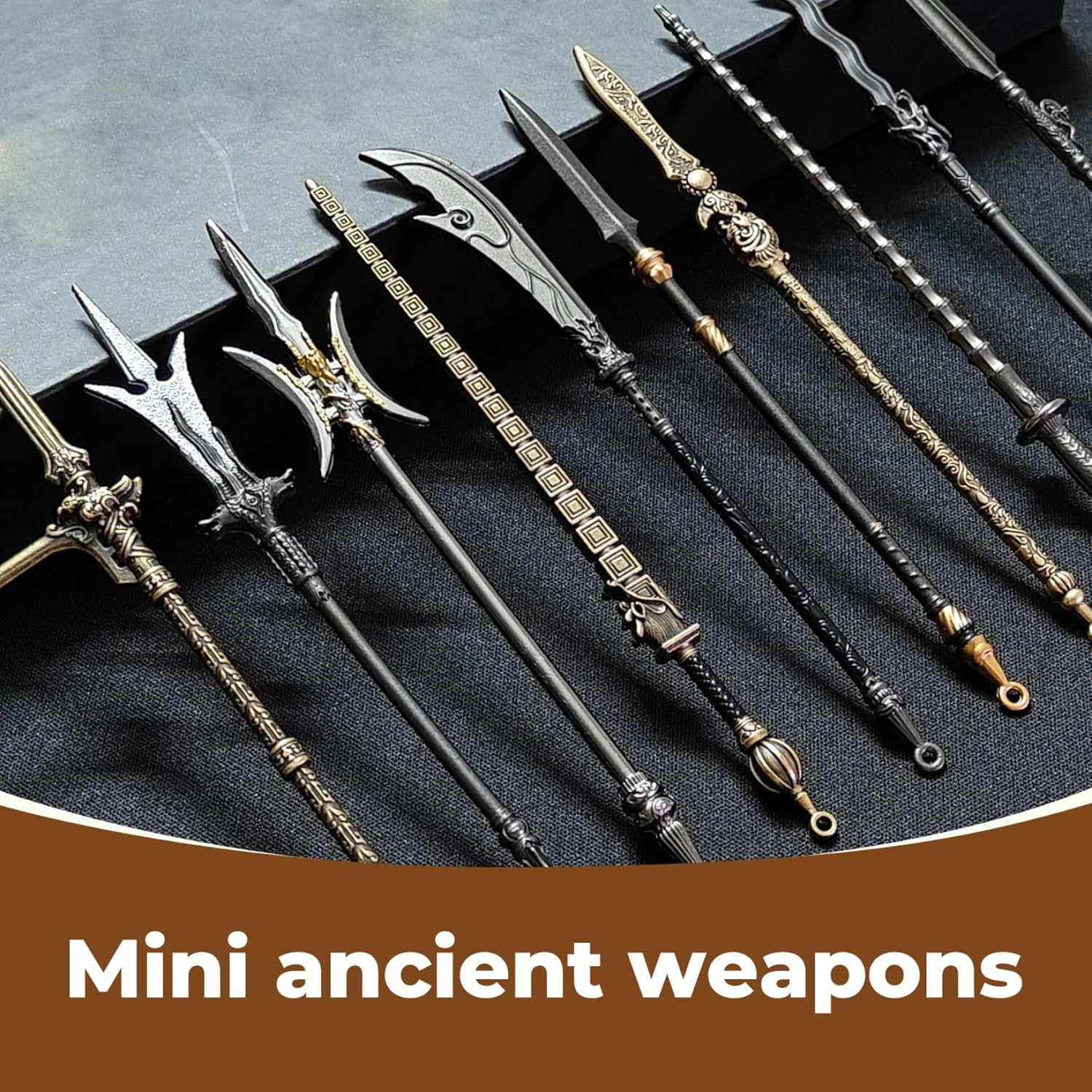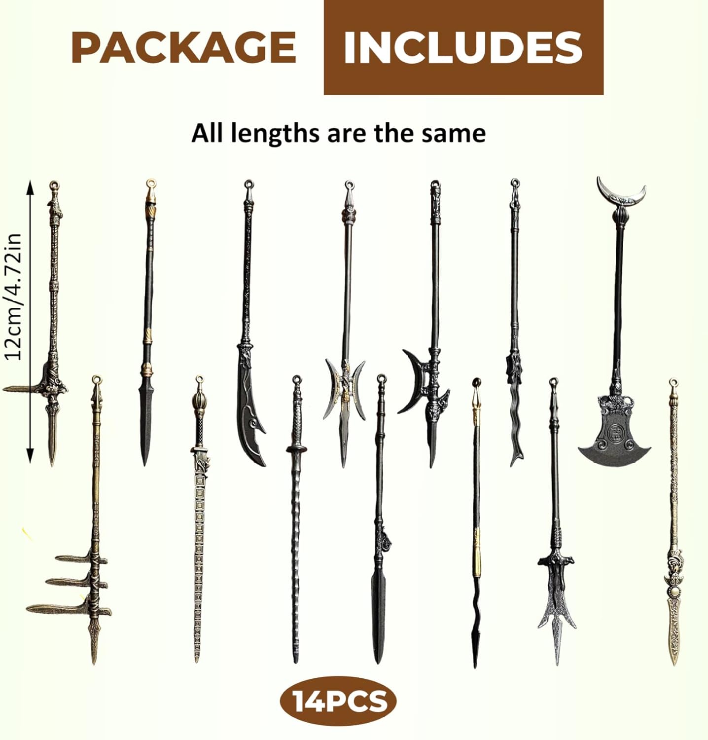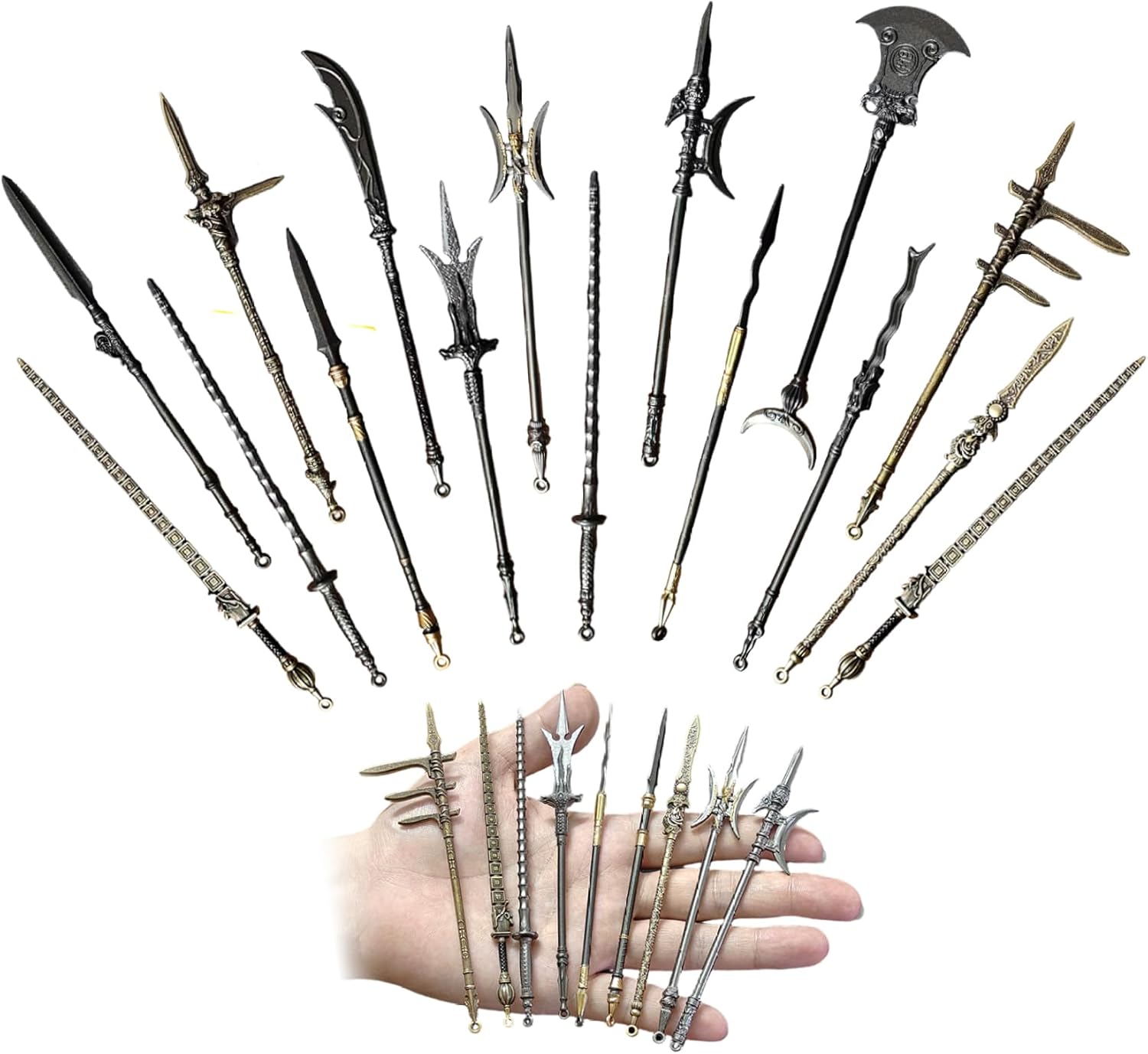 Dimensione compatta e da collezione: ogni arma misura circa 5 pollici, rendendole facili da visualizzare, archiviare o trasportare..Perfetto per collezionisti, appassionati o come antipasti di conversazione unici. Varietà di armi antiche: questo set da 14 pezzi include una selezione diversificata di mini armi come Lance, Halberd, Spear, Dagger-Asse e altro, catturando l'essenza del design storico di combattimento. Artigianato dettagliato e realistico: ogni pezzo presenta trame finemente incise e forme di ispirazione storicamente, rendendo questo set un'aggiunta straordinaria a qualsiasi collezione fantasy, storica o in miniatura. Build in lega di zinco: realizzate in lega di zinco di qualità, queste armi in miniatura sono sia leggere che molto robuste, offrendo valore duraturo senza compromettere i dettagli dall'aspetto autentico. Perfetto per gli appassionati: ideale per i fan della storia, della fantasia o delle antiche armi, questo set rende creativo e ponderato per compleanni, vacanze o come display da scrivania decorativa.