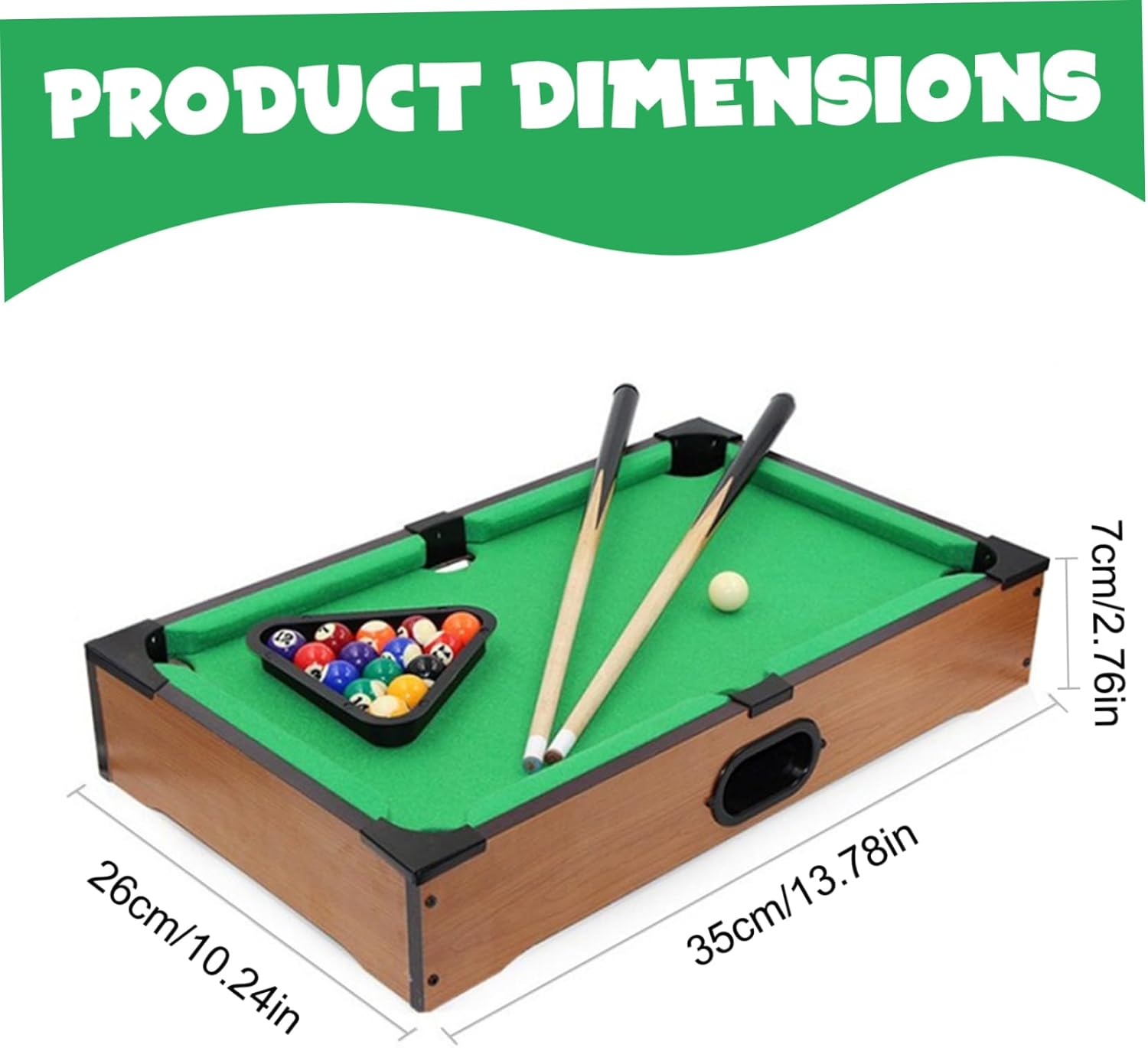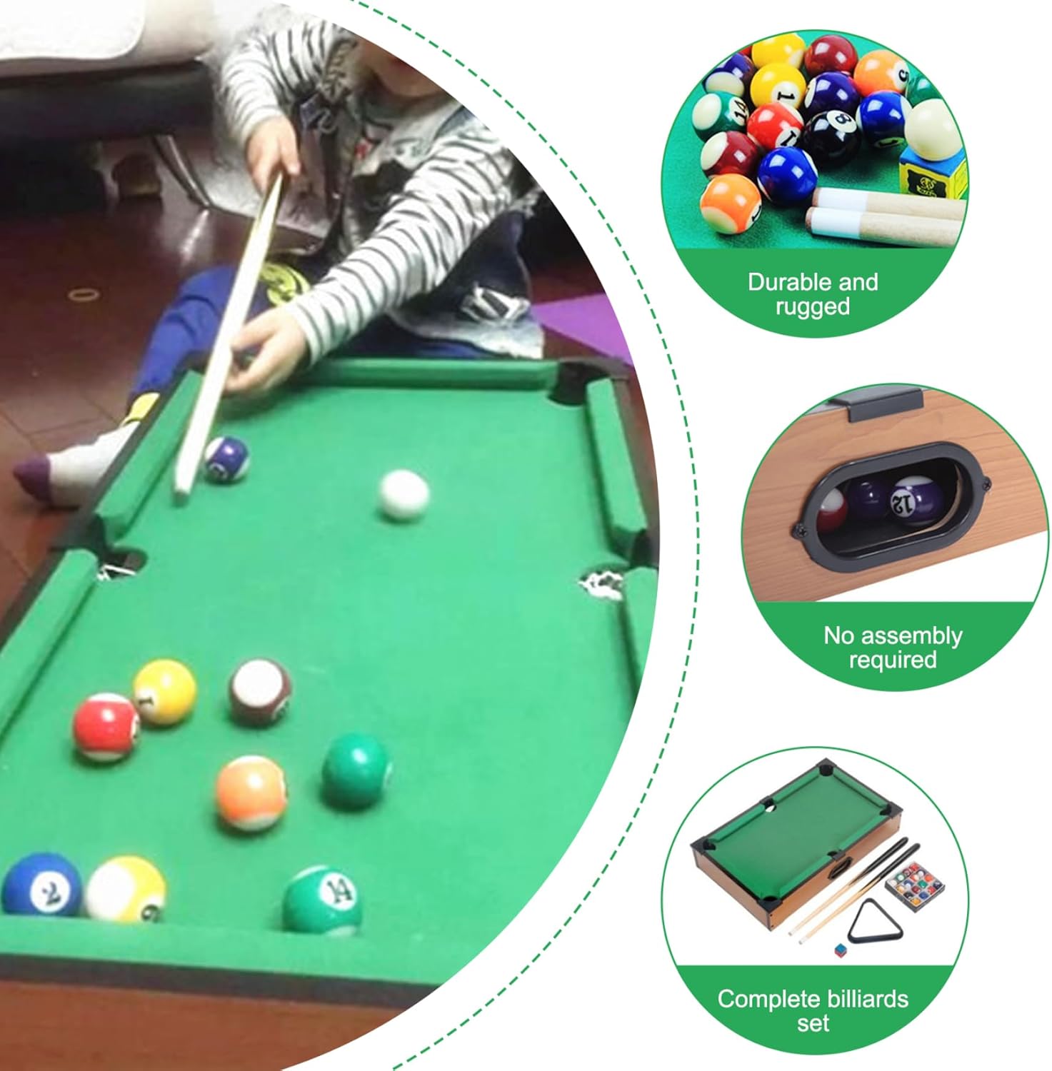 Ottimo: un unico per compleanni, vacanze o occasioni speciali..Ideale per coloro che amano i giochi, questo mini tavolo da biliardo porterà sicuramente gioia e intrattenimento a qualsiasi destinatario. Set completo per il gioco istantaneo: il set include mini palle da biliardo, due segnali di piscina, un rack a triangolo e un tavolo da biliardo, ogni tavolo da biliardo, tutto necessario per ore di gameplay, direttamente fuori dalla scatola. Costruzione di qualità: realizzato in scheda di densità con una superficie liscia e rivestimento in feltro, questo mini tavolo da biliardo un'esperienza di gioco realistica garantendo al contempo una durata duratura. Progettazione compatta e portatile: misurazione 10,2 x 13,8 x 2,8 pollici, questo tavolo da biliardo da tavolo è ideale per piccoli spazi..Leggero e facile da trasportare, è perfetto per la casa, l'ufficio o il divertimento di viaggio. Perfetto per tutte le età: progettato per bambini e adulti, questo mini tavolo da biliardo incoraggia il legame familiare e la competizione amichevole..È un'eccellente introduzione ai biliardi per principianti e divertimento per i giocatori esperti.
