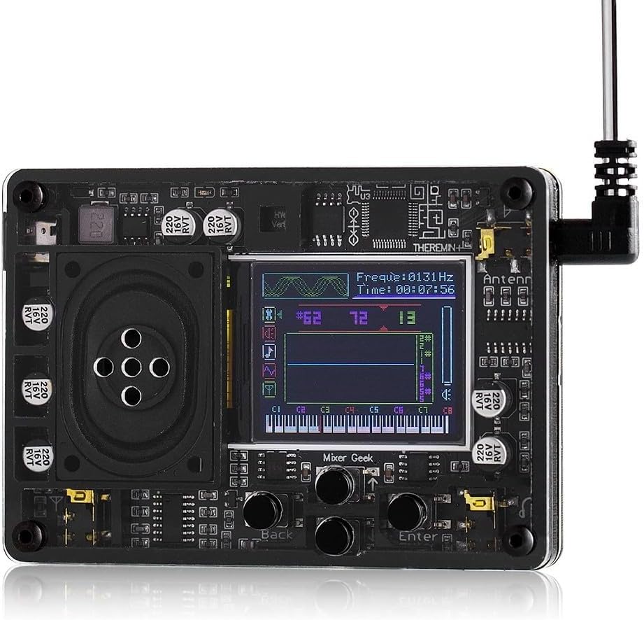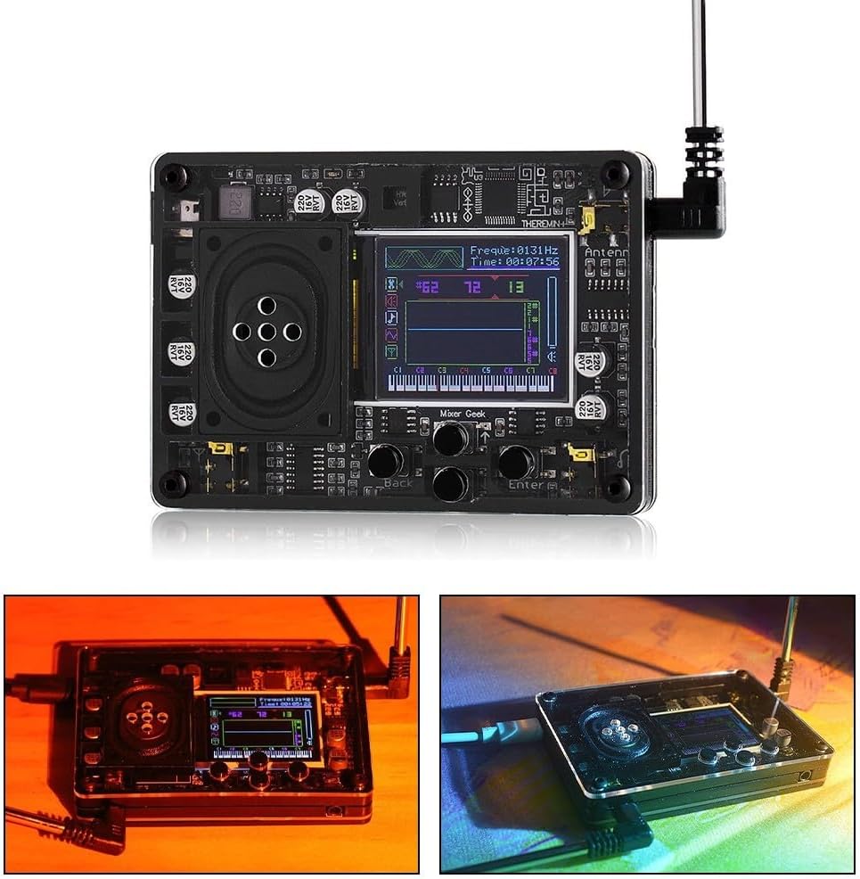 Strumento creativo con schermo: questo mini strumento elettronico musicale theremin presenta uno schermo a colori, che mostra forma d'onda, frequenza temporale e volume. L'indicatore di tono e il display del tono del pianoforte aggiungono alla sua versatilità, mentre varie impostazioni di funzione possono essere facilmente regolate utilizzando i tasti del pannello. Ampia selezione di voci: con oltre 70 voci tra cui scegliere, tra cui strumenti musicali tradizionali cinesi nazionali, questo strumento offre una vasta gamma di suoni. È altamente suonabile e perfetto per musicisti e appassionati. Altoparlanti integrati e antenne collegabili: oltre a collegarsi ad cuffie o apparecchiature audio, questo strumento è dotato di altoparlanti indipendenti. Quando è collegato a un dispositivo audio, gli altoparlanti esterni si spengono automaticamente. L'antenna collegabile è flessibile e può essere comodamente allungata, ritirata e conservata. Compatto e portatile: con un design piccolo e raffinato, questo strumento è facile da tenere e suonare. È alimentato da un'interfaccia di tipo C, che consente una facile ricarica e la flessibilità di giocare ovunque, in qualsiasi momento.