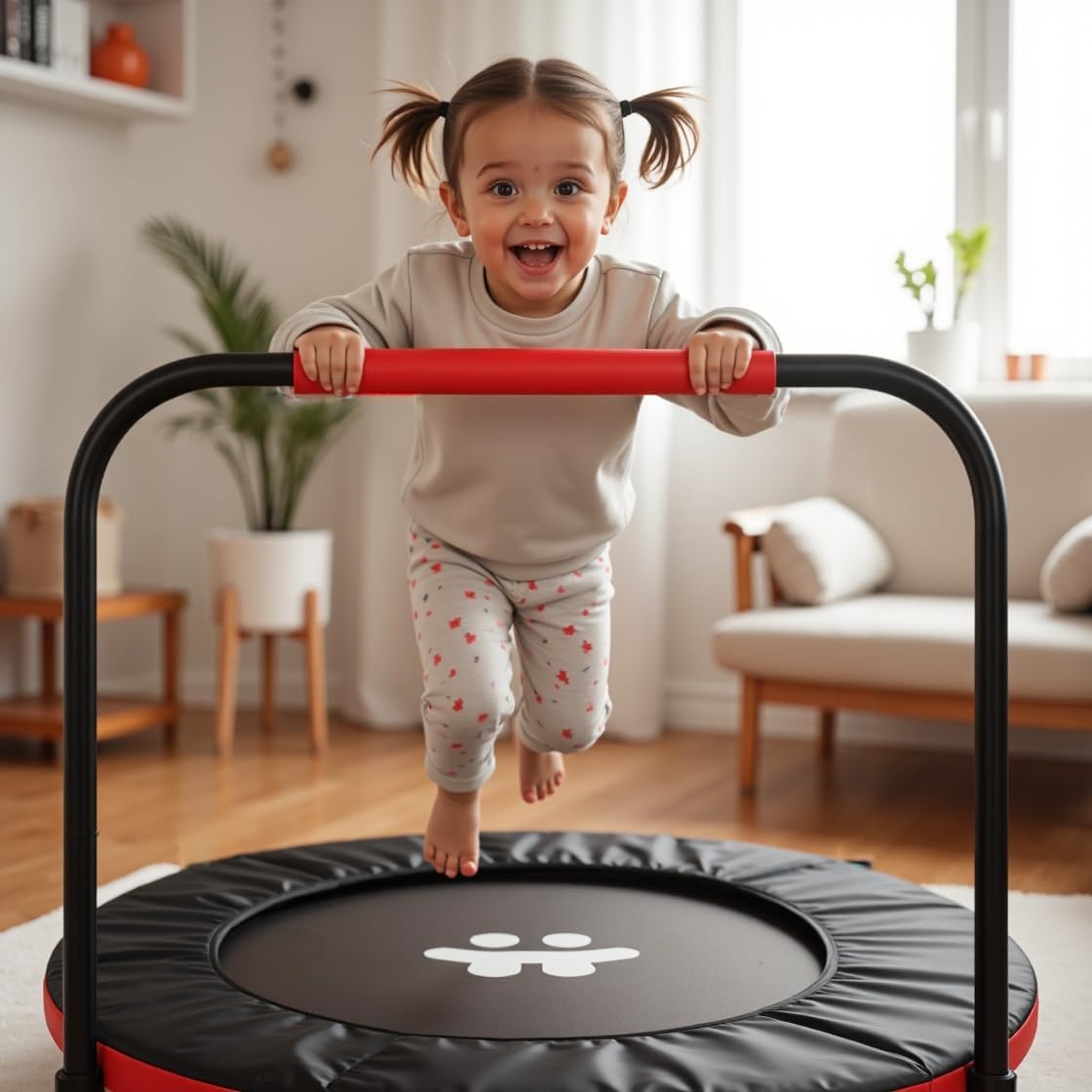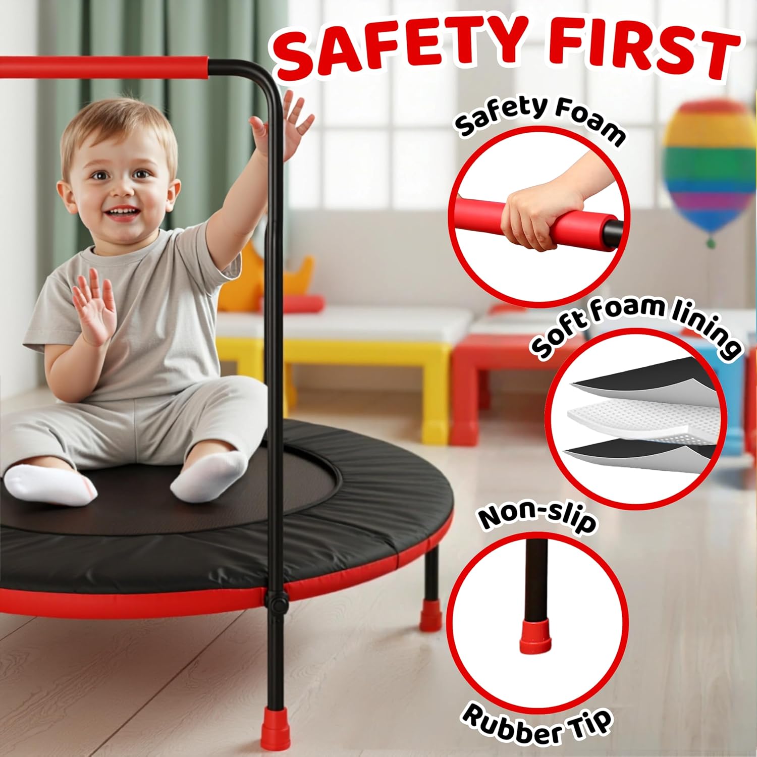 INCORAGGIA IL GIOCO ATTIVO: libera l'energia del tuo bambino con il nostro trampolino da interno per bambini Progettato per essere silenzioso, questo trampolino da interno per bambini è perfetto per offrire ore di gioco divertente e fantasioso. Sicurezza superiore: rendi speciale la giornata del tuo bambino con il trampolino perfetto per i più piccoli. Il nostro trampolino per bambini è costruito pensando alla sicurezza, con manubrio rimovibile e imbottitura a molla spessa 1,5 pollici, così puoi essere sicuro che tuo figlio sia al sicuro mentre gioca. Progettato per interni ed esterni: il nostro trampolino per bambini da interni è perfetto per tutte le condizioni atmosferiche. Questo trampolino per bambini piccoli intratterrà i tuoi piccoli in climi freddi e soleggiati. Regalo perfetto: ottimo regalo per bambini in età prescolare e bambini piccoli. Questo mini trampolino sarà il loro regalo preferito per le vacanze o i compleanni. I genitori lo adorano è silenzioso e i bambini adorano sfidare la gravità Montaggio semplice: il montaggio e lo stoccaggio sono un gioco da ragazzi con il nostro trampolino per bambini da interni. Basta rimuovere il manubrio e riporlo in posizione verticale in un armadio o sotto il letto. Con questo trampolino per bambini puoi goderti ore di gioco attivo, al chiuso o all'aperto. Siamo orgogliosi di ciò che facciamo e abbiamo realizzato i nostri prodotti pensando alla sicurezza e alla qualità problema con il prodotto, non esitate a contattarci e faremo la scelta giusta per voi. Ordina ora e guarda il viso di tuo figlio illuminarsi di gioia