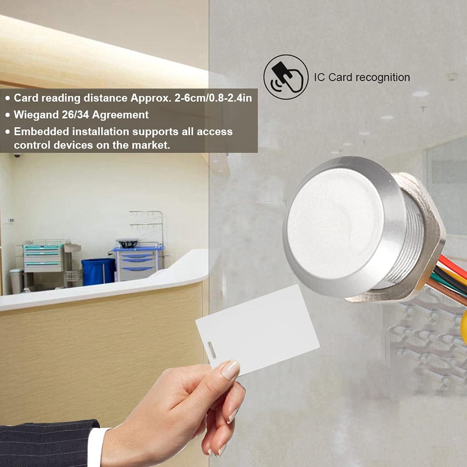 [Construction compatta] Mini corpo con installazione integrata, compatibile con tutti i dispositivi di controllo dell'accesso di mercato. [Impermeabile e durevole] realizzato in plastica ABS, corrosione e resistenza elastica, con una colla più bassa per il fuoco impermeabile e contrastante. [Opzioni a doppia frequenza] È possibile leggere le carte ID 125 KHz o IC 13,56 MHz, garantendo la versatilità di diverse esigenze di controllo degli accessi. [Facile installare] Cablaggio semplice con indicazioni di colore chiaro, adatti a diversi ambienti con una vasta gamma di temperature operative. [Molto sensibile] La distanza di lettura della scheda 2-6 cm garantisce un controllo di accesso rapido e affidabile, che supporta l'interfaccia Wiegand 26/34.