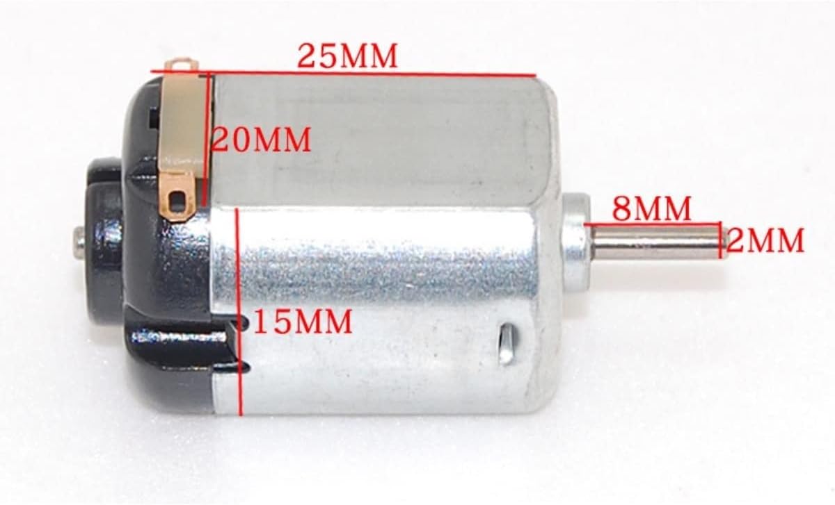 Operating voltage: DC 3V; Rated voltage: DC 3V; Shaft size: 8 x 2mm; Color:silver + black Size: length 30MM height 20MM thickness 15MM This is a DC Small Motor Speed: 24000/min Miniature DC motor is small in size and light in weight.