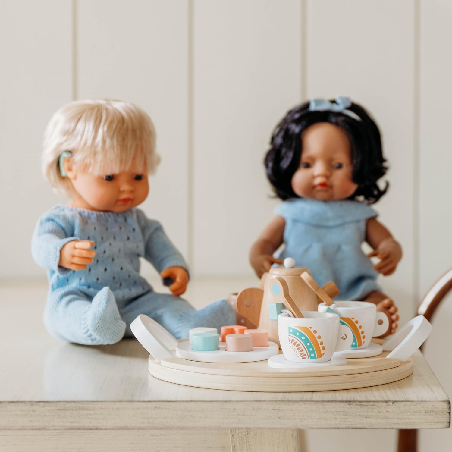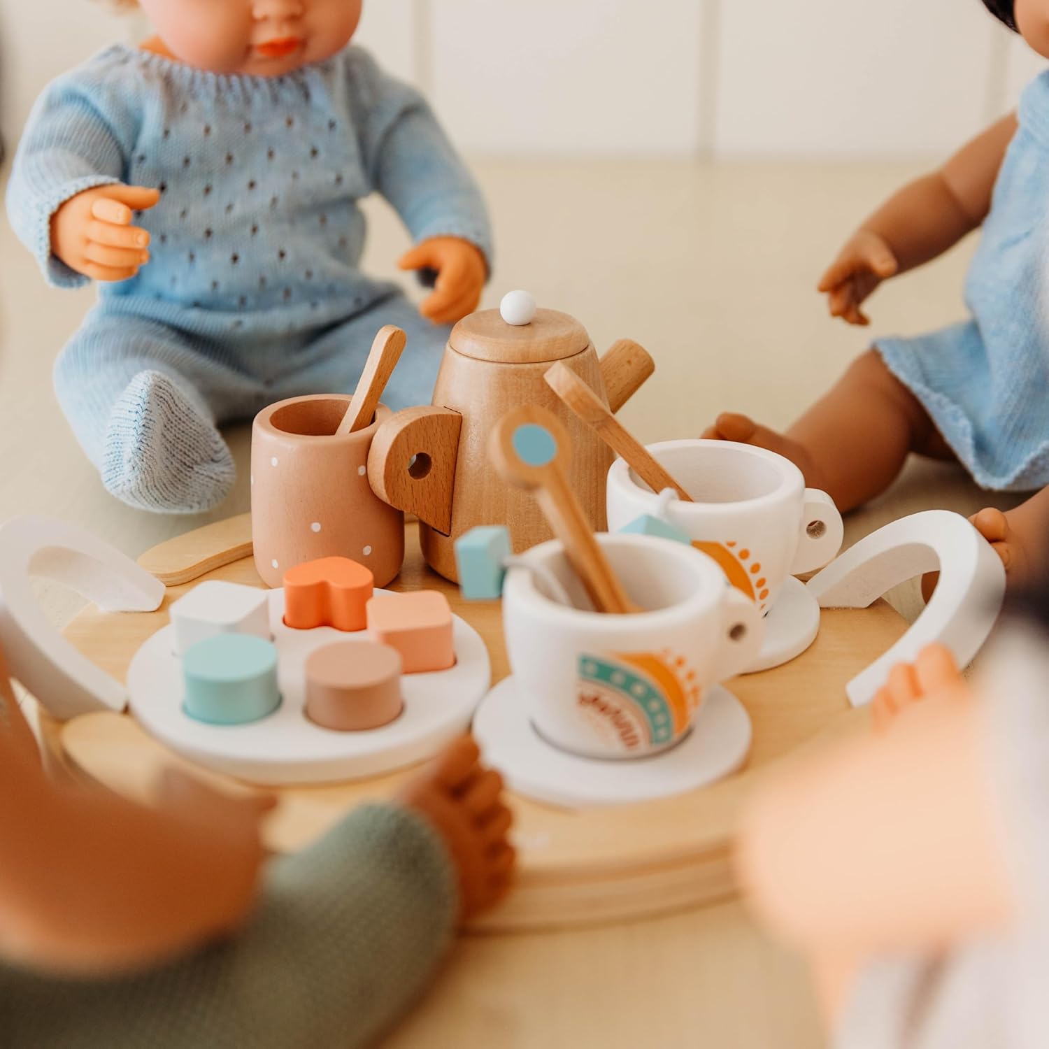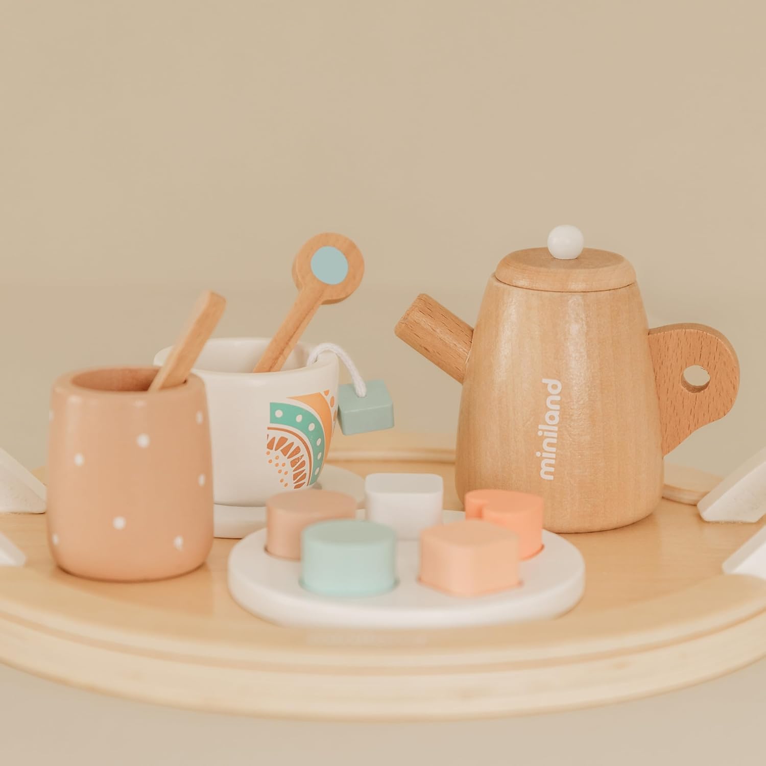 Set da tè in legno Miniland Dolls. Borsa in stoffa con 1 vassoio, 1 teiera, 1 zuccheriera, 1 cucchiaino di zucchero, 2 piatti, 5 torte, 1 piatto torta, 2 bustine di tè, 2 cucchiai e 2 tazze. Realizzato in legno proveniente da foreste gestite in modo sostenibile. Ideale per espandere il gioco con le bambole Miniland.