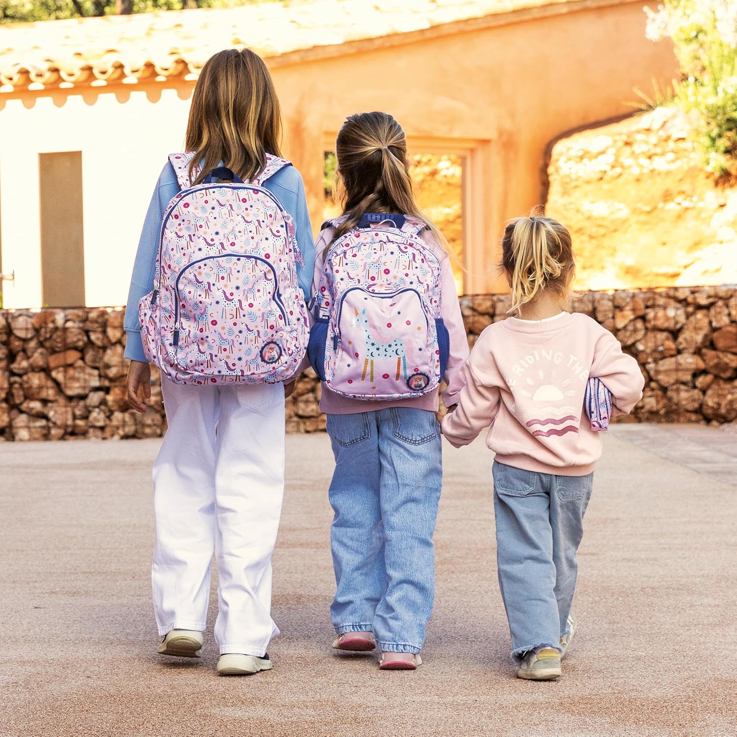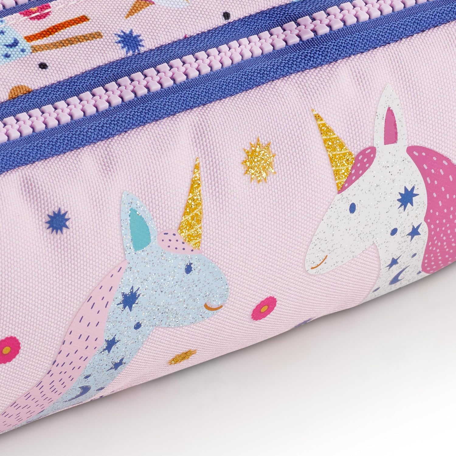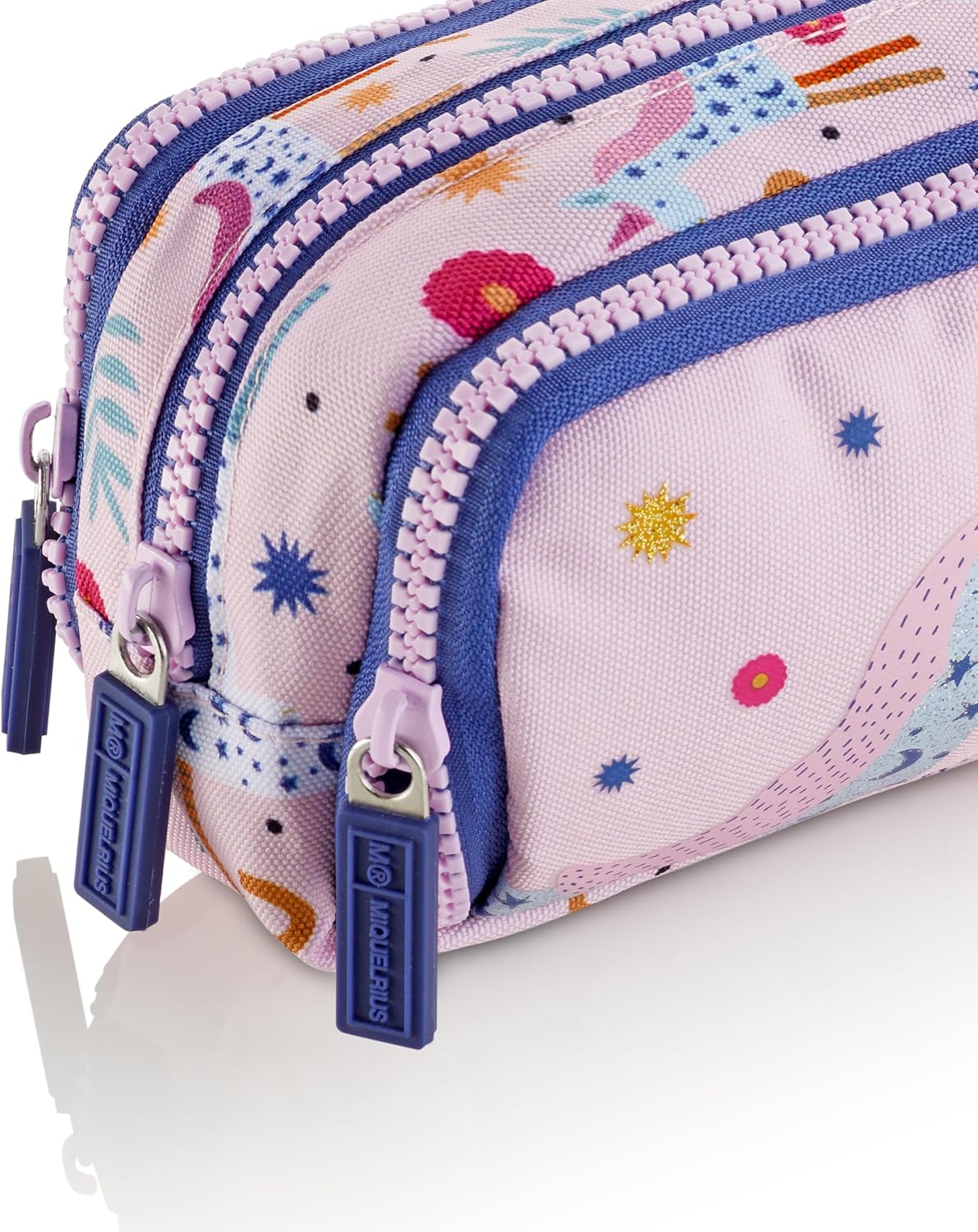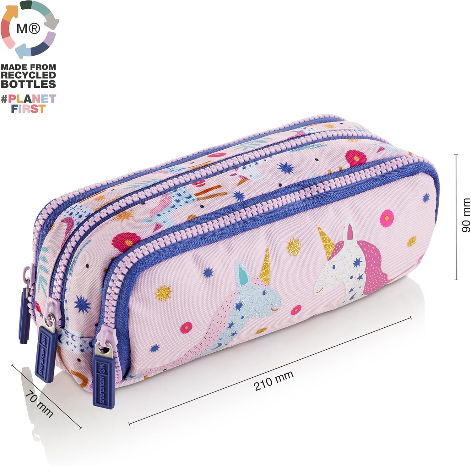 Astuccio triplo organizer Miquelrius con unicorni Ha tre scomparti indipendenti con chiusura a cerniera per facilitare l'organizzazione del materiale scolastico. Realizzato in RPET (poliestere riciclato) e decorato con dettagli scintillanti glitterati. Un astuccio funzionale e adorabile per accompagnare la routine scolastica con magia.