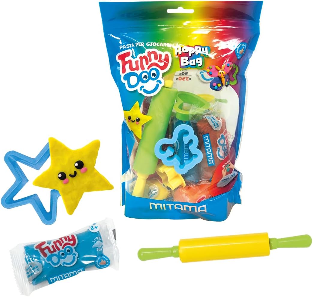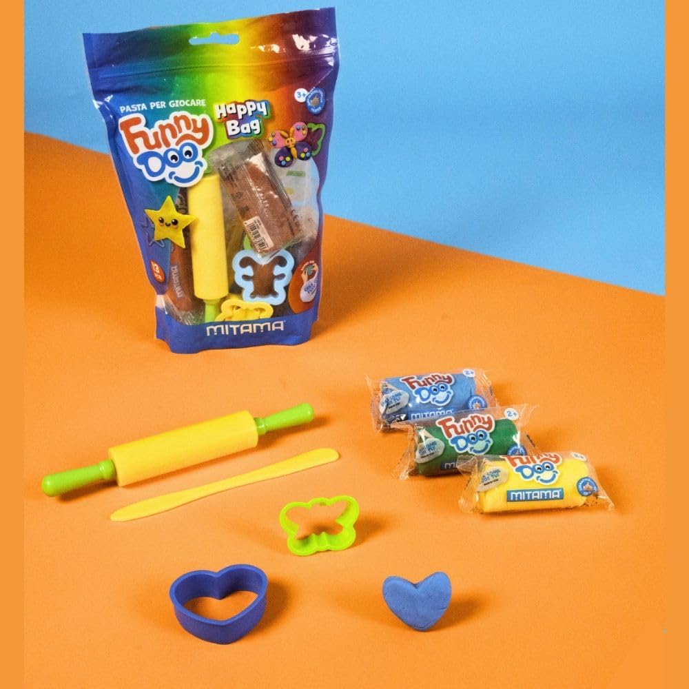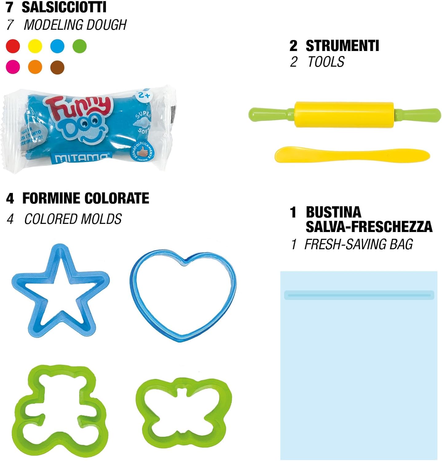 Dimensioni: 20 cm (L) x 25,5 cm (H) CONTENUTO della confezione (14 pezzi): - 7 salsicciotti di Funny Doo colorati da 50 gr - 4 formine colorate (stella, cuore, farfalla, orsetto) - 1 mattarello -1 coltellino -1 bustina salva-freschezza FASCIA DI ETA': 3+