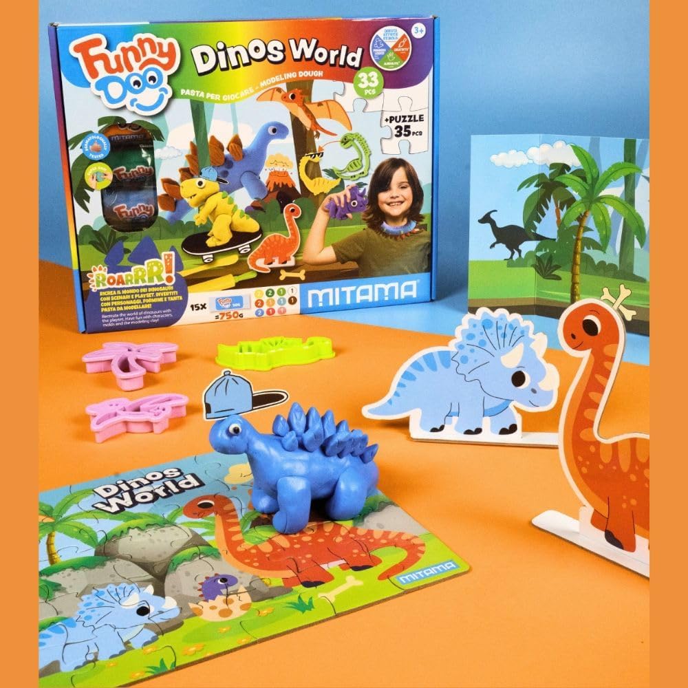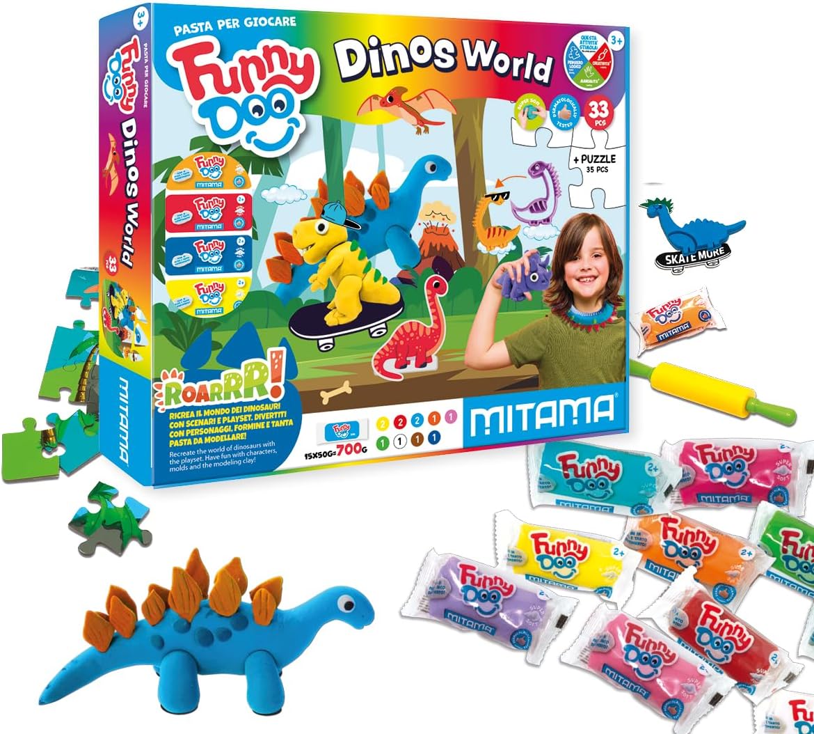 Dimensioni: 35 cm (L) x 28 cm (H) x 5,5 cm (P) CONTENUTO della confezione (33 pezzi): - 15 salsicciotti di Funny Doo colorati da 50 gr - 6 formine colorate - 3 formine cartonate - 2 strumenti per giocare e creare (1 mattarello, 1 coltellino) - 1 foglio di stickers - 1 foglio di accessori cartonati - 1 tovaglietta 60 x40 cm - 2 fondi playset - 1 puzzle da 21 x 29,7 cm (35 pezzi) - 1 guida colore, per mixare i colori FASCIA DI ETA': 3+